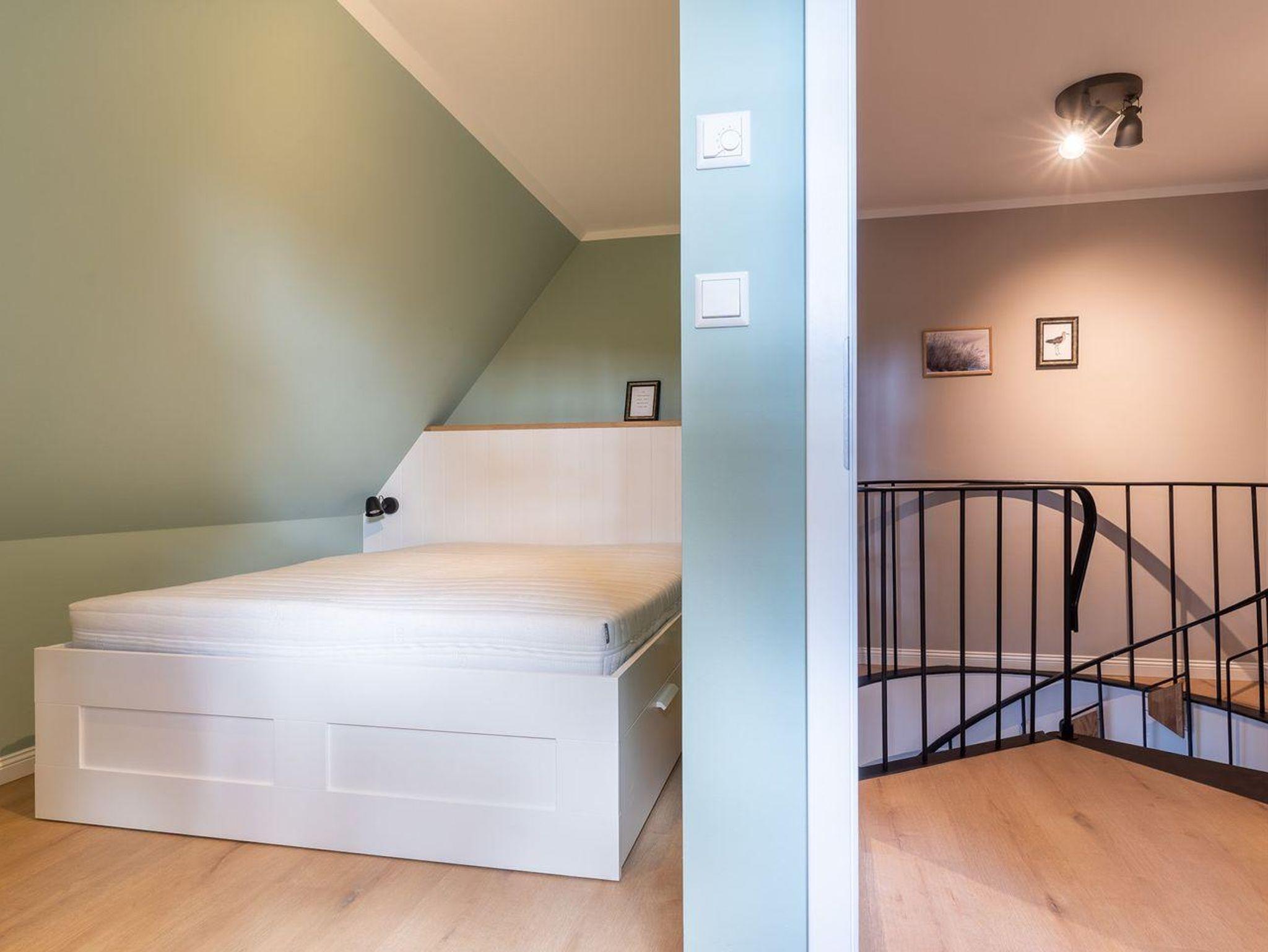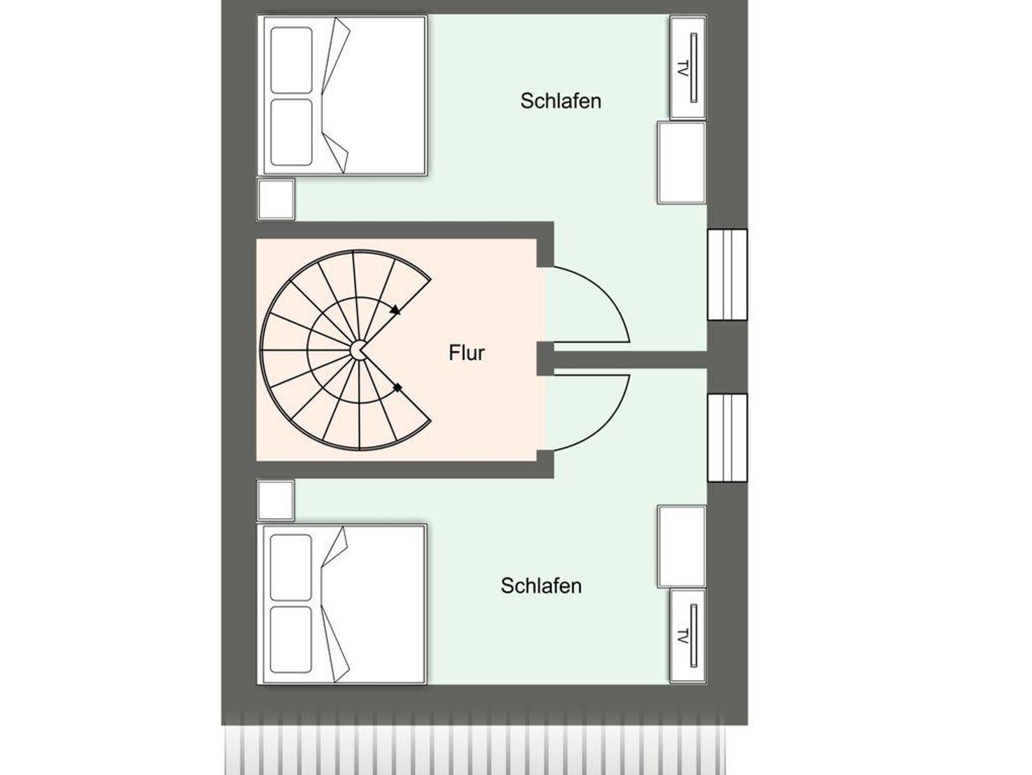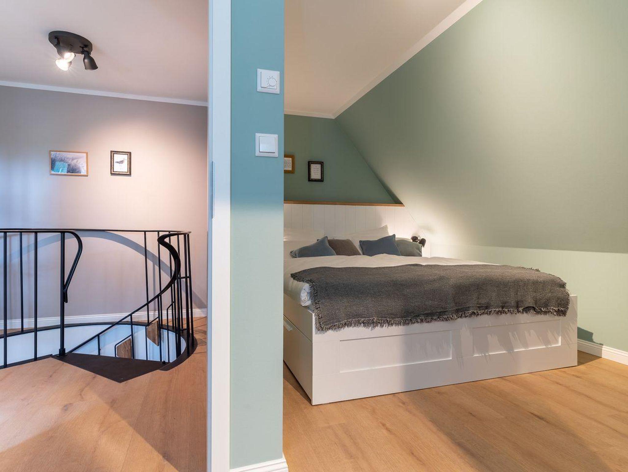 Über eine Wendeltreppe aus dem Wohnraum gelangt man in das Obergeschoss. Hier befinden sich zwei gemütliche Schlafzimmer mit je einem Doppelbett.