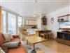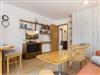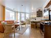 Wohnzimmer mit ausklappbarem (Schlaf-) Sofa (140x200cm), 2 Sesseln, Esstisch für 3-4 Personen, TV (Kabel), DVD-Player und Stereo-Anlage. Direkter Zugang zum möblierten Eck-Balkon nach Westen. Offene Küche mit Mikrowelle mit Backfuntion, Kühlschrank mit Gefrierfach und Geschirrspüler.