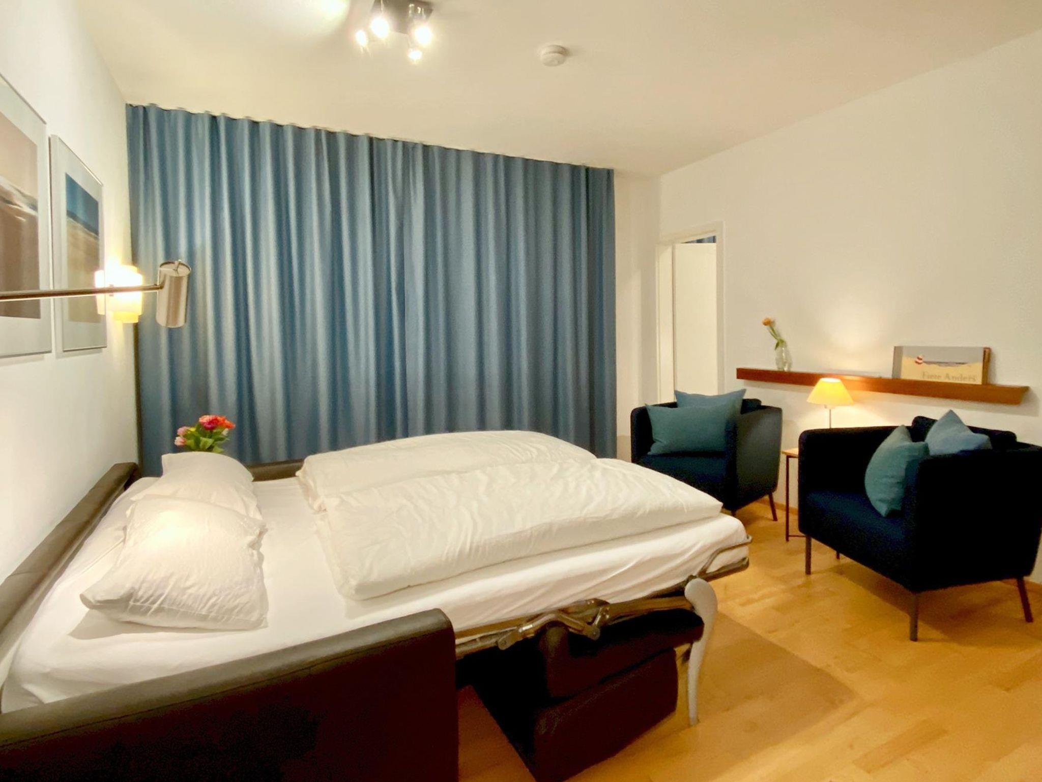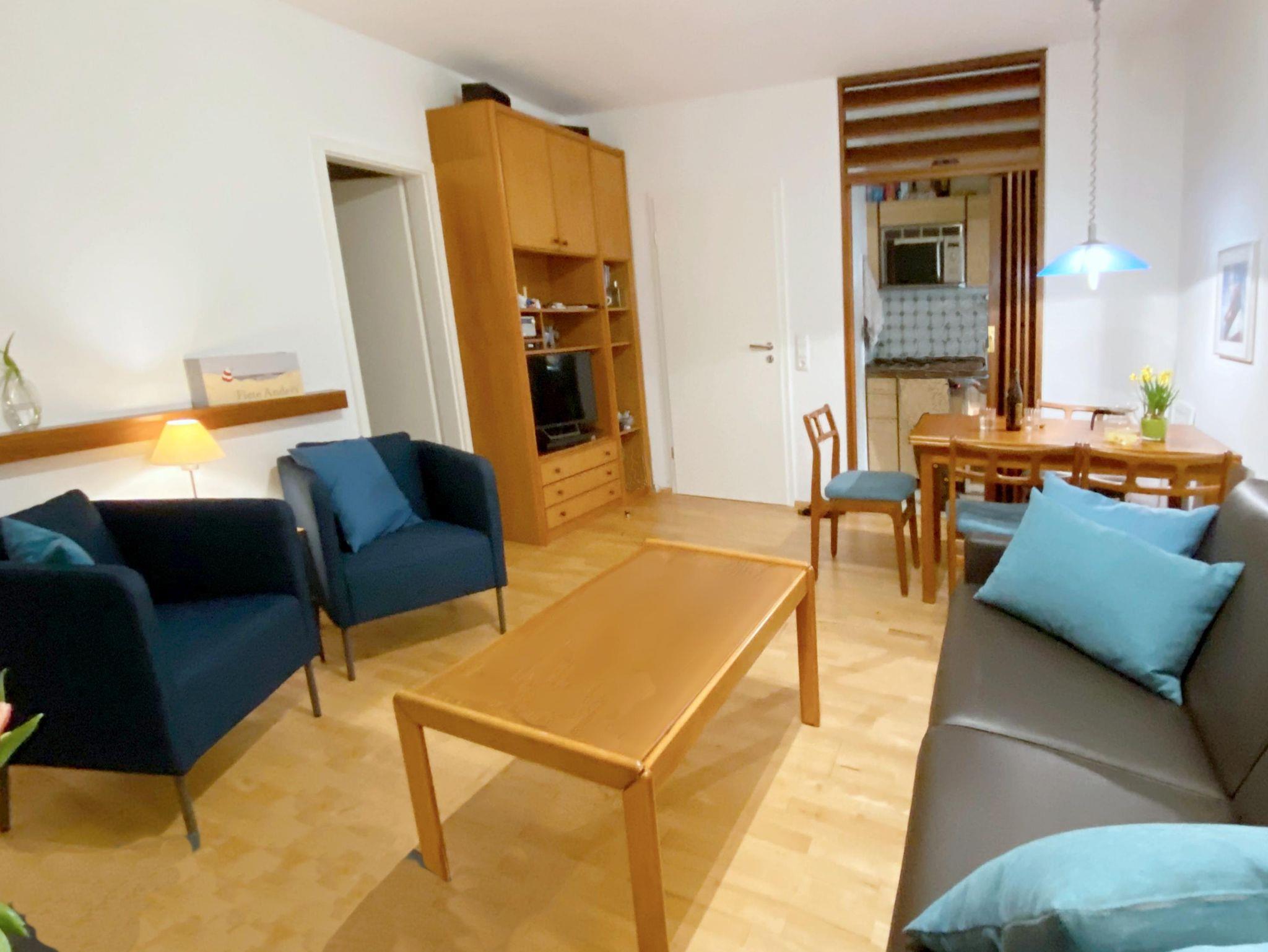 Wohnzimmer: Couch, Couchtisch, 2 Sessel, Beistelltisch, Schrankdoppelbett, Schrank, Kabel-TV, Stereoanlage mit CD-Player, Telefon, Tischlampe, Esstisch, 4 Stühle