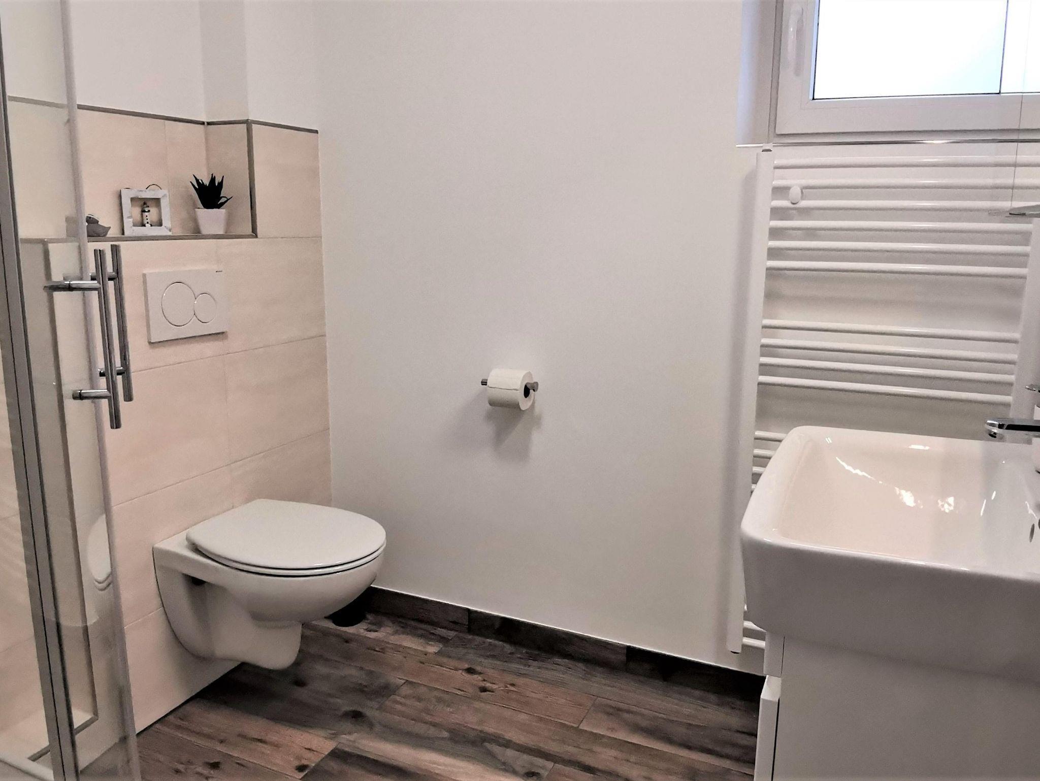 Ein modernes Duschbad von 2022 mit Fenster, Waschtisch und Spiegelschrank; ausreichend Platz für die Familie.