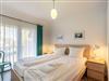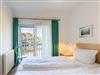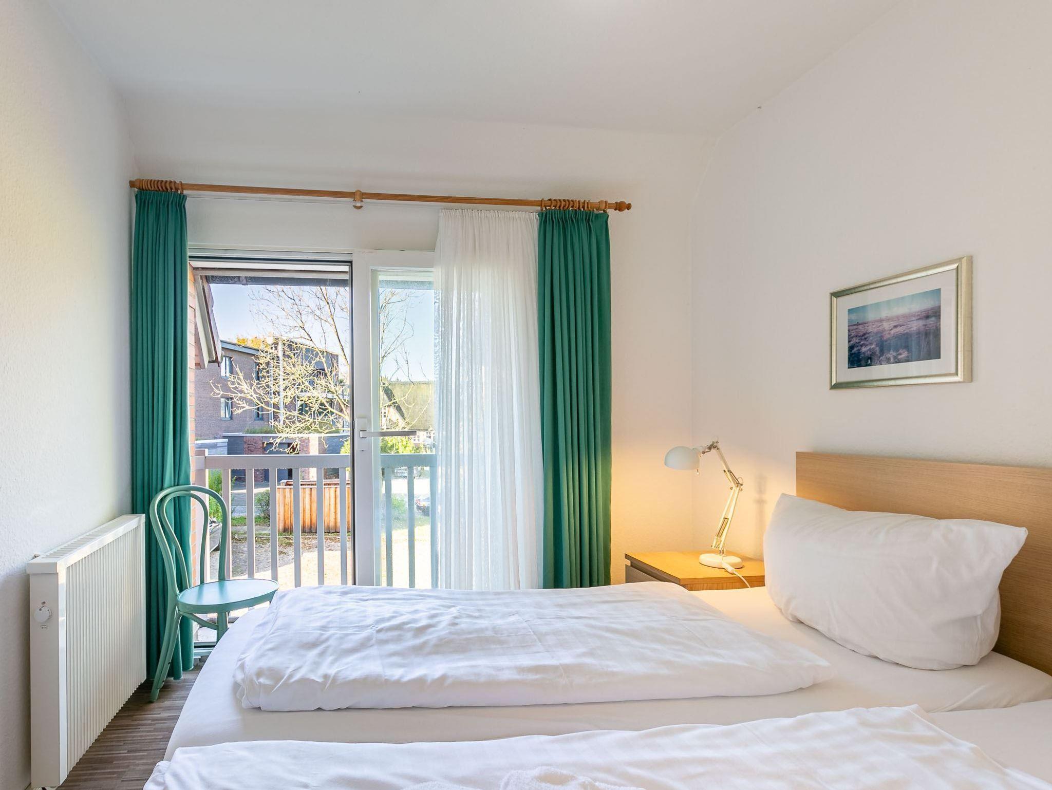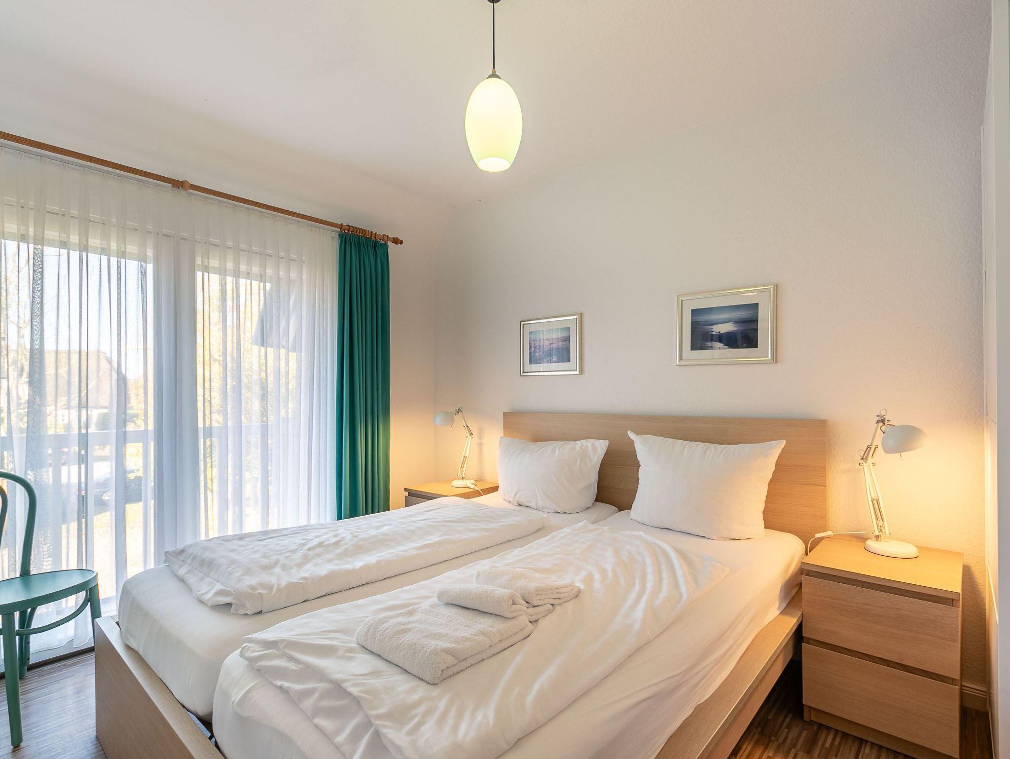 Schlafzimmer mit Doppelbett (2x 80x200cm), Kleiderschrank, Stuhl und französischem Balkon nach Westen.