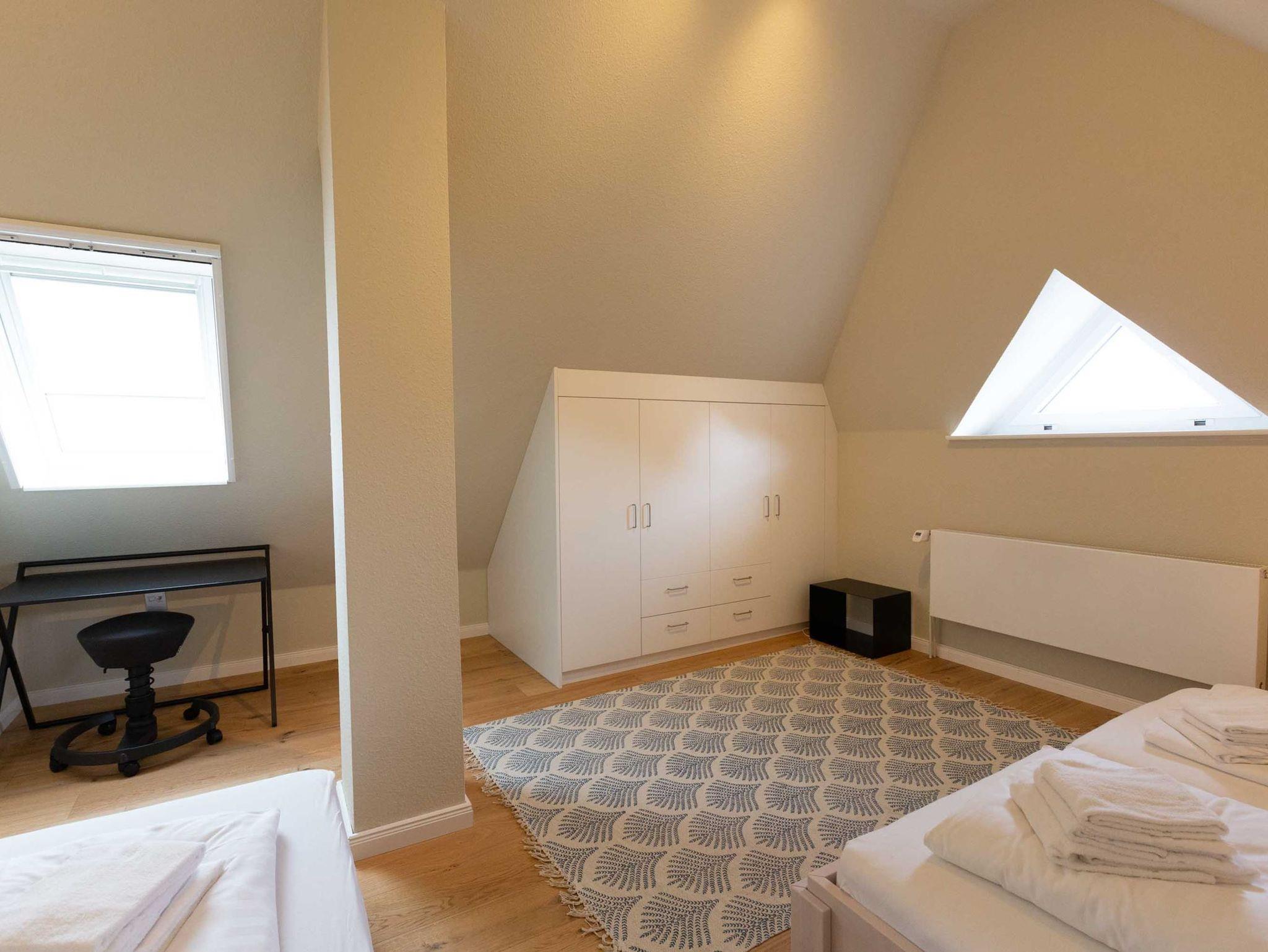 2. Schlafzimmer mit 2 Einzelbetten (je 90x200cm), (Schlaf-) Sofa (90x200cm), Einbauschrank, SMART-TV (nur Streaming) und Schreibtisch.