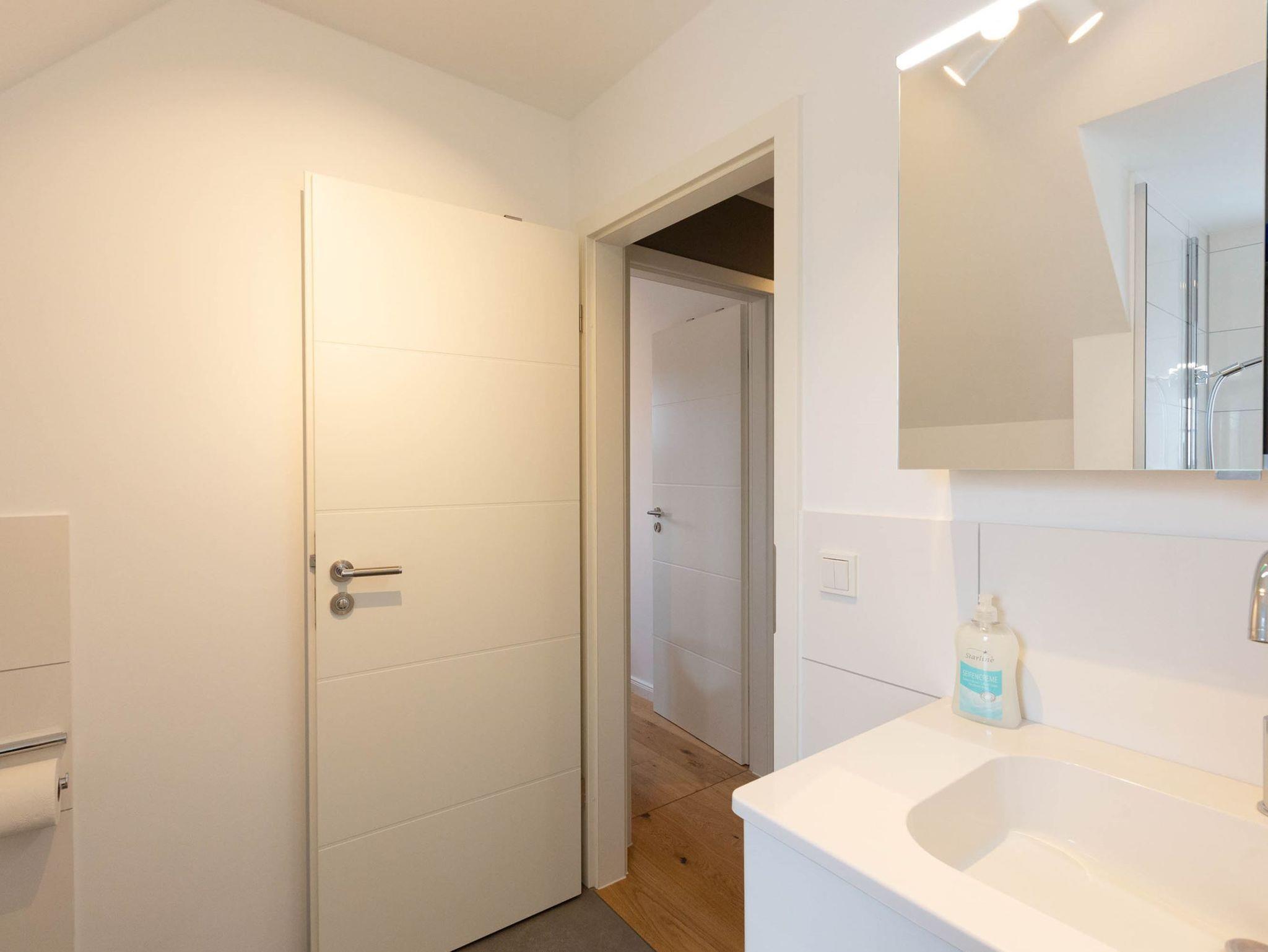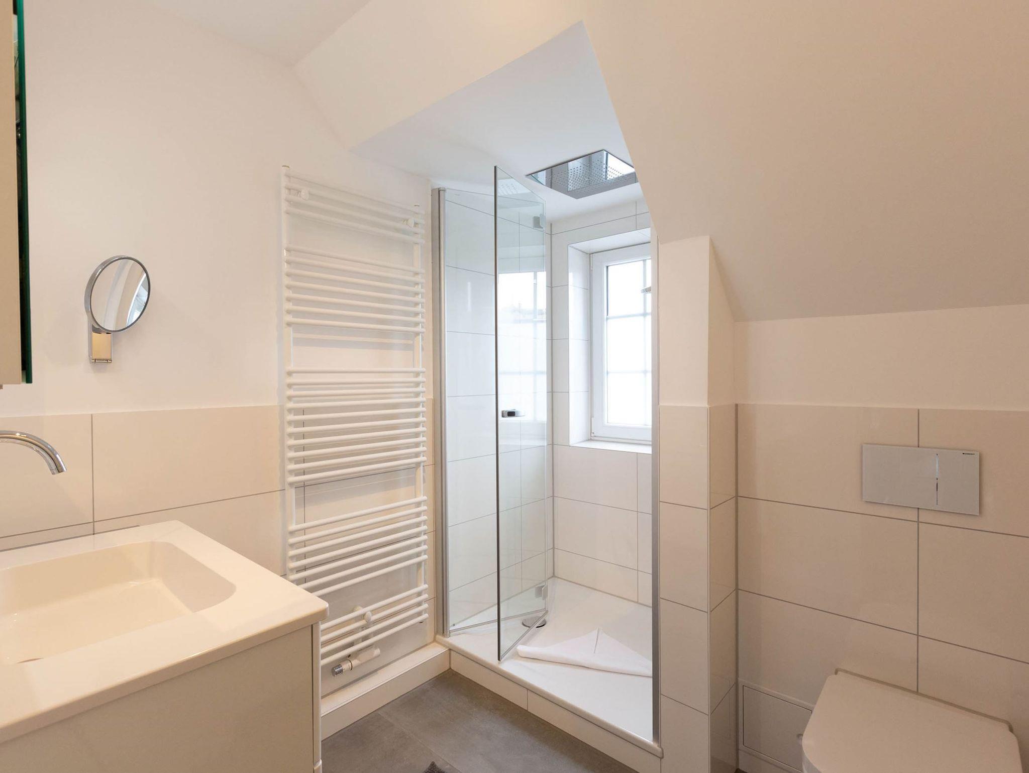 Badezimmer (Duschbad) mit Regendusche, WC, Handtuchwärmer, Tageslicht und Föhn.