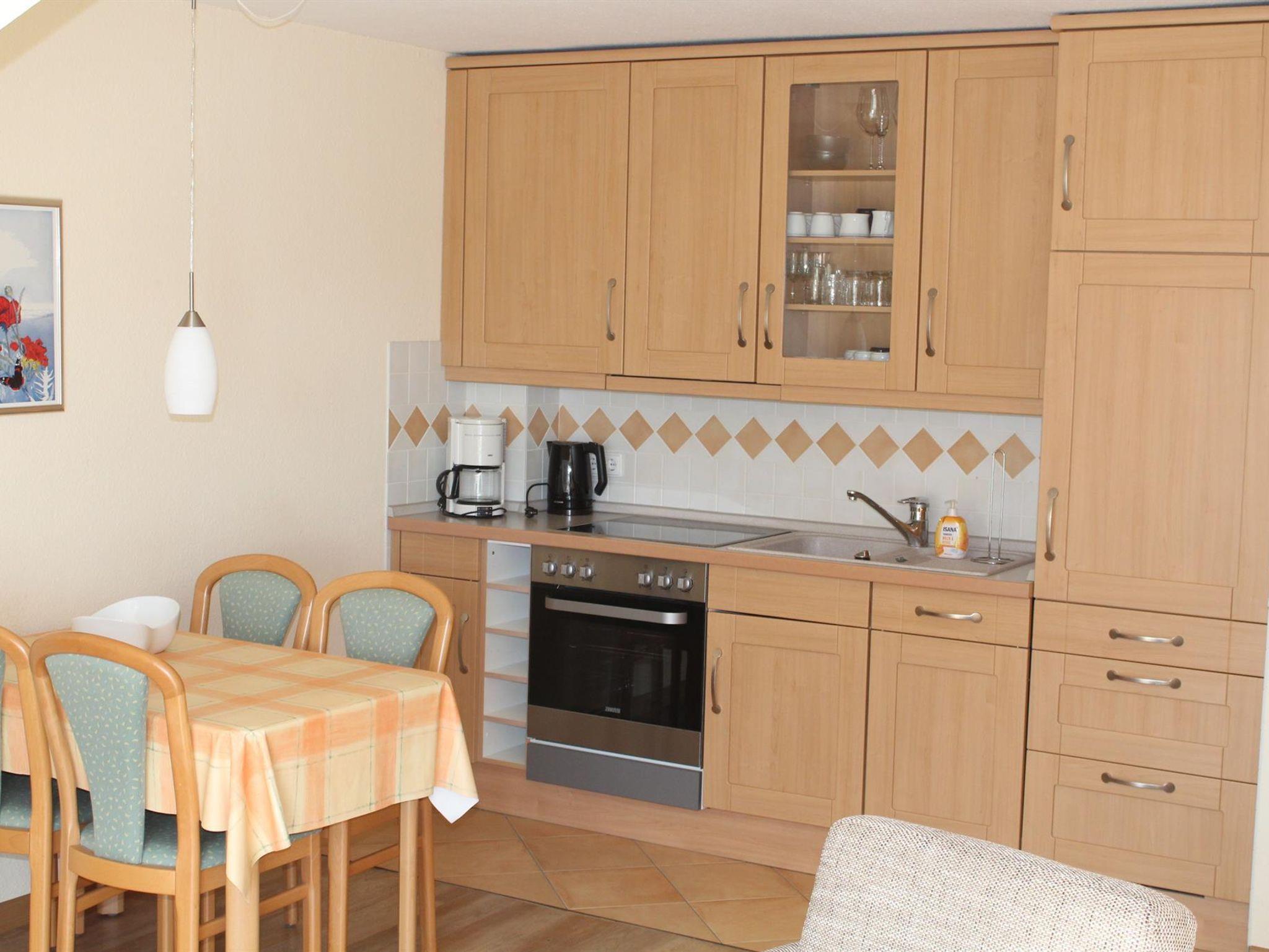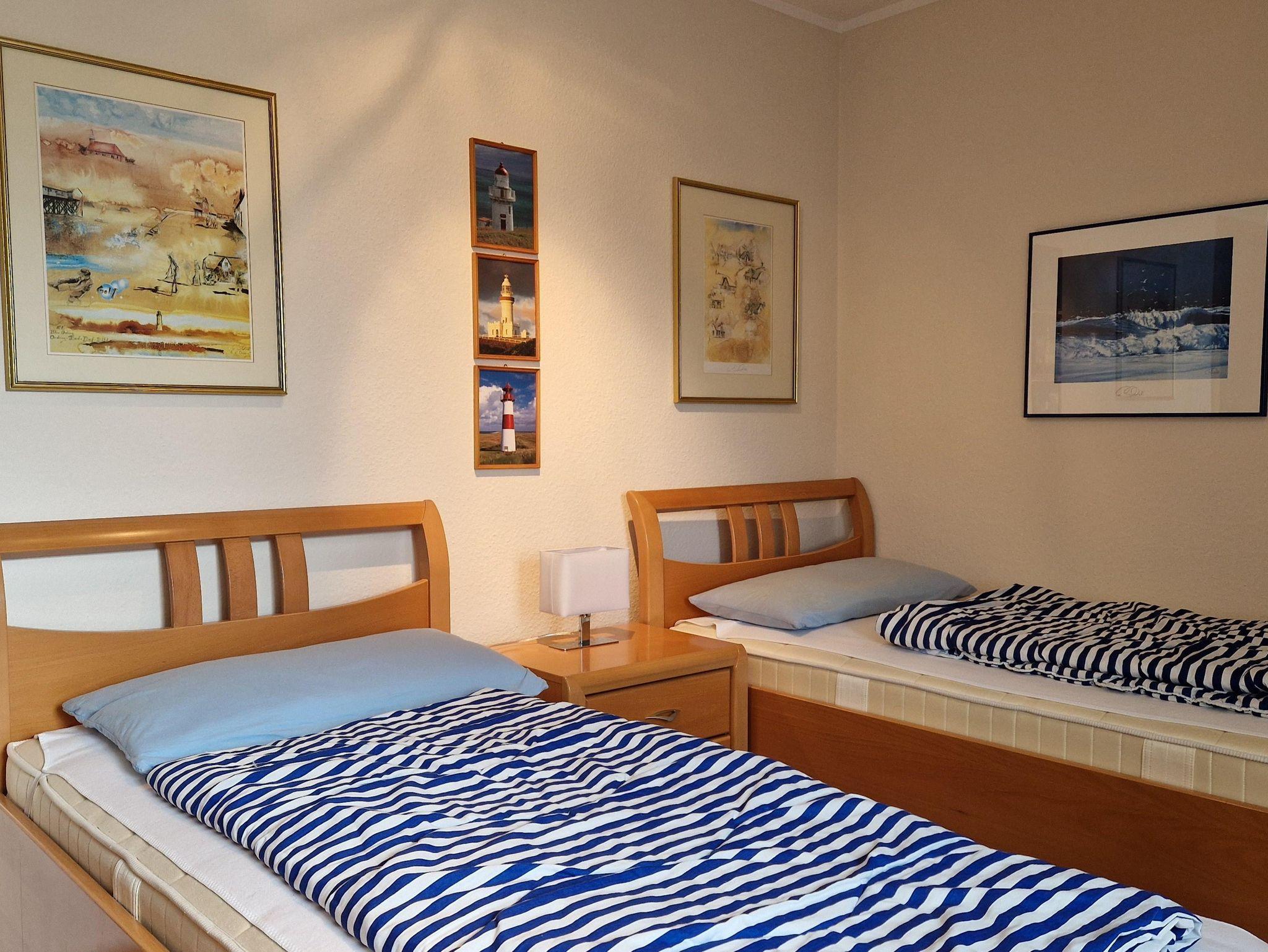 3-Zimmer-Appartement im Ober- und Dachgeschoss, 56 qm: Flur. Duschbad/WC. Schlafraum mit 2 Einzelbetten. Wohnraum mit Sitzecke, Eßecke, LCD-TV, Radio, Stereoanlage. Küchenzeile (4-Pl.-Herd, Ceran, Backofen, Geschirrspüler. Möbl. Südwestbalkon. Im Dachgeschoss Schlafraum mit Doppelbett, Einbauschrank, gemütlicher Leseecke.