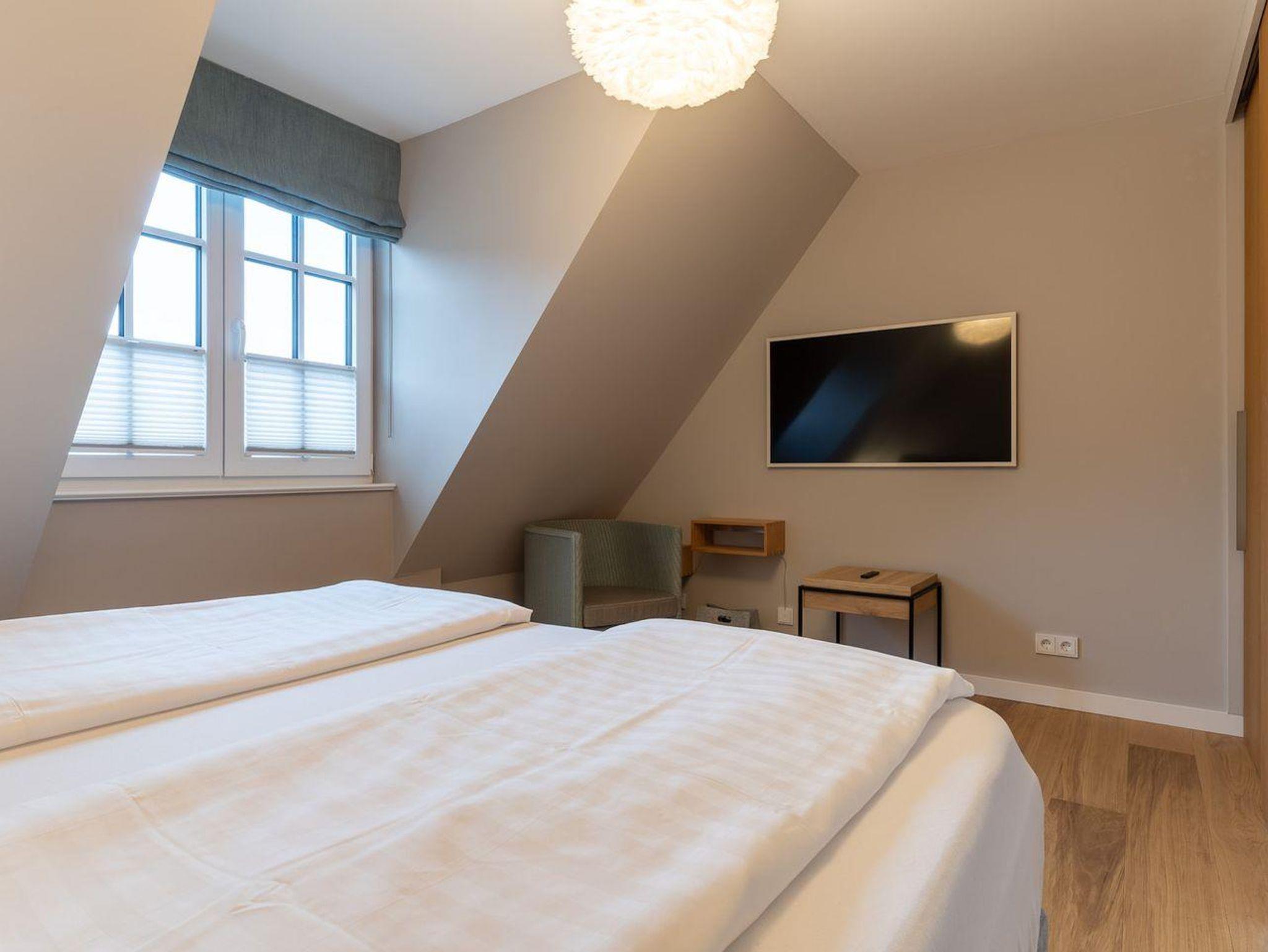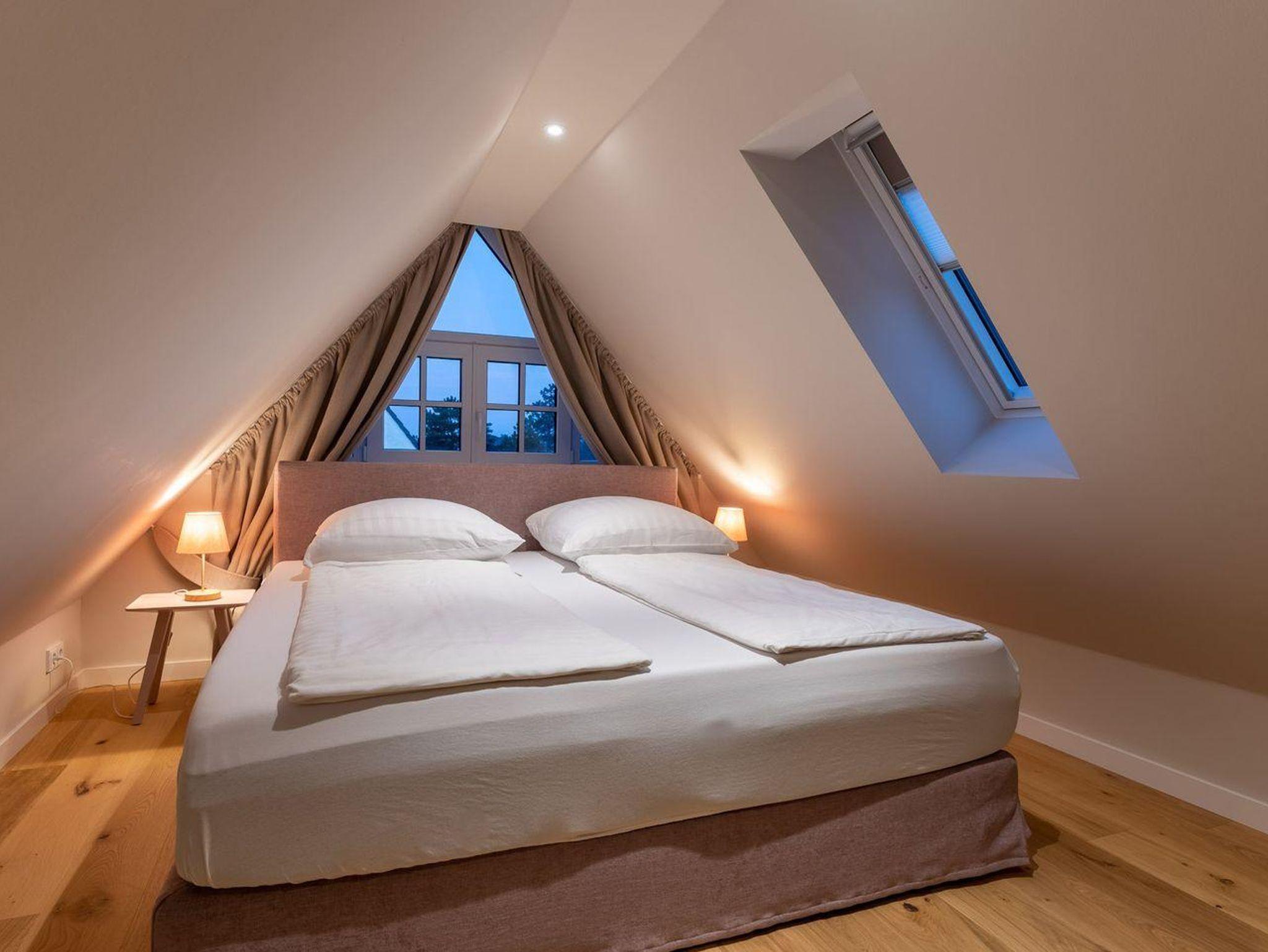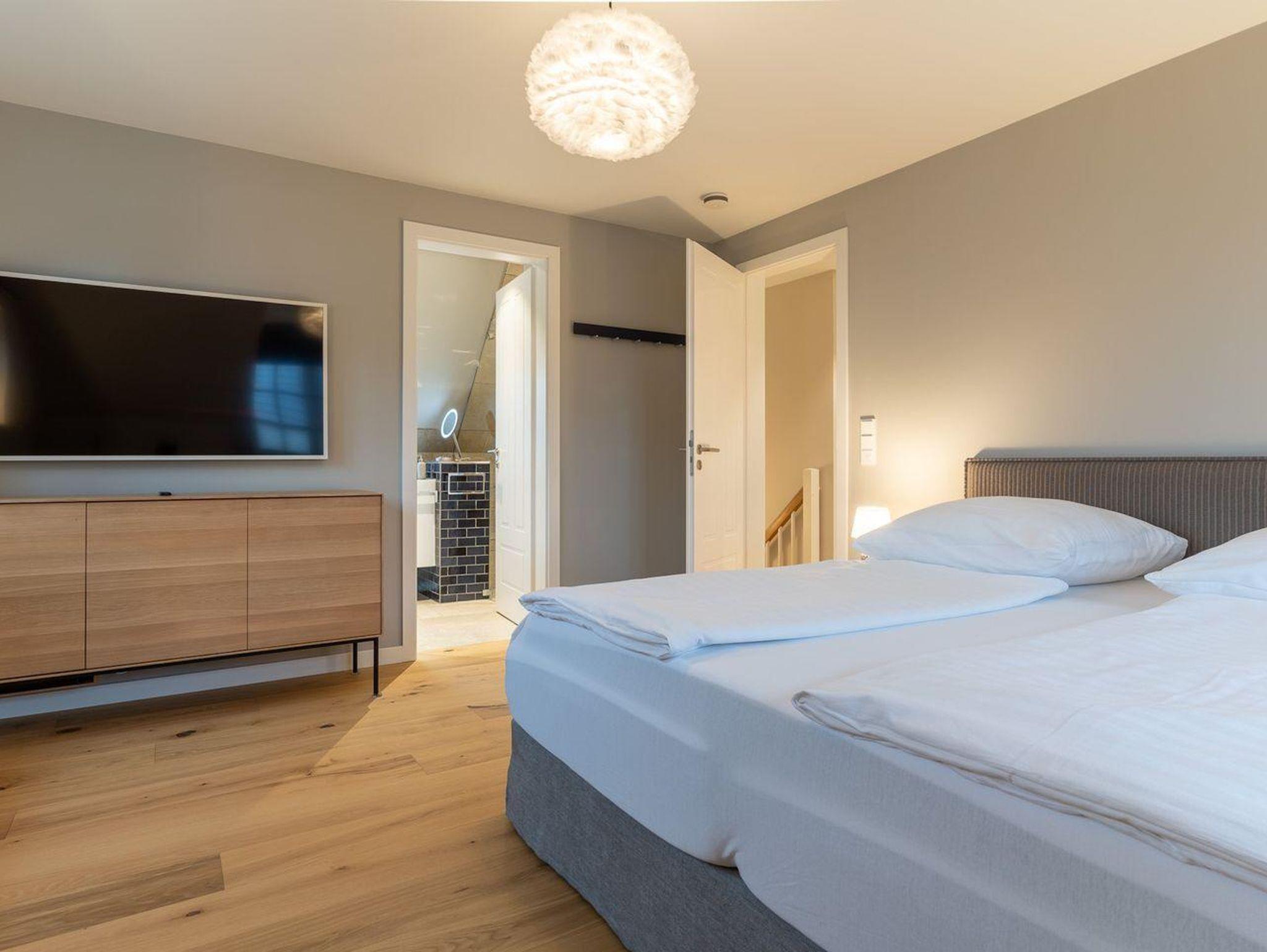 Über eine Holztreppe gelangt man in das Obergeschoss. Die beiden Schlafräume verfügen über komfortable Doppelbetten und Kleiderschränke gewähren Ihnen hinreichend Ablageflächen. Ein Doppelschlafzimmer verfügt über ein eigenes Duschbad.