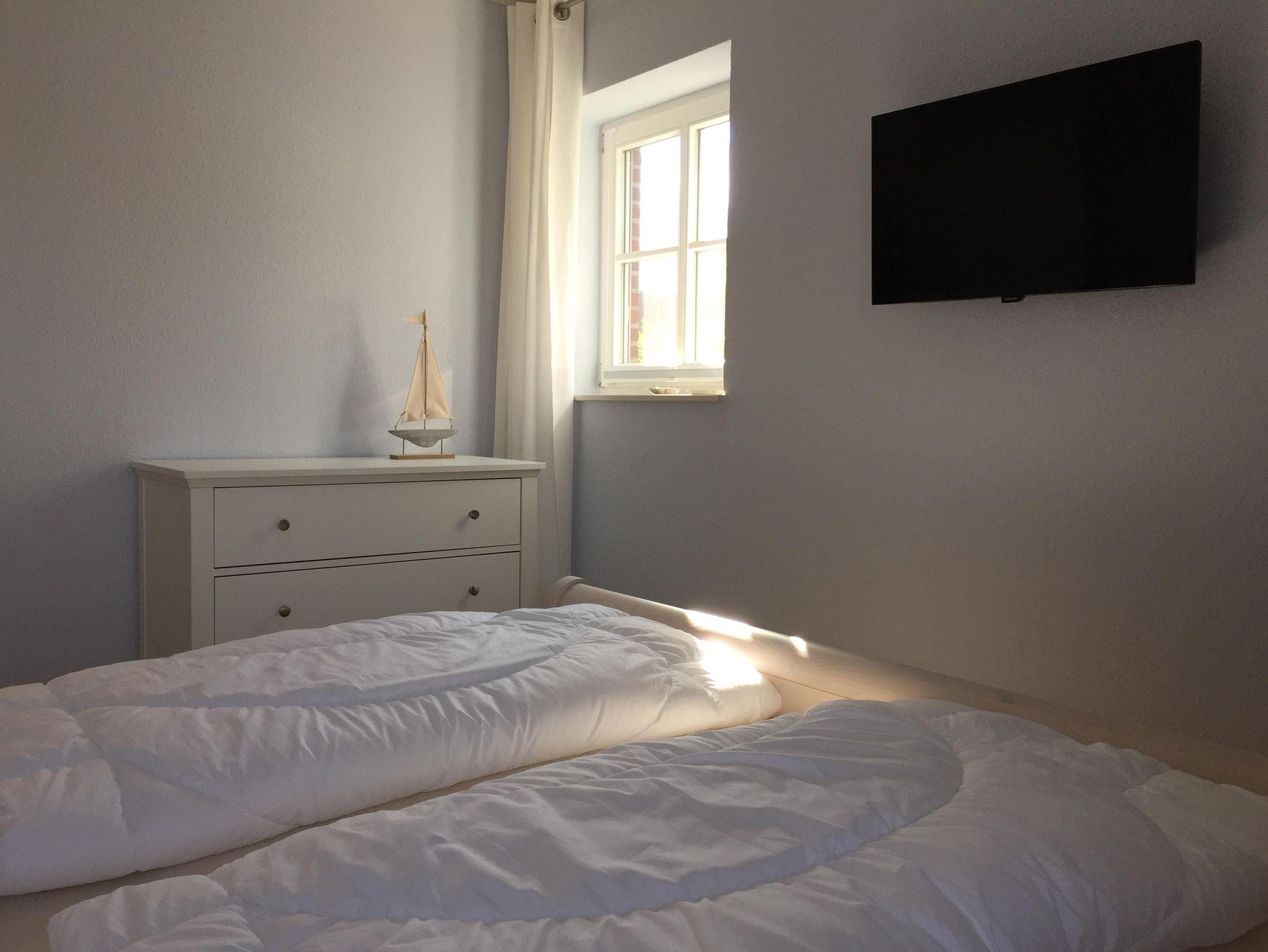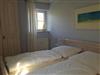 Kuscheliges Schlafzimmer: maritime Farben, Doppelbett (180 x 200 m) FlachbildTV, Verdunkelungsplissees, sehr hochwertigen und extrahohen Matratzen mit verstellbaren Lattenrosten an Kopf- und Fußteil