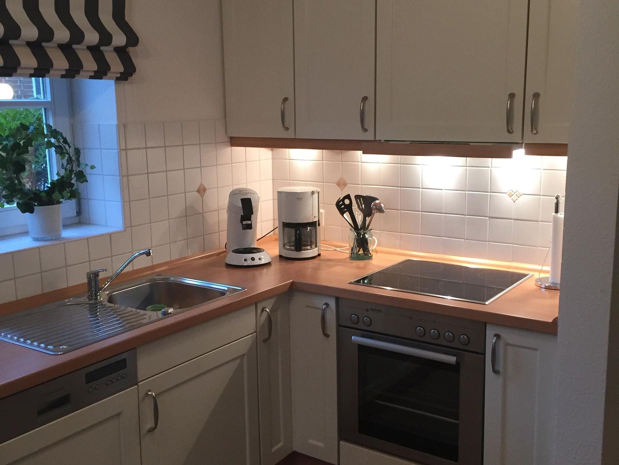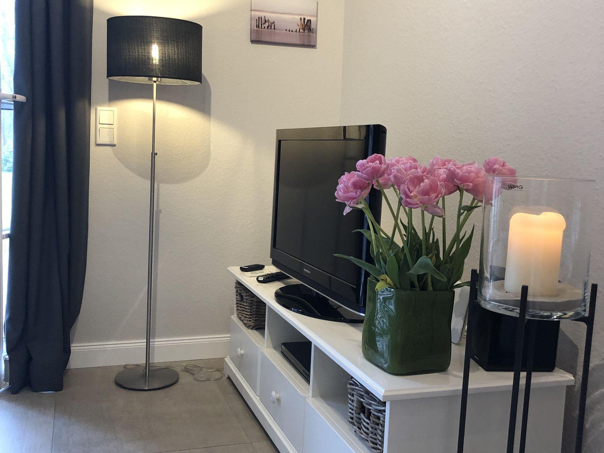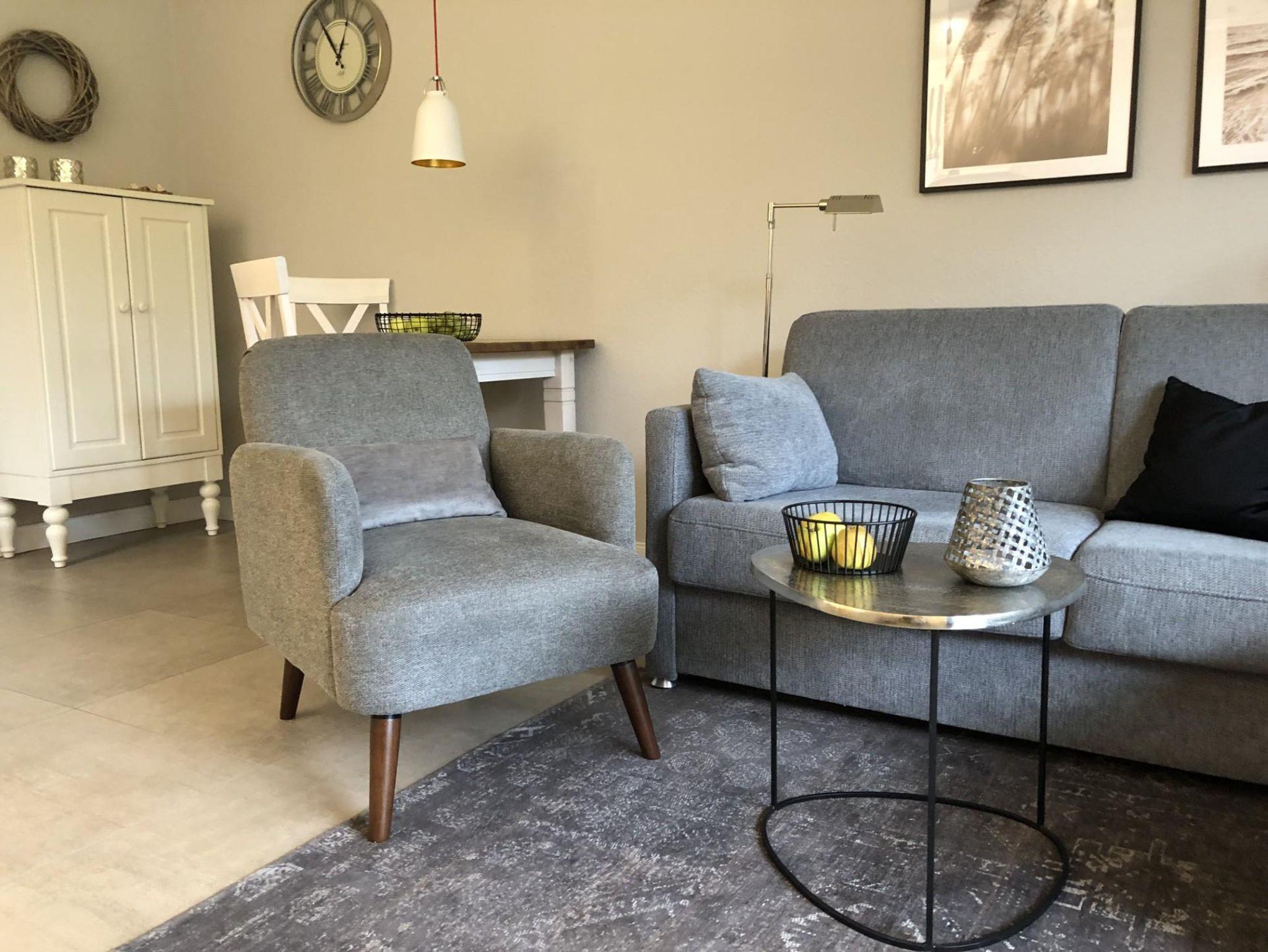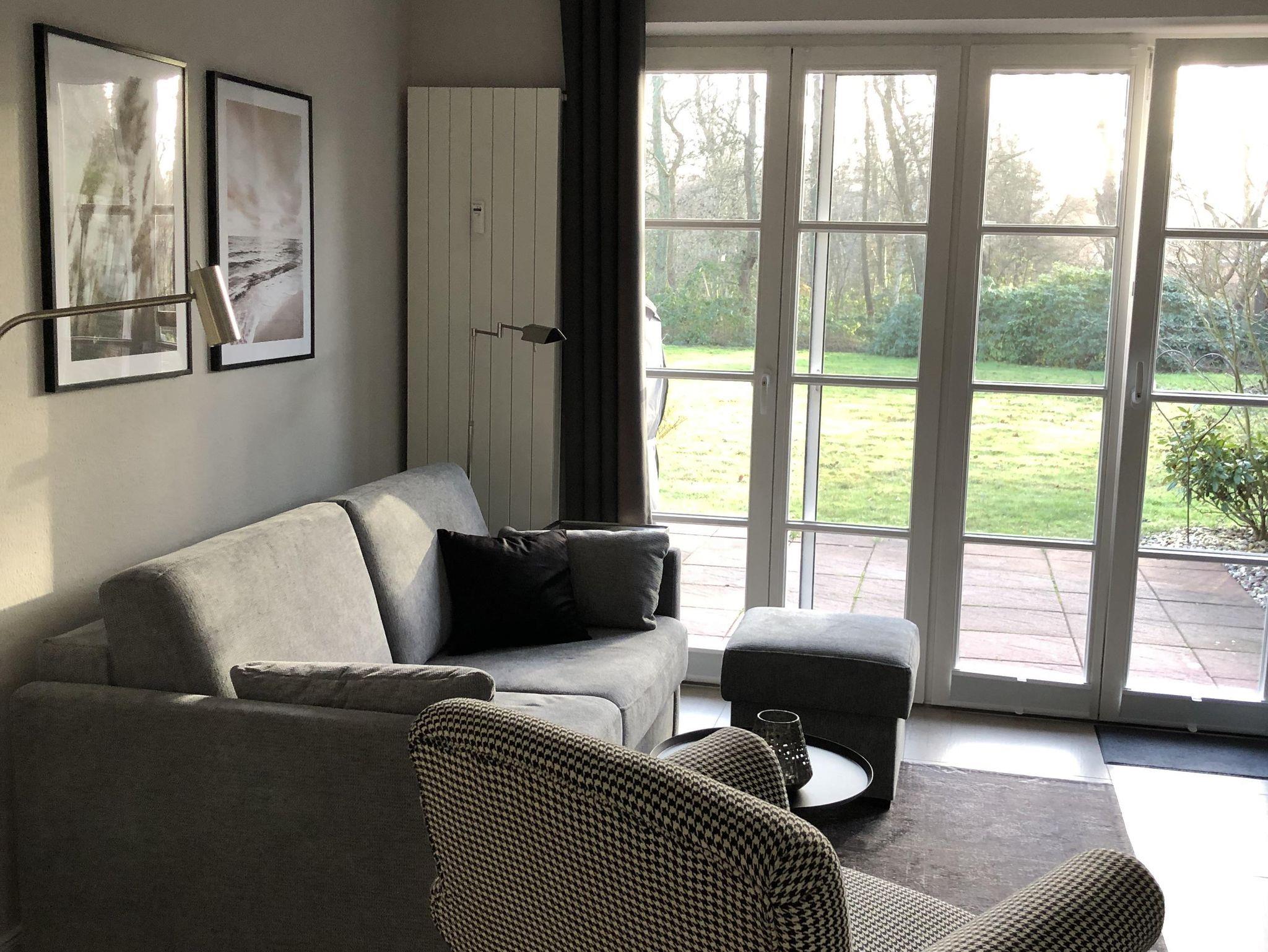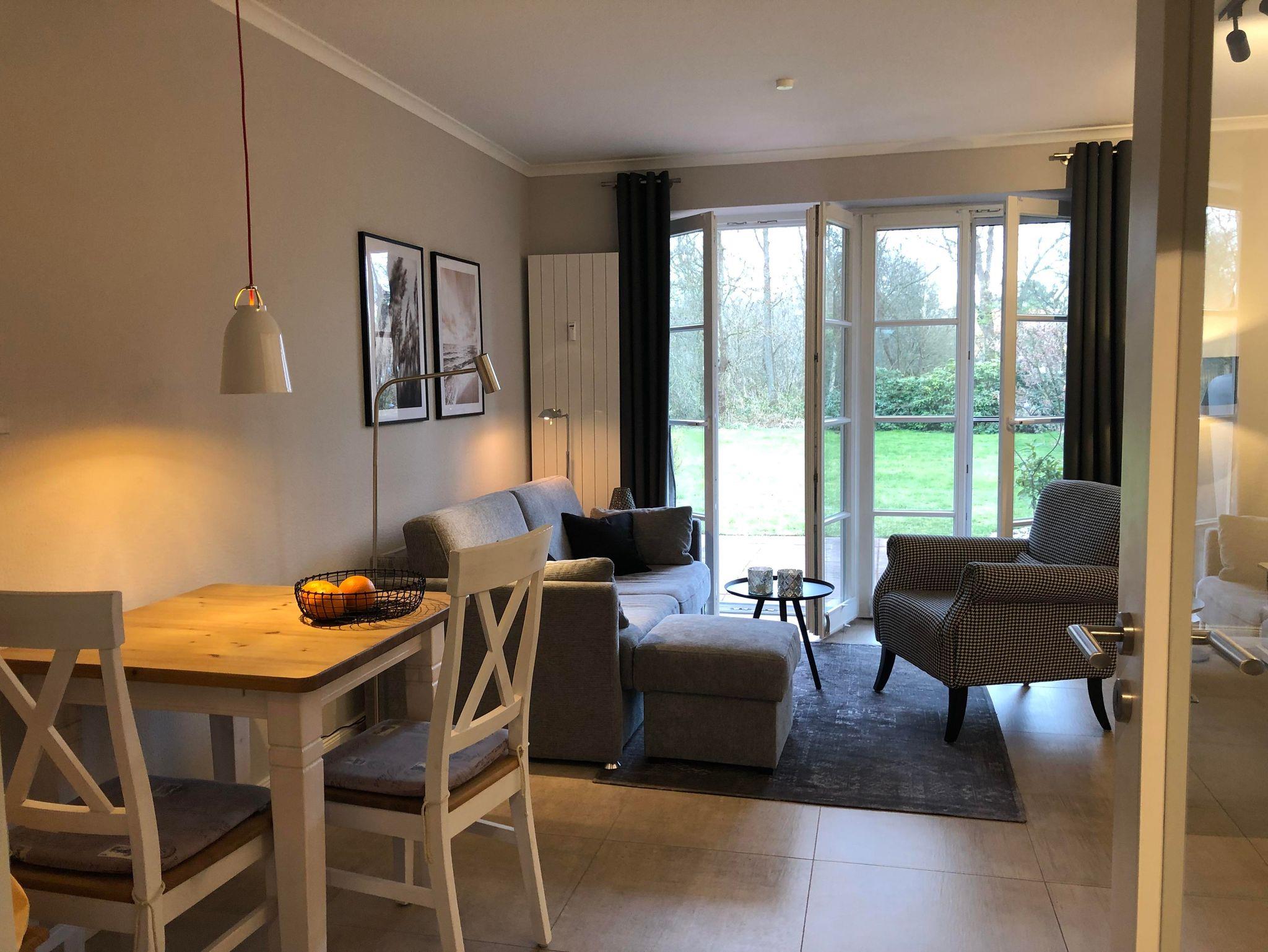 Zu unserem sehr komfortablen und hochwertig ausgestatteten Urlaubsdomizil für max. 2 Personen gehören ein lichtdurchflutetes Wohnzimmer (Blu-Ray, Stereoanlage mit Bluetooth-Funktion, FlachbildTV, kostenfreies WLAN, Reiseführer, Gesellschaftsspiele), Essplatz und Küchenzeile (Cerankochfeld, Backofen, Gefrierfach, Spülmaschine, 2 Kaffeemaschinen). Von hieraus blicken Sie auf die sonnige Terrasse mit Strandkorb über eine großzügige Rasenfläche bis hin zu einem kleinen Wäldchen.