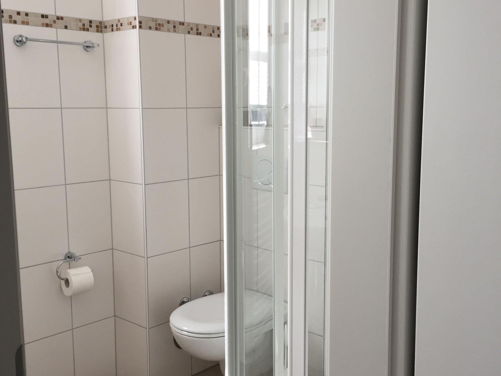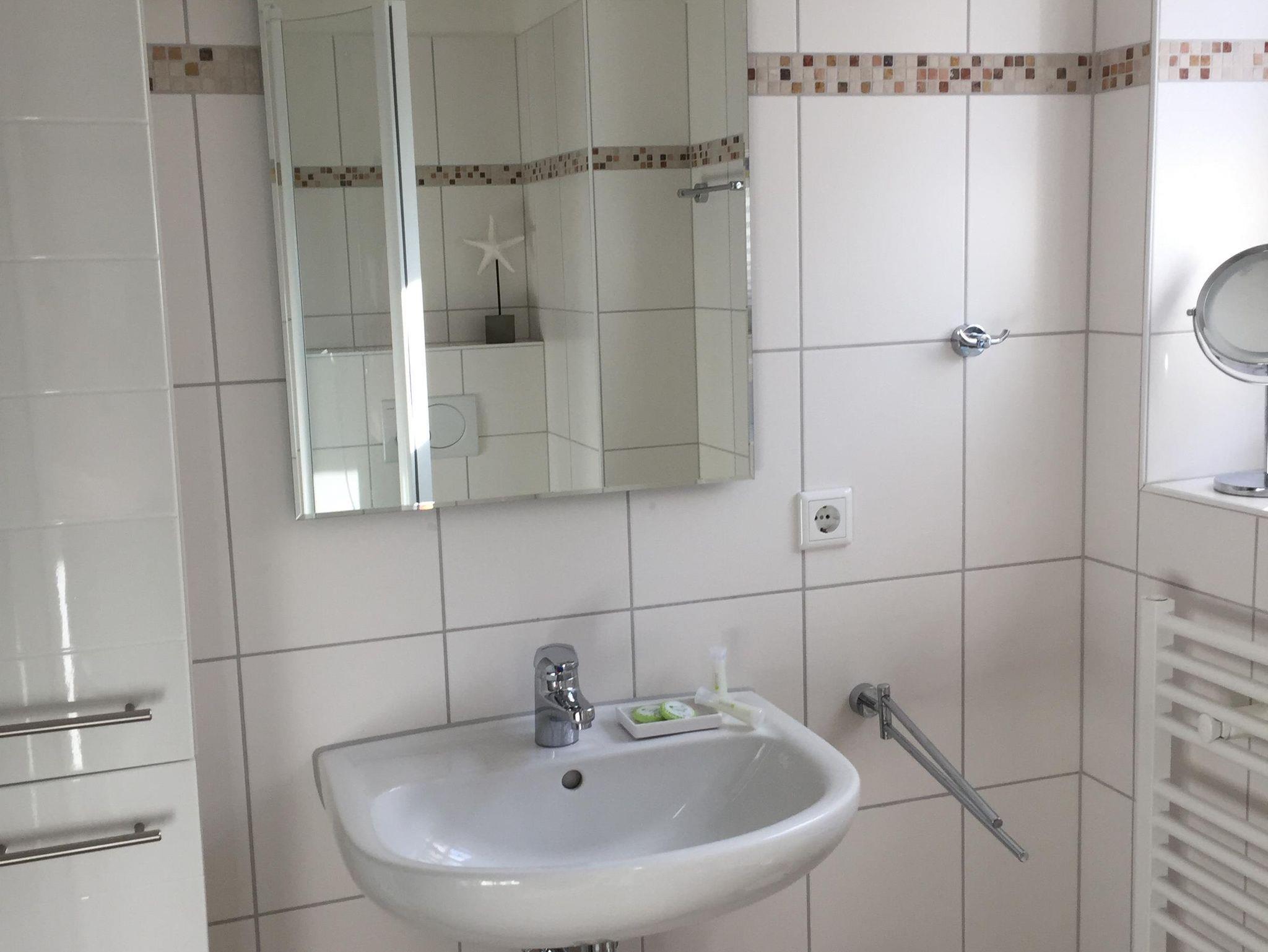 Tageslichtbad: Handtuchwärmer, Dusche, Föhn, Vergrößerungsspiegel.