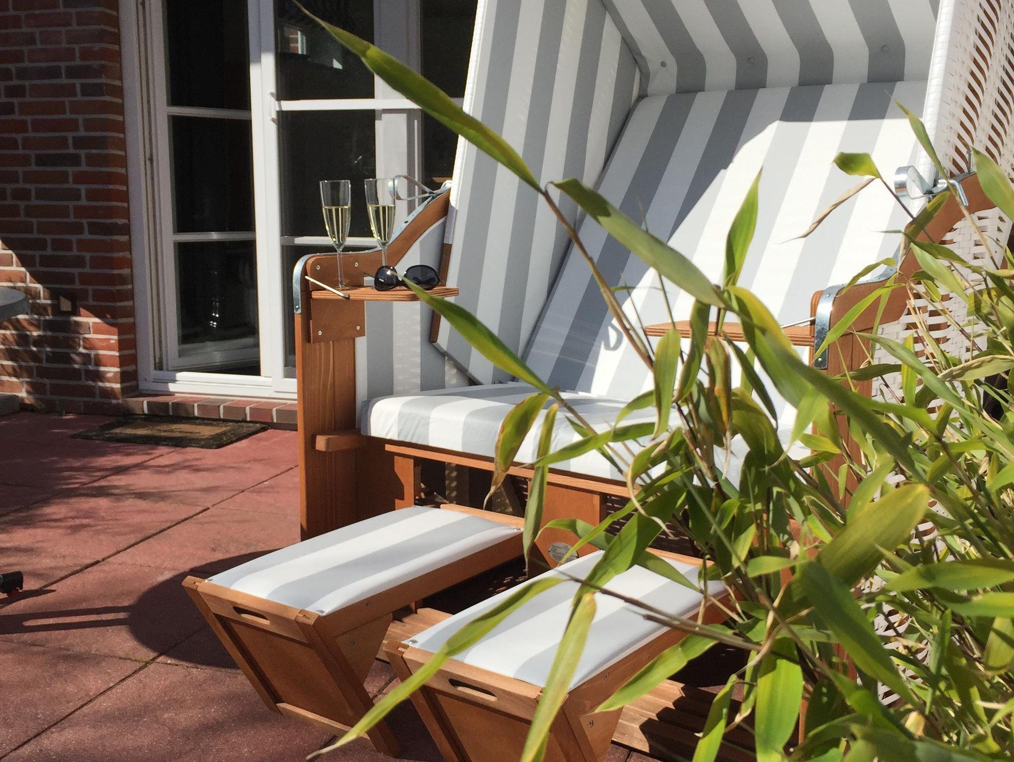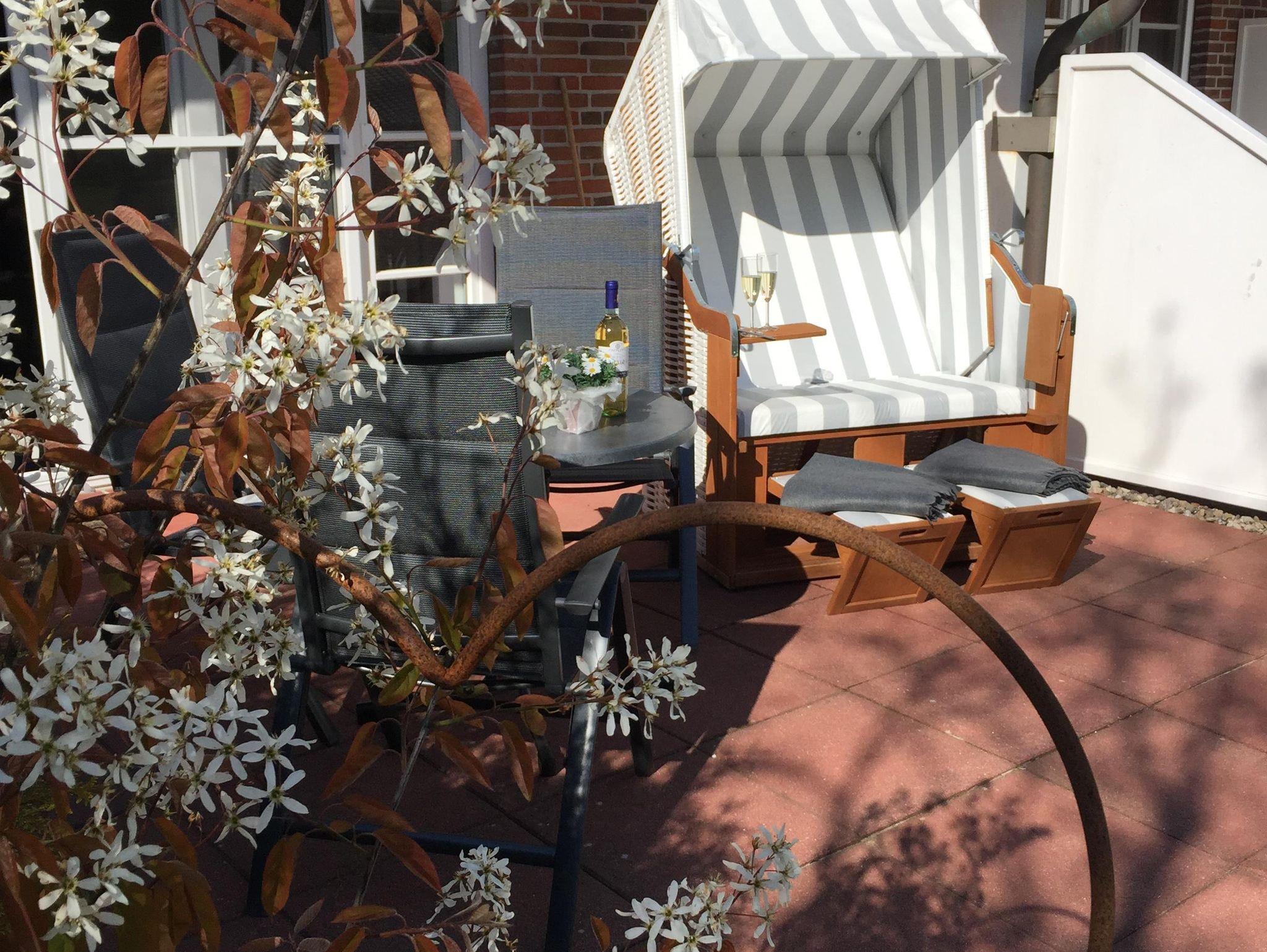 Teilüberdachte, sehr sonnige Terrasse. Während der Sommermonate (April bis Oktober) möbliert: bequemer grau-weißer Strandkorb, Tisch mit Stühlen (hohe verstellbare Rückenlehnen, sep.Polster), großer Sonnenschirm. Aufgrund der Lage genießen Sie auf der Terrasse die Sonne vom Frühstückskaffee bis zum Aperitif am Abend im Strandkorb.