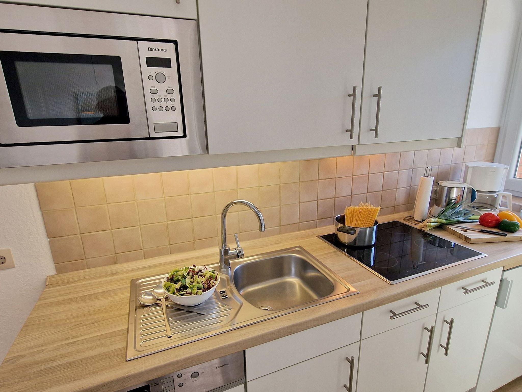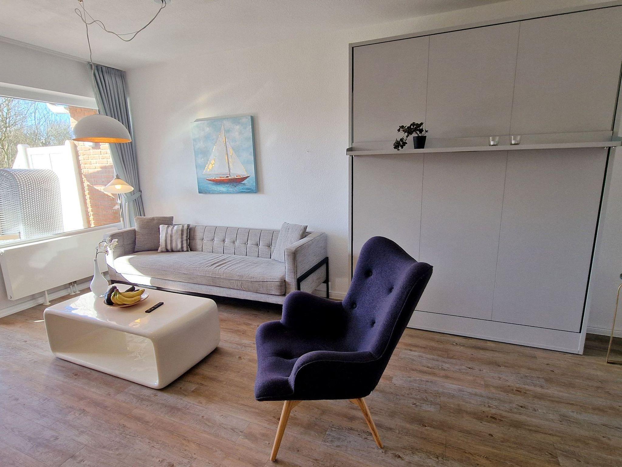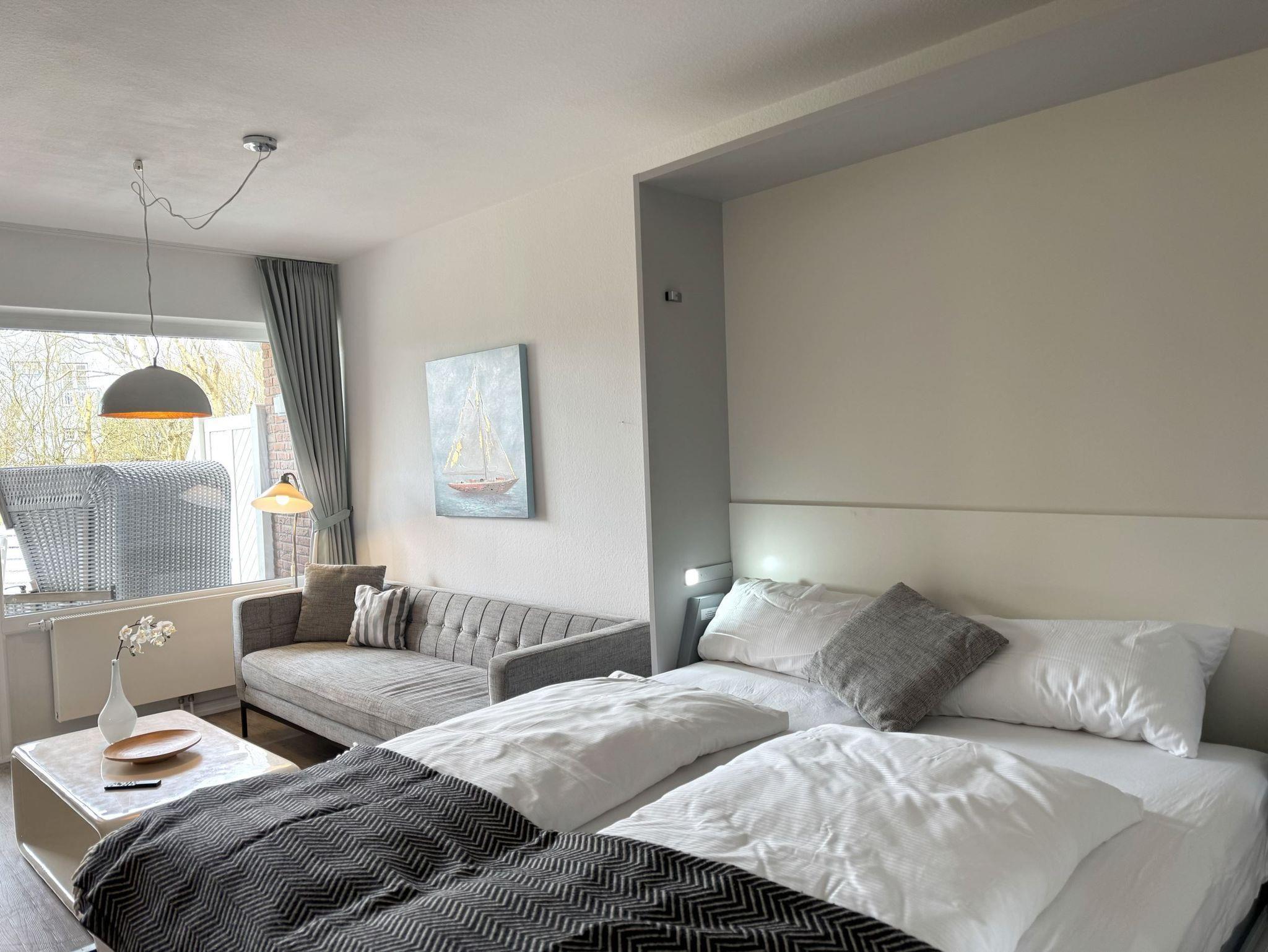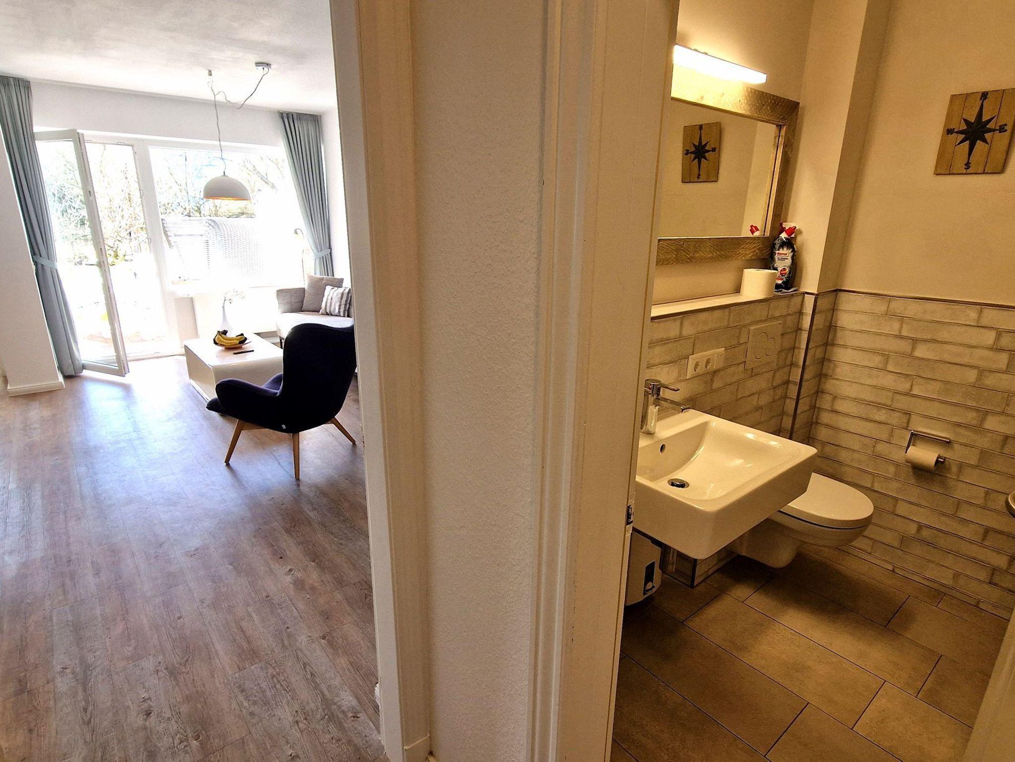 Sie teilt sich wie folgt auf: Eingangsdiele mit Garderobe, Schlafzimmer mit 2 Einzelbetten, Duschbad mit WC. Der großzügige Wohnraum mit direktem Zugang zur Terrasse und Garten überzeugt mit seiner gemütlichen Sitzecke mit direktem Blick nach draußen, moderne, weiße Küche, Essecke und als weitere Schlafmöglichkeit 1 Doppelschrankbett. Die Fußböden der Ferienwohnung sind aus Designerparkett oder Fliesen, Allergikergeeignet.