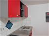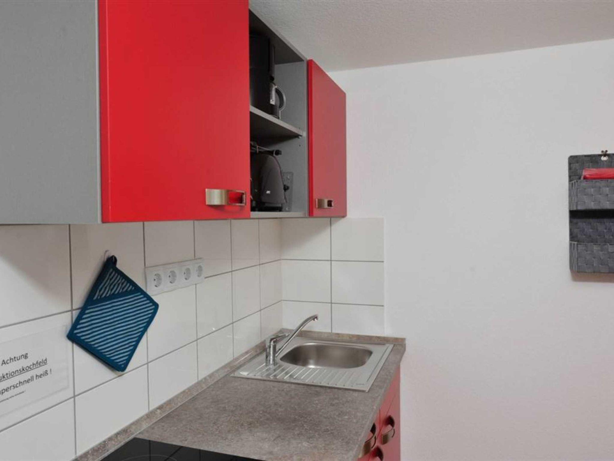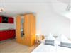 Wohn- und Schlafzimmer mit französischem Doppelbett (140x200cm), Kleiderschrank mit Spiegel, kleiner Esstisch mit 3 Stühlen und TV (Kabel). Offene Küche mit Herd mit 2 Kochfeldern, Mikrowelle mit Grill-Funktion und Kühlschrank mit Gefrierfach.