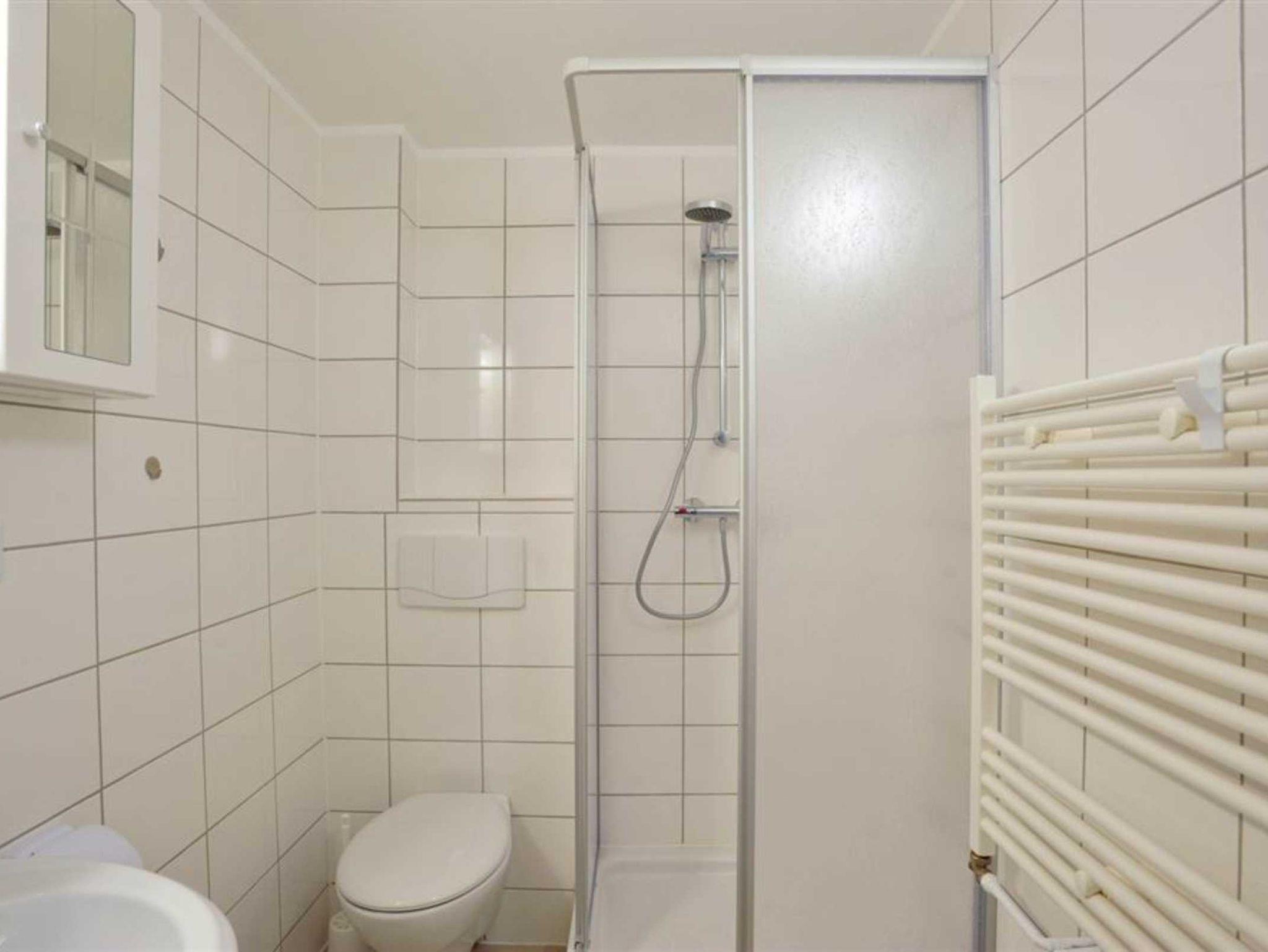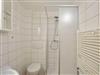 Badezimmer (Duschbad) mit Dusche, WC, Handtuchwärmer und Föhn.