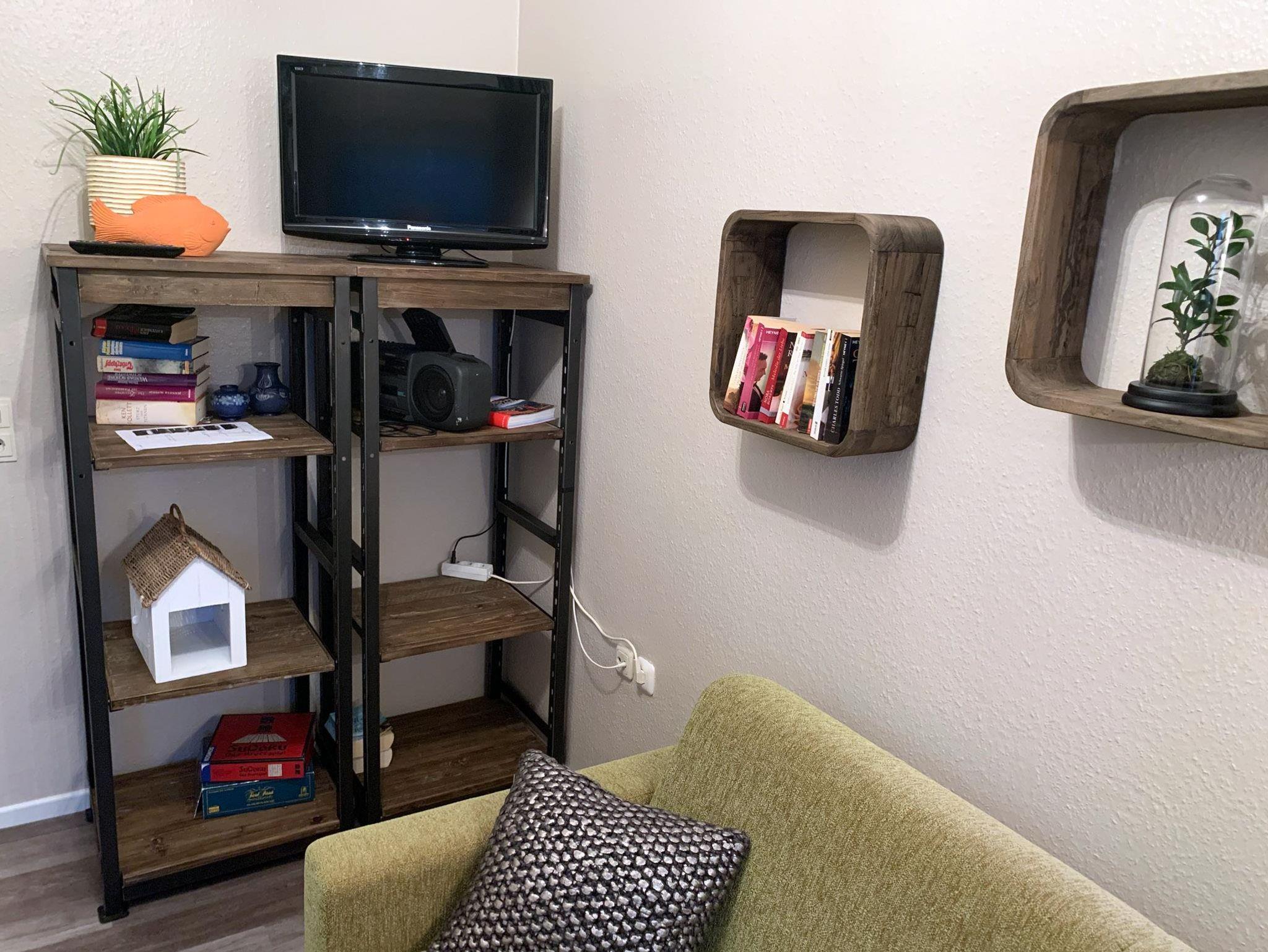 Schlafzimmer: Schlafcouch, Couchtisch, Stehlampe, Eckregalschrank, Kabel-TV, Flachbildschirm