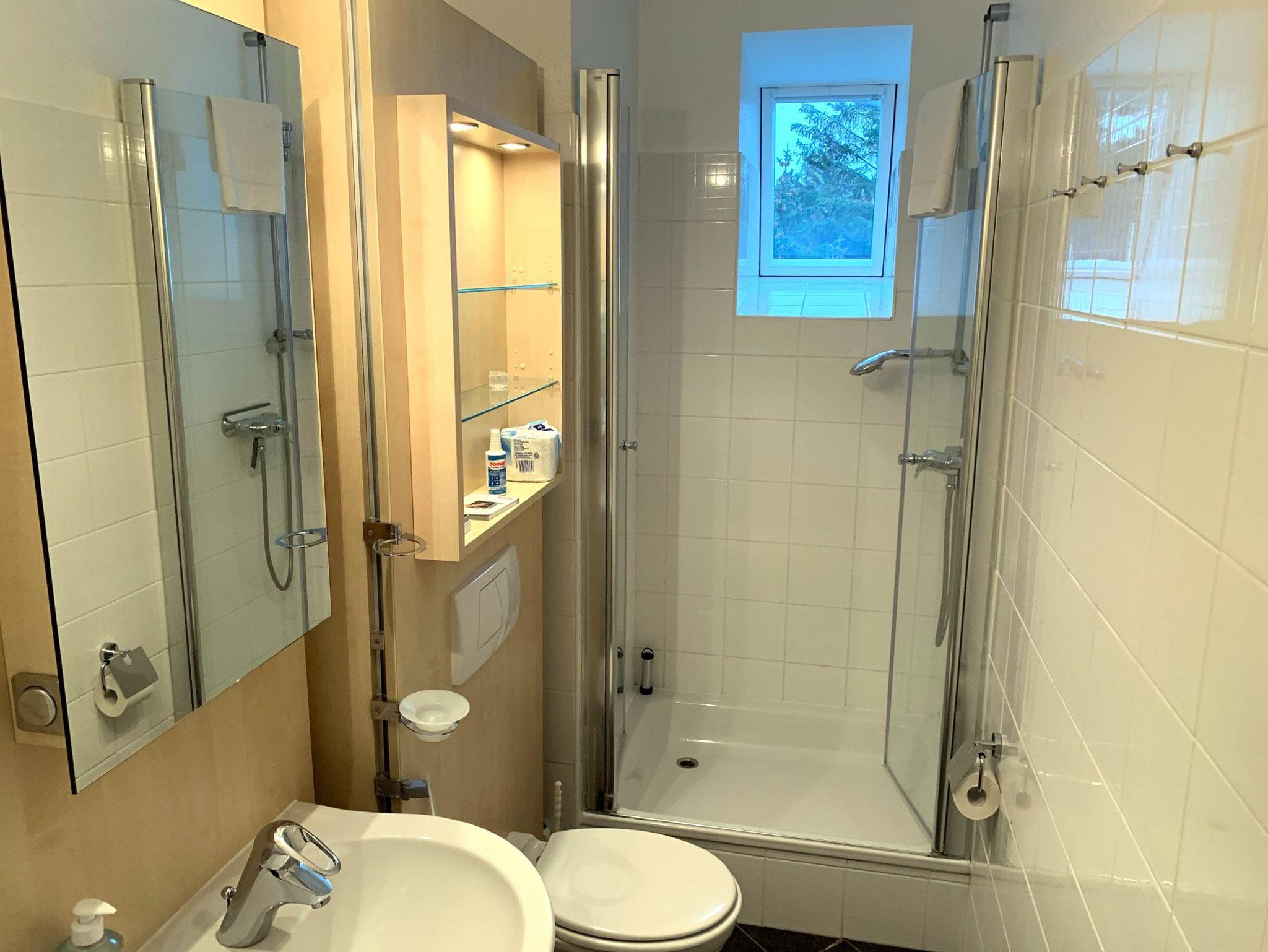 Bad: Dusche, Waschbecken, WC, Spiegelschrank, Duschkabine