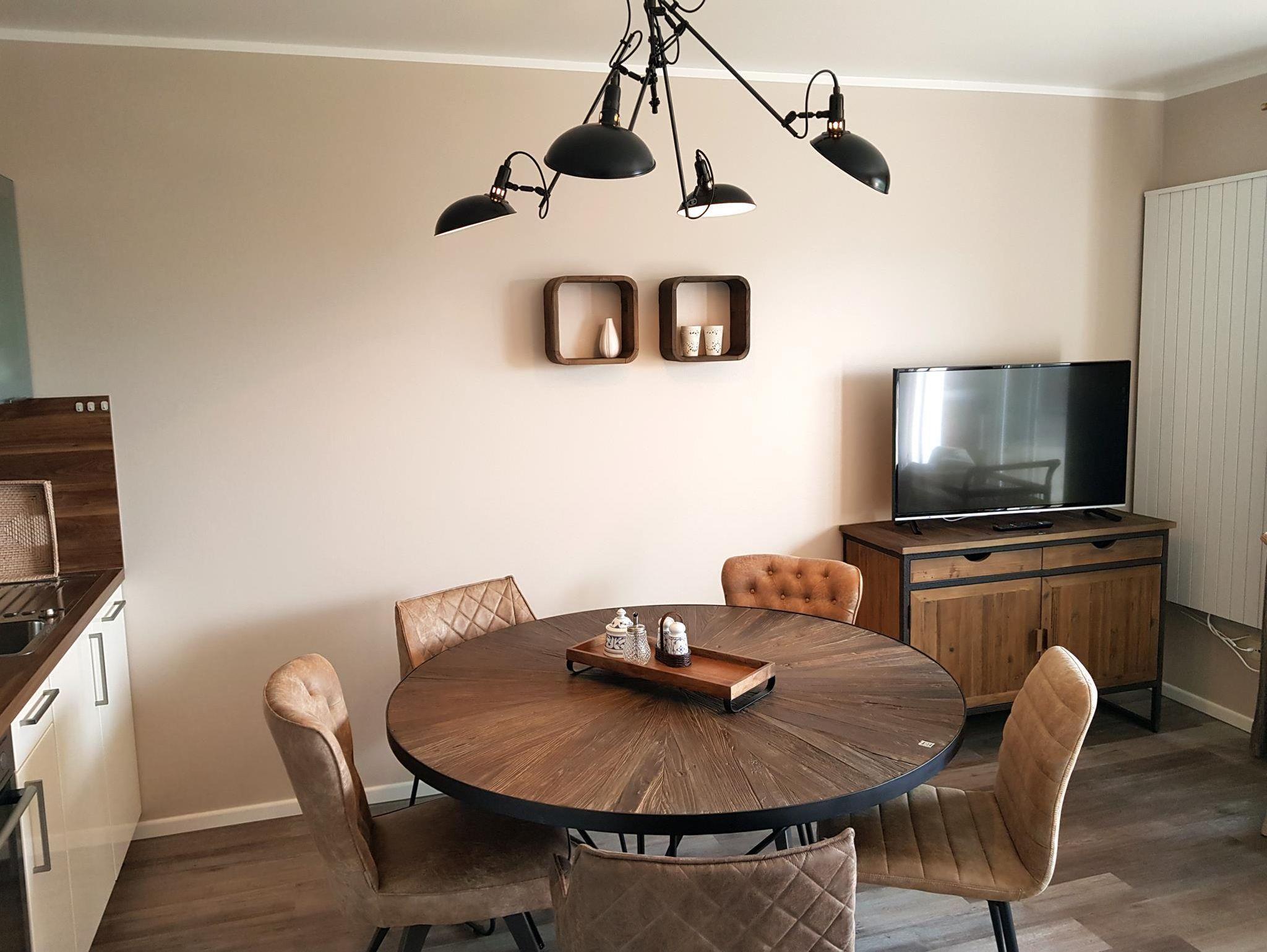 Wohnzimmer: Couch, Couchtisch, Sessel, Hocker, 2 Stehlampen, 2 Vitrinen, Anrichte, Staubsauger, Kabel-TV, Flachbildschirm, Telefon, Esstisch, 5 Stühle, Küchenzeile, 4 Plattenherd mit Ceranfeld und Backofen, Dunstabzugshaube, Kühlschrank, Spülmaschine, Kaffeemaschine, Wasserkocher, Toaster, Geschirr, Kochtöpfe