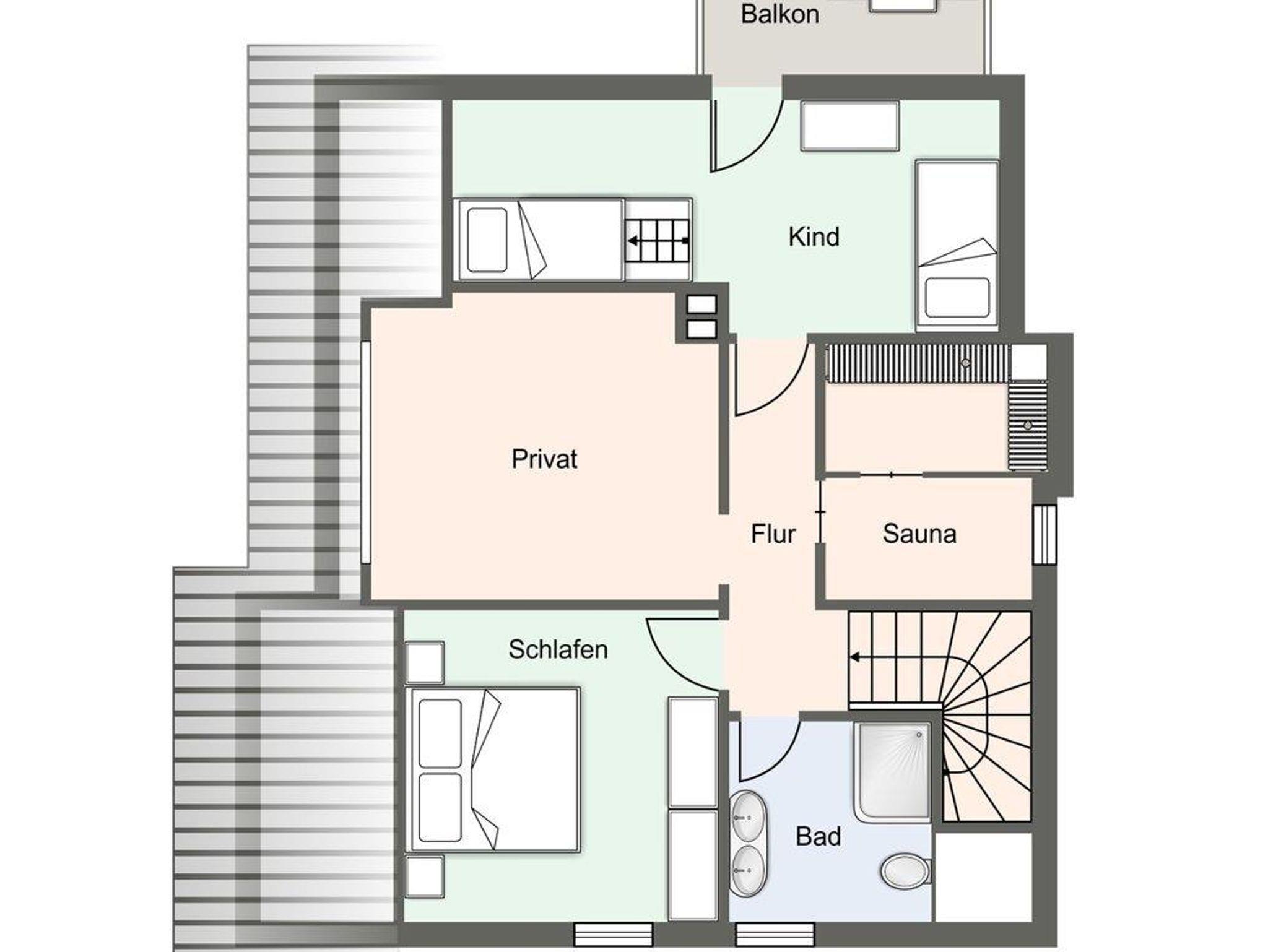 Im Obergeschoss befinden sich 2 Schlafzimmer: eines mit Doppelbett und eines mit einem Etagenbett und einem Einzelbett, mit Zugang zum Balkon. Ein Duschbad und eine Sauna für Ihr Wohlbefinden sind ebenfalls vorhanden.