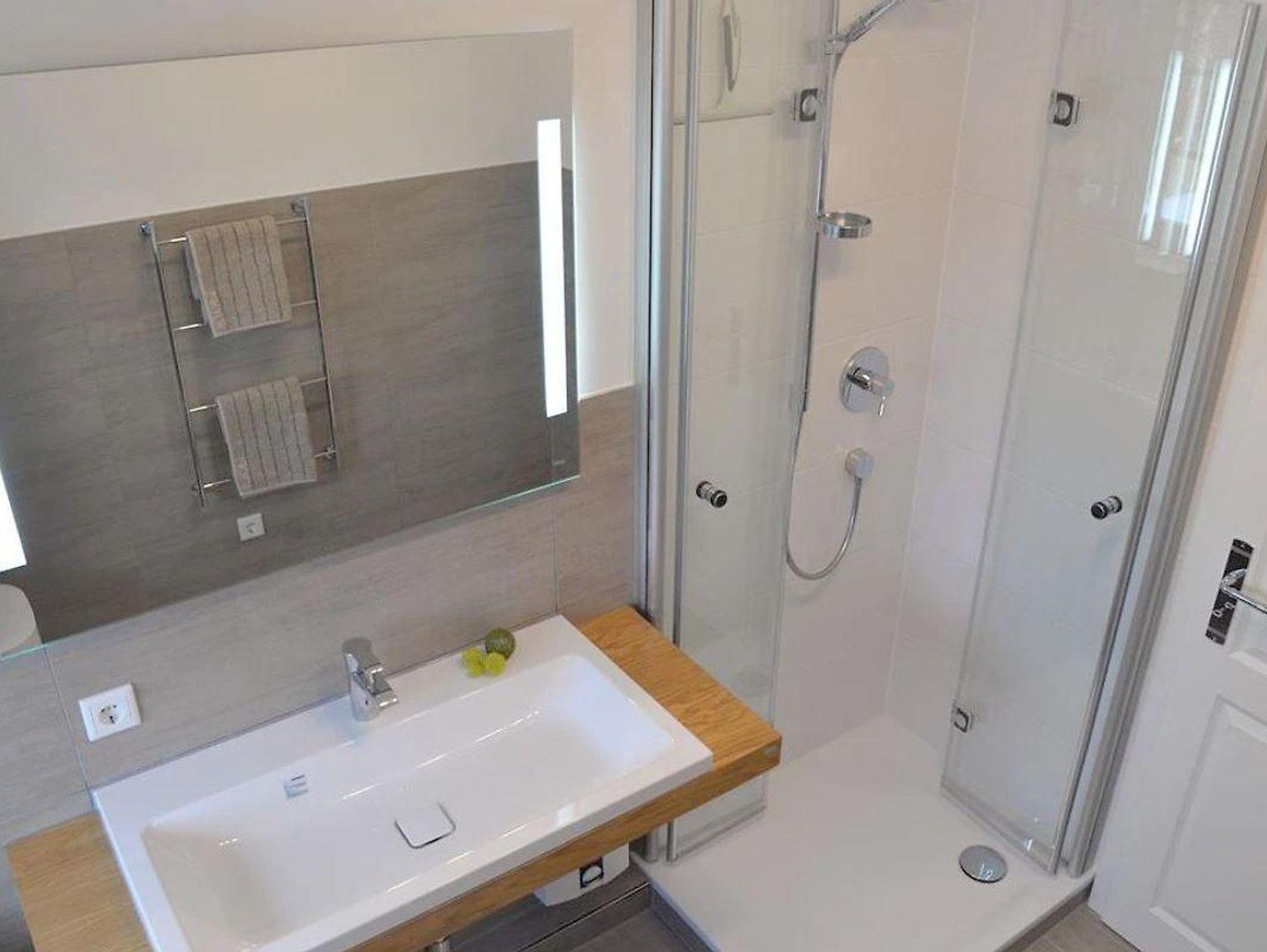 Modernes Badezimmer: Hier finden Sie alles, was Sie brauchen, inklusive eines Haartrockners, um sich nach einem Tag am Strand frisch zu fühlen.