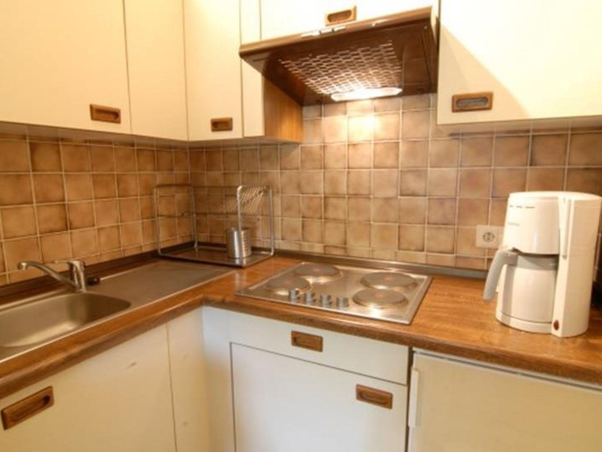 Küche: Einbauküche, 4 Plattenherd, Dunstabzugshaube, Kühlschrank, Kaffeemaschine, Wasserkocher, Toaster, Geschirr, Kochtöpfe