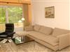 Wohnzimmer: Couch, Couchtisch, 2 Sessel, TV-Tisch, Kabel-TV, Beistelltisch, Stehlampe, Regalschrank, Esstisch, 4 Stühle, Radio