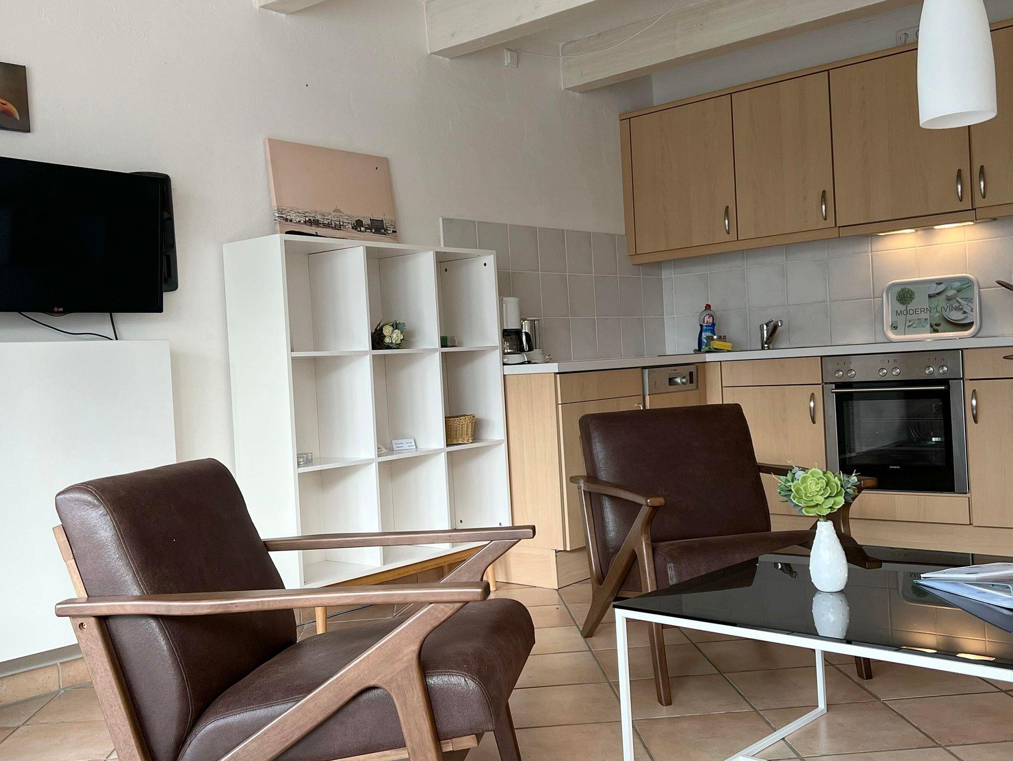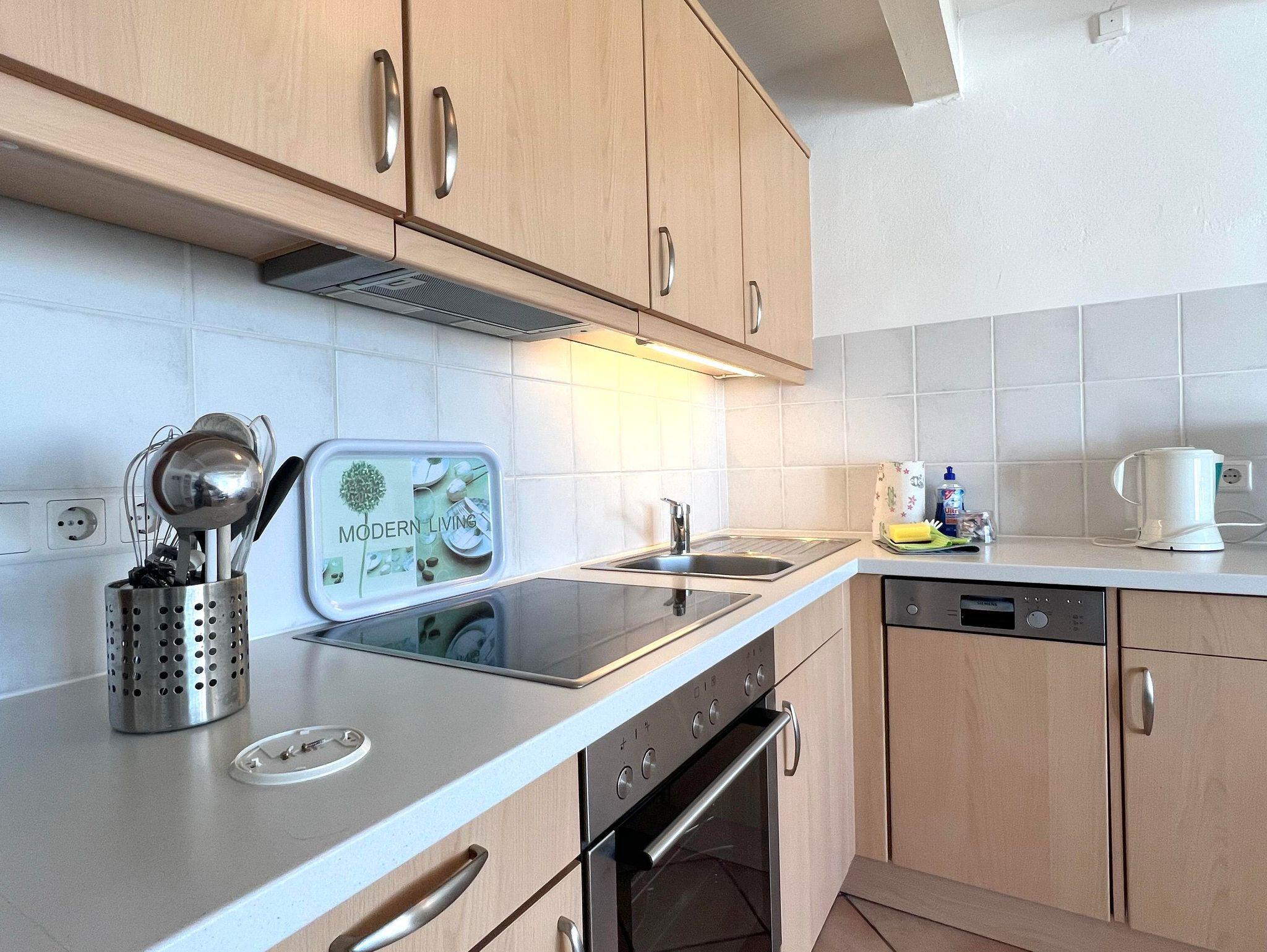 • komplett eingerichtete Küche, Backofen, Geschirrspüler, Kühlschrank mit Gefrierfach, Wasserkocher, Kaffeemaschine (Filter), Toaster.