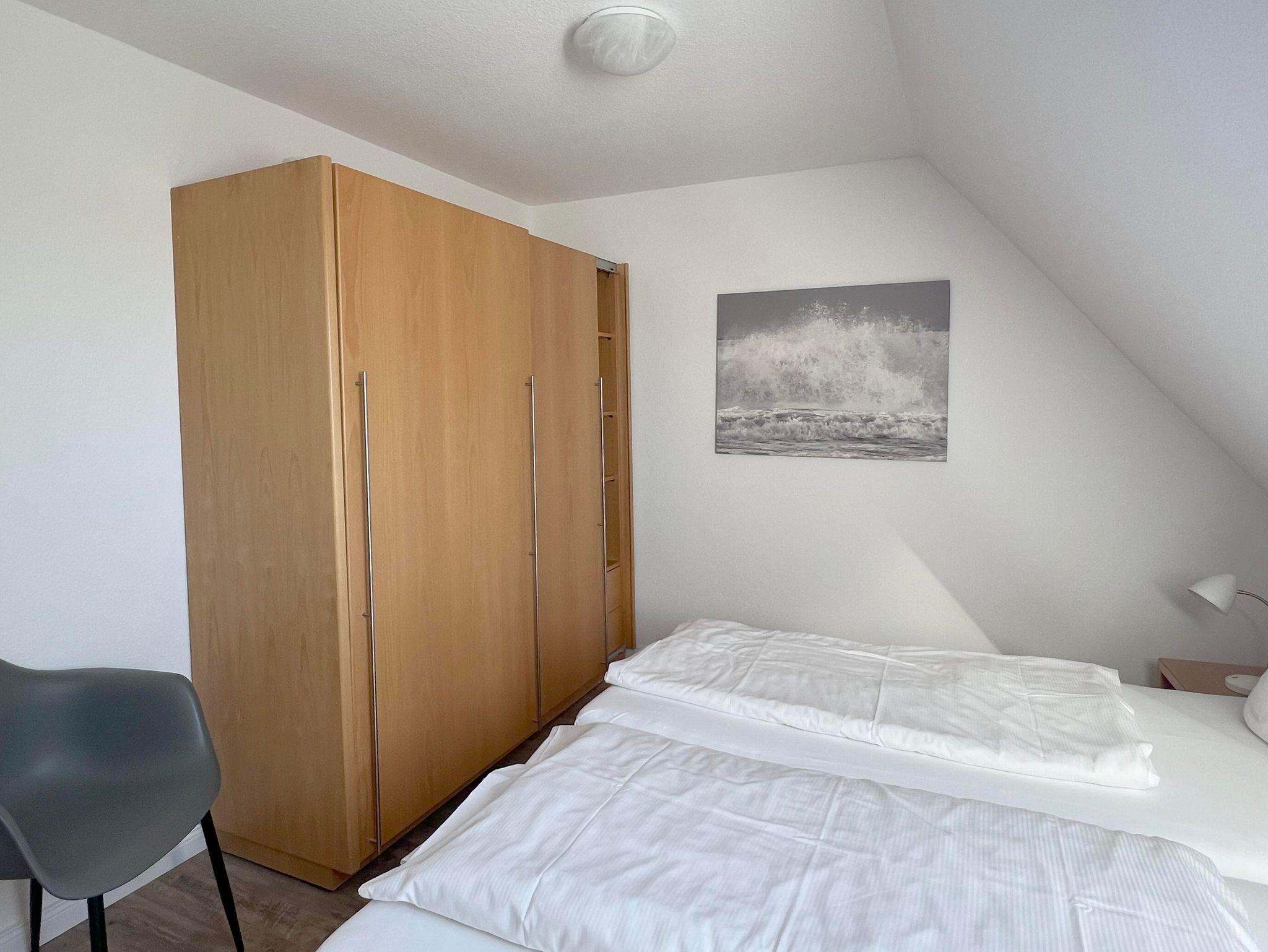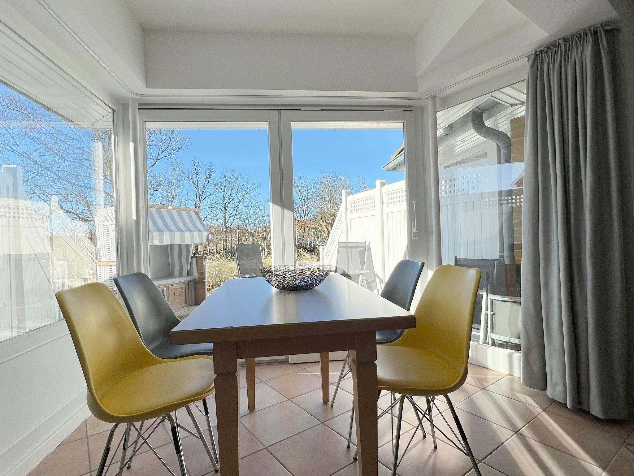 Im Erdgeschoss befindet sich die Eingangsdiele mit einer gradläufigen Treppe nach oben zu den beiden Schlafzimmern.1 Schlafraum mit Doppelbett 180x200cm mit getrennten Matratzen, ein Schlafraum mit 2 Einzelbetten (90x200cm). Das Zustellen eines Kinderreisebettes oder Hochstuhles ist kein Problem. Abgehend von der Eingangsdiele, der Wohn-Essraum mit voll ausgestatteter Küchenzeile, gemütlicher Sitzecke und Essecke im raumhoch verglasten Wintergarten, direkter Zugang zu einer, mit einer kleinen Sanddüne eingefassten Terrasse und Garten. Das Duschbad ist komplett neu in 2018, ausgestattet mit begehbarer Dusche, WC, Waschbecken und Außenfenster.