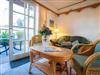 Wohnzimmer mit Sofa (2er), 2 Sesseln, TV (SAT), Stereo-Kompaktanlage, DVD-Player, Kaminofen und separatem Essbereich mit gemütlicher Eckbank und 2 Stühlen. Abstellkammer mit Staubsauger. Offene Küche mit Backofen, Kühlschrank mit Gefrierfach und Geschirrspüler. Direkter Zugang zur möblierten Terrasse nach Osten.