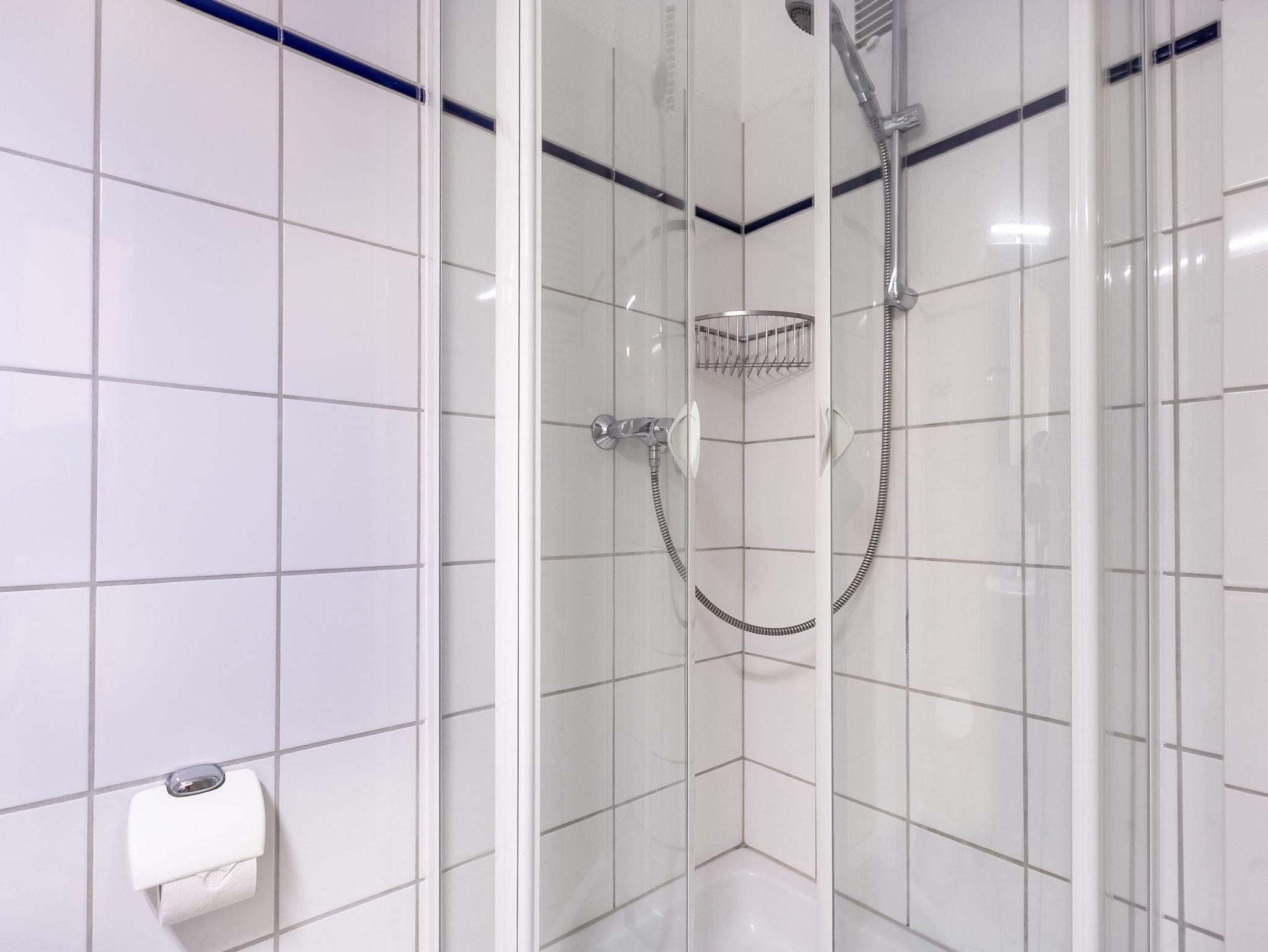 Badezimmer (Duschbad) mit Dusche, WC, Föhn und Handtuchwärmer.