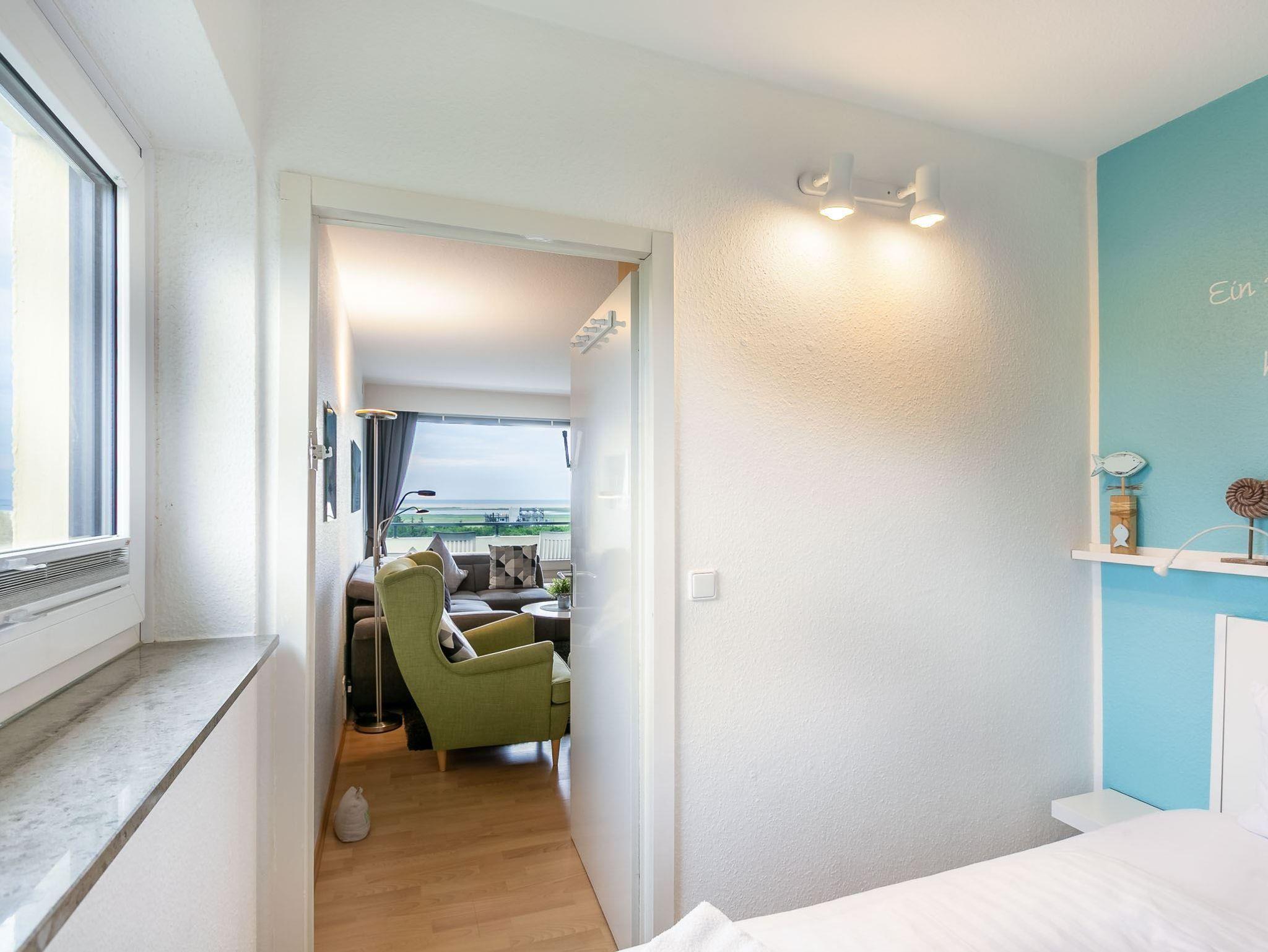 2. Schlafzimmer mit Schlafsofa (90x200cm), Kleiderschrank und phänomenalem Nordseeblick.