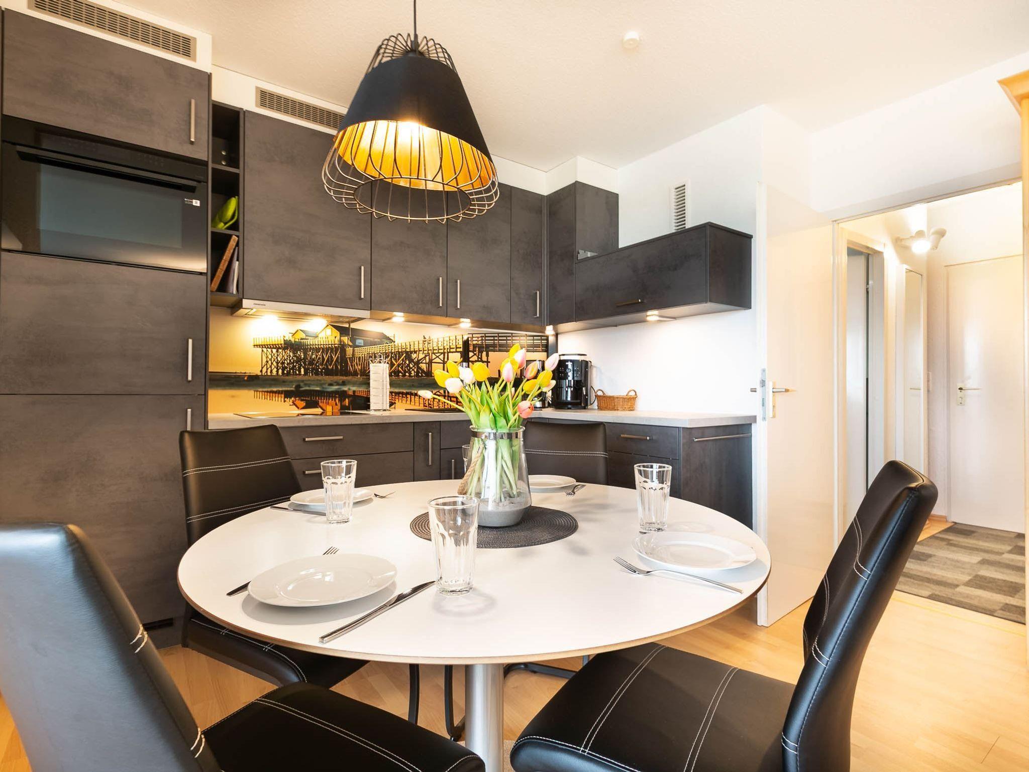 Wohnzimmer mit Ecksofa, sehr bequemem Ruhesessel, SMART-TV (Sat), Stereo-Kompaktanlage mit CD-Spieler und Esstisch mit 4 Stühlen. Direkter Zugang zum breiten, möblierten Balkon nach Südwesten. Einen Ort mit besserem Ausblick auf Nordsee, Strand und Sonnenuntergang werden Sie in St. Peter-Ording wahrscheinlich nicht finden. Offene Küche mit Backofen, Mikrowelle, Geschirrspüler und Kühl-Gefrier-Kombination.