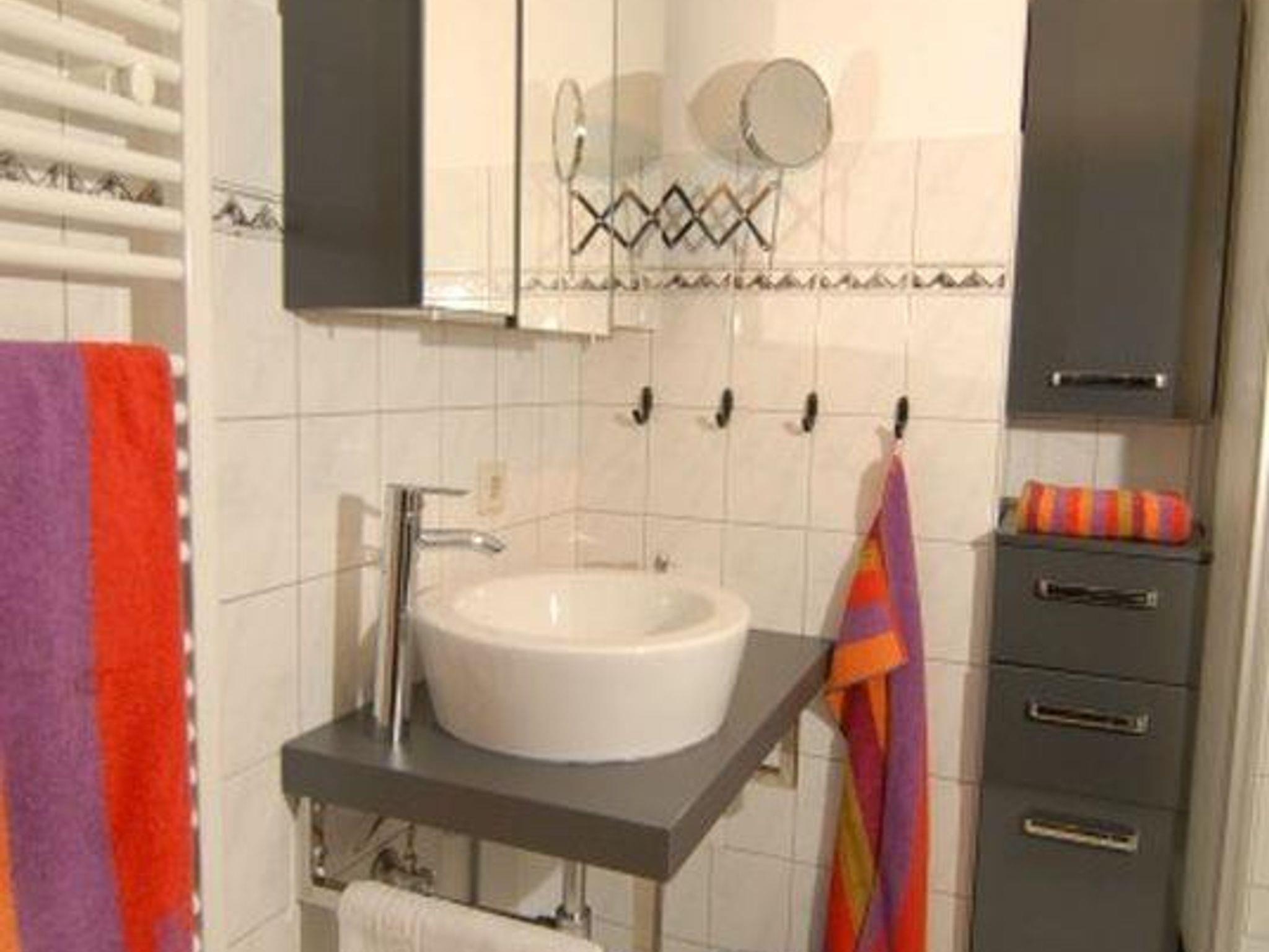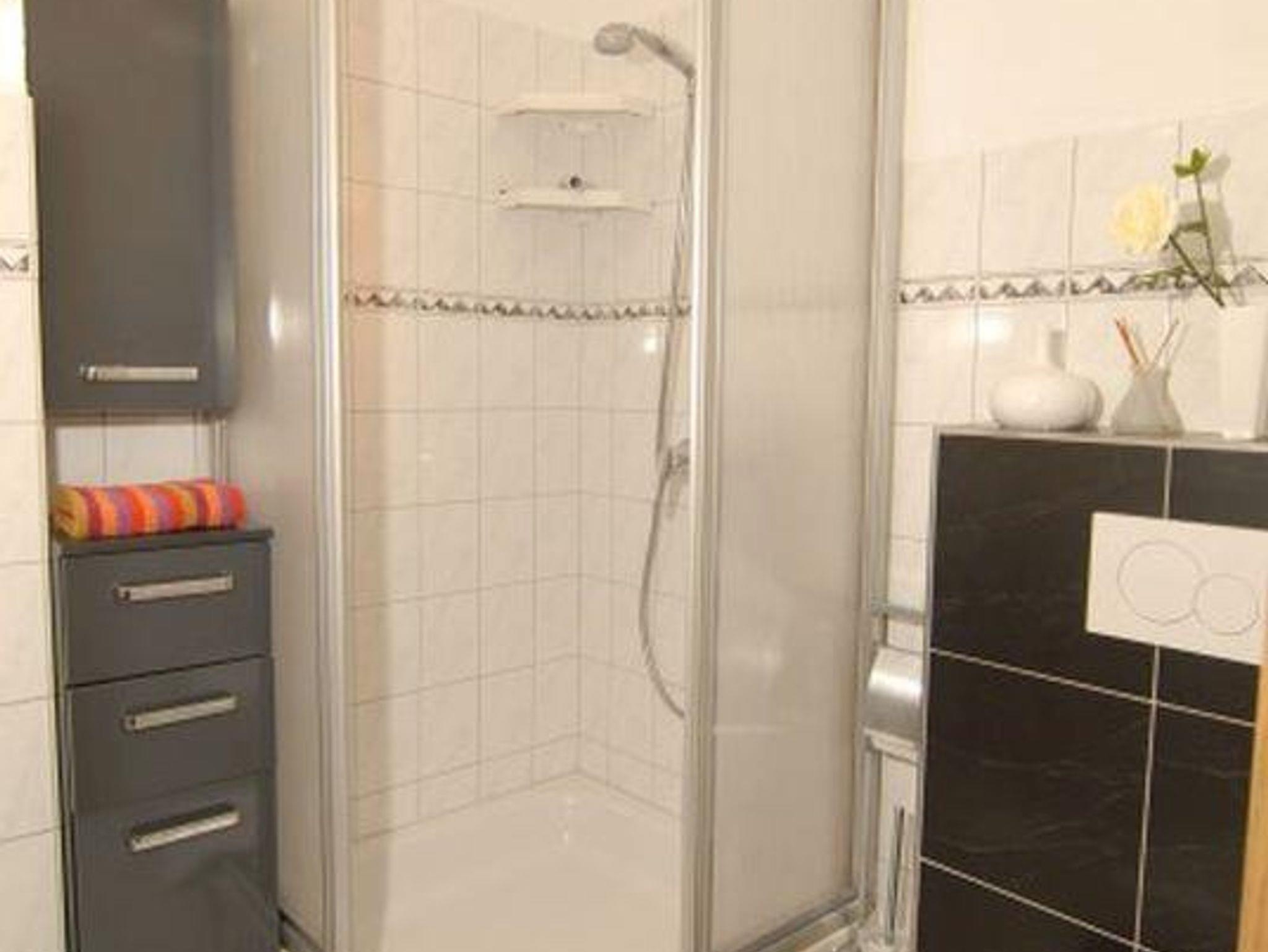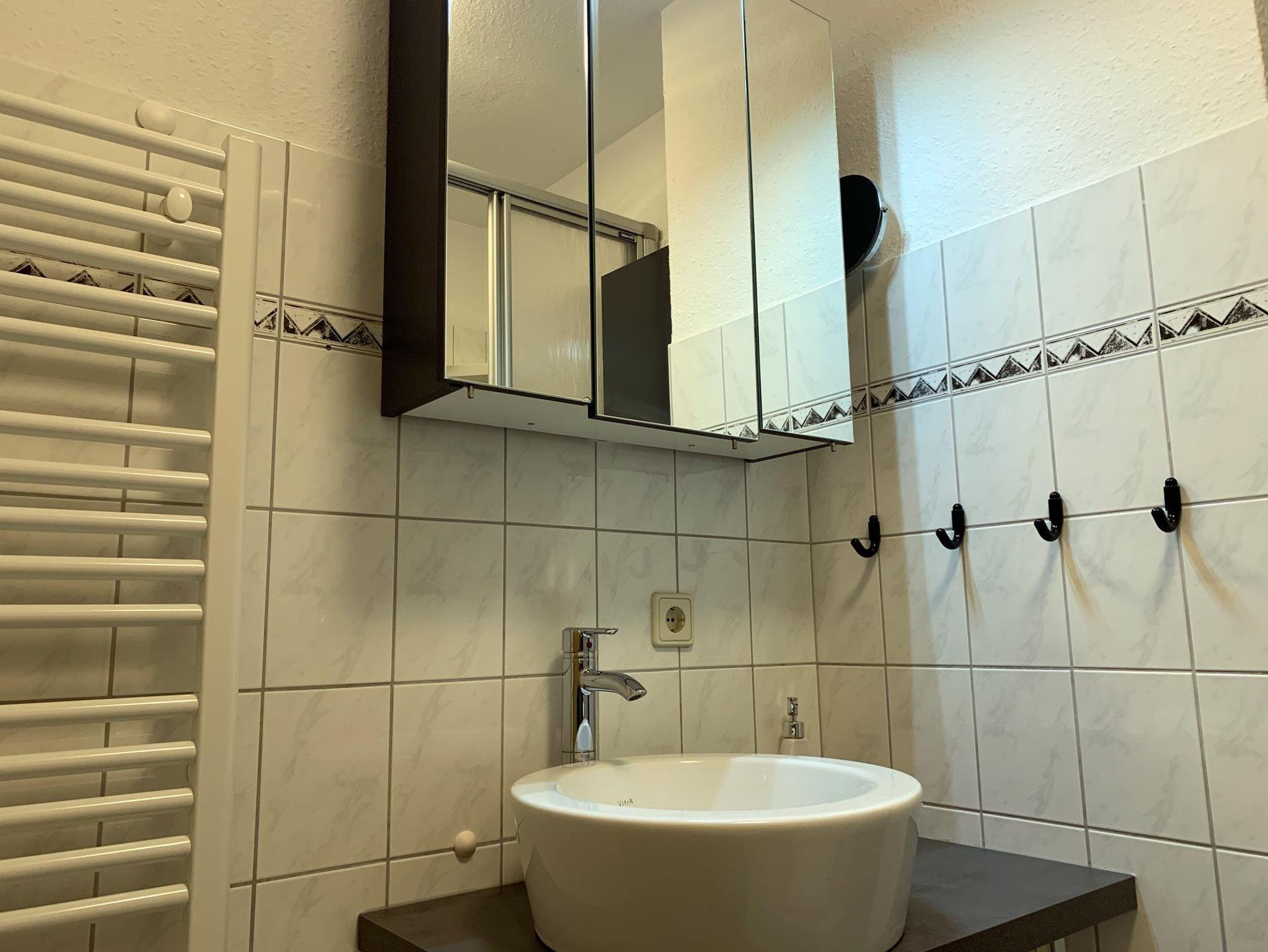 Bad Dusche, Waschbecken, WC, Regal, Spiegelschrank, Kosmetikspiegel, Duschkabine, Fön, Handtuchheizkörper