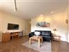 Wohnzimmer:Ledercouch, 1 Ledersessel, Couchtisch, Beistelltisch mit Leselampe, Kabel-TV (HD), 50-Zoll-Flachbildschirm, Stereoanlage mit CD-/DVD-Player, HiFi-Schrank, Stehlampe, Schrankwand, Vitrine, Regal, Schrankdoppelbett, Esstisch, 4 Stühle, moderne E-Heizung