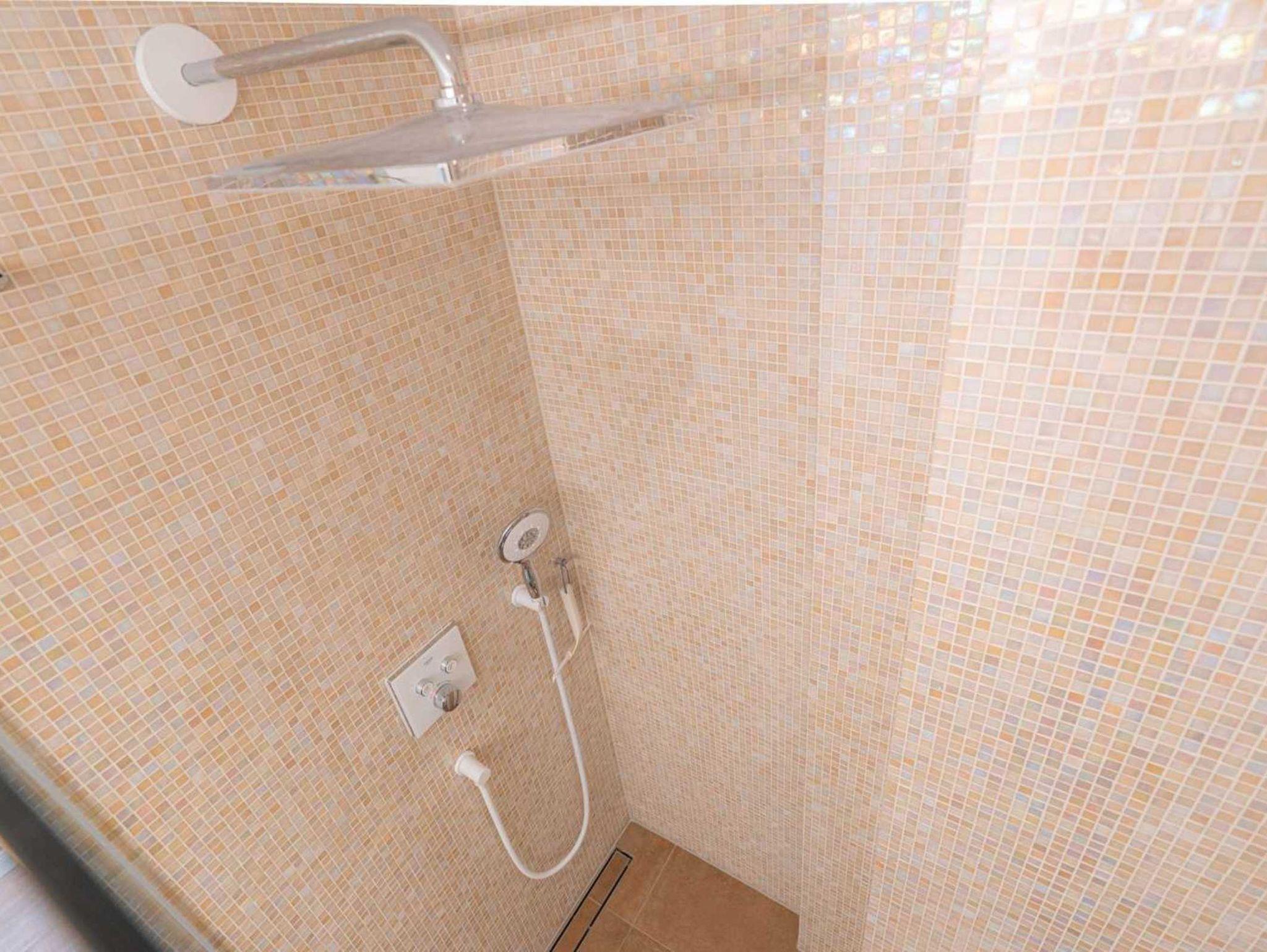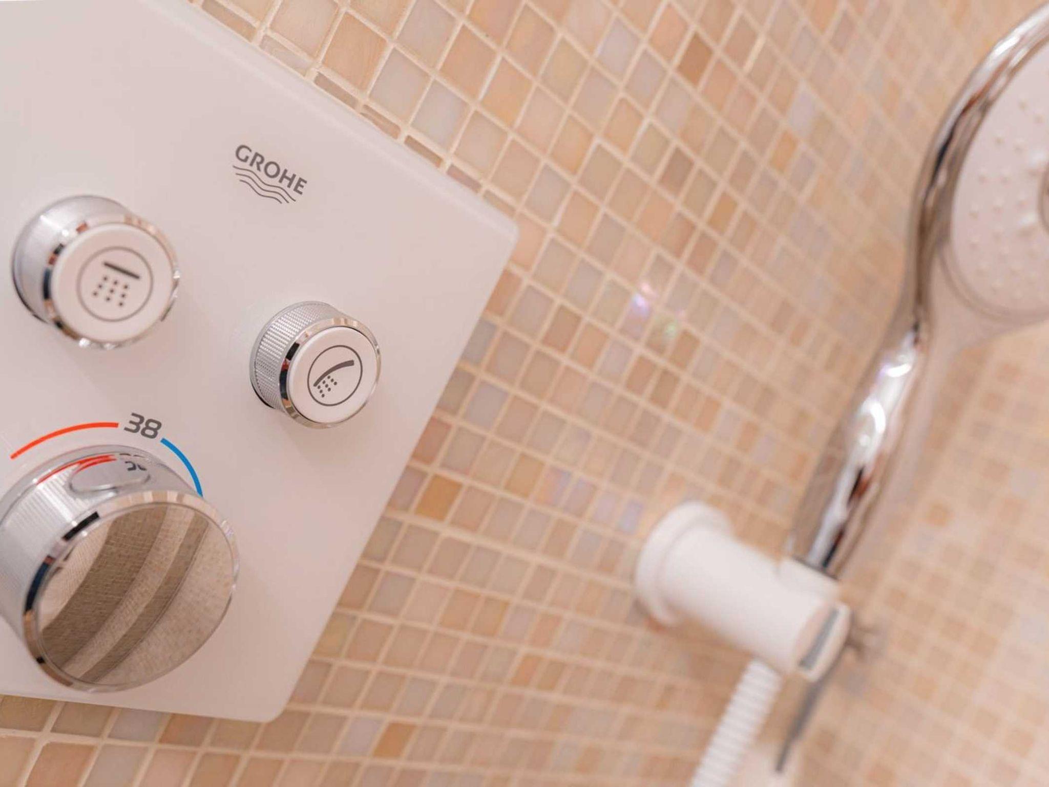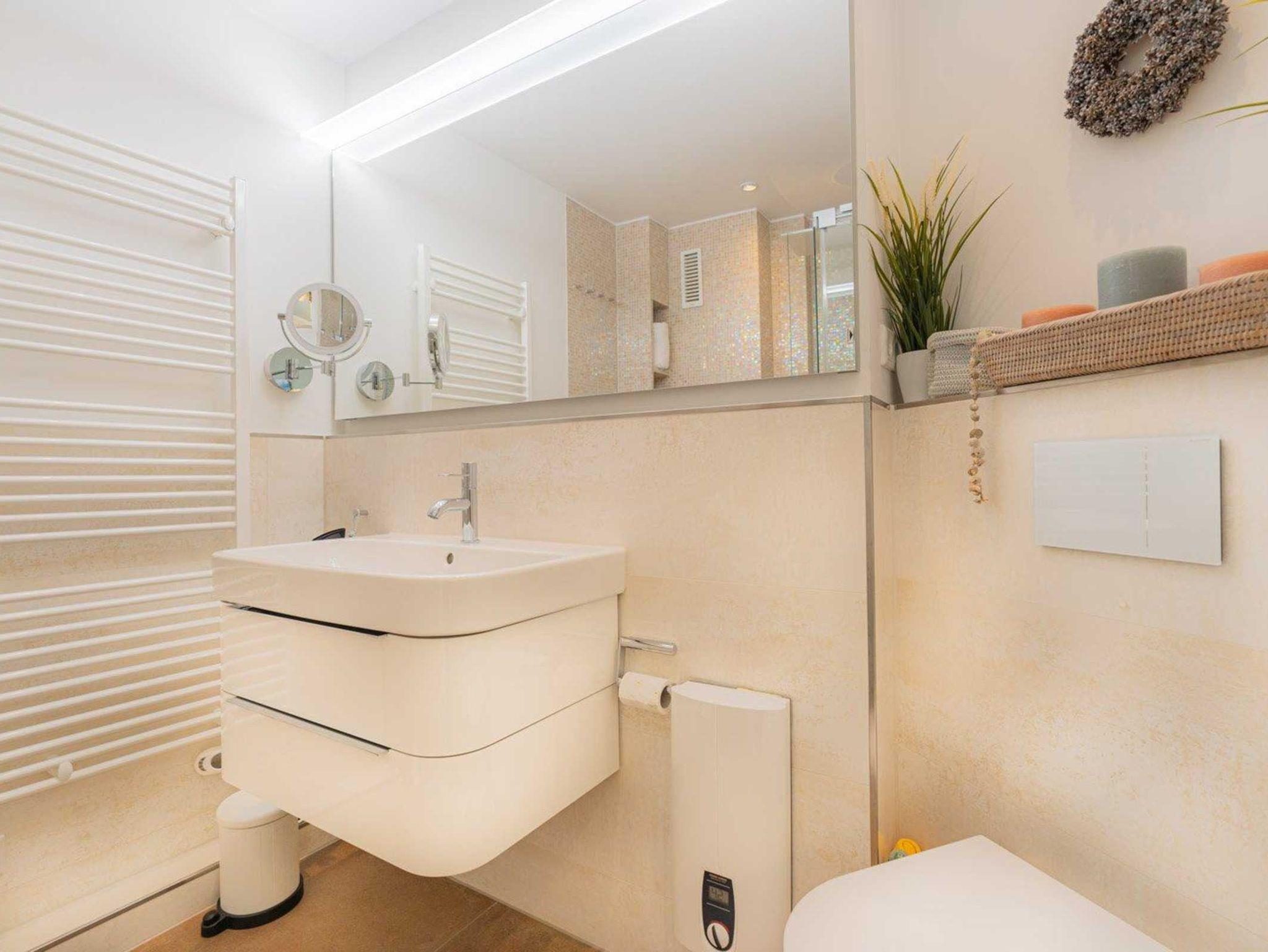 Badezimmer (Duschbad) mit Dusche, WC, Handtuchwärmer, Fußbodenheizung und Föhn.