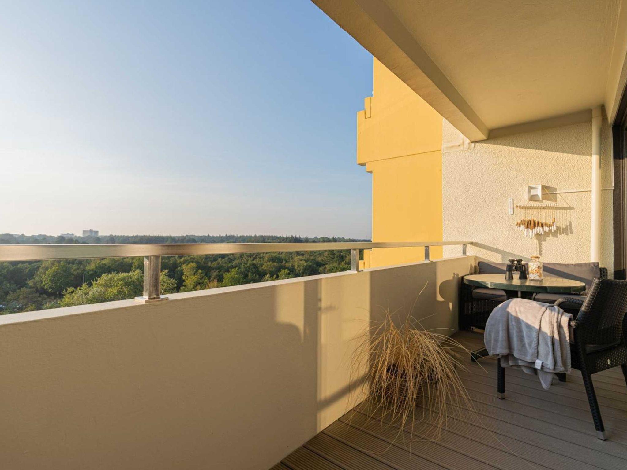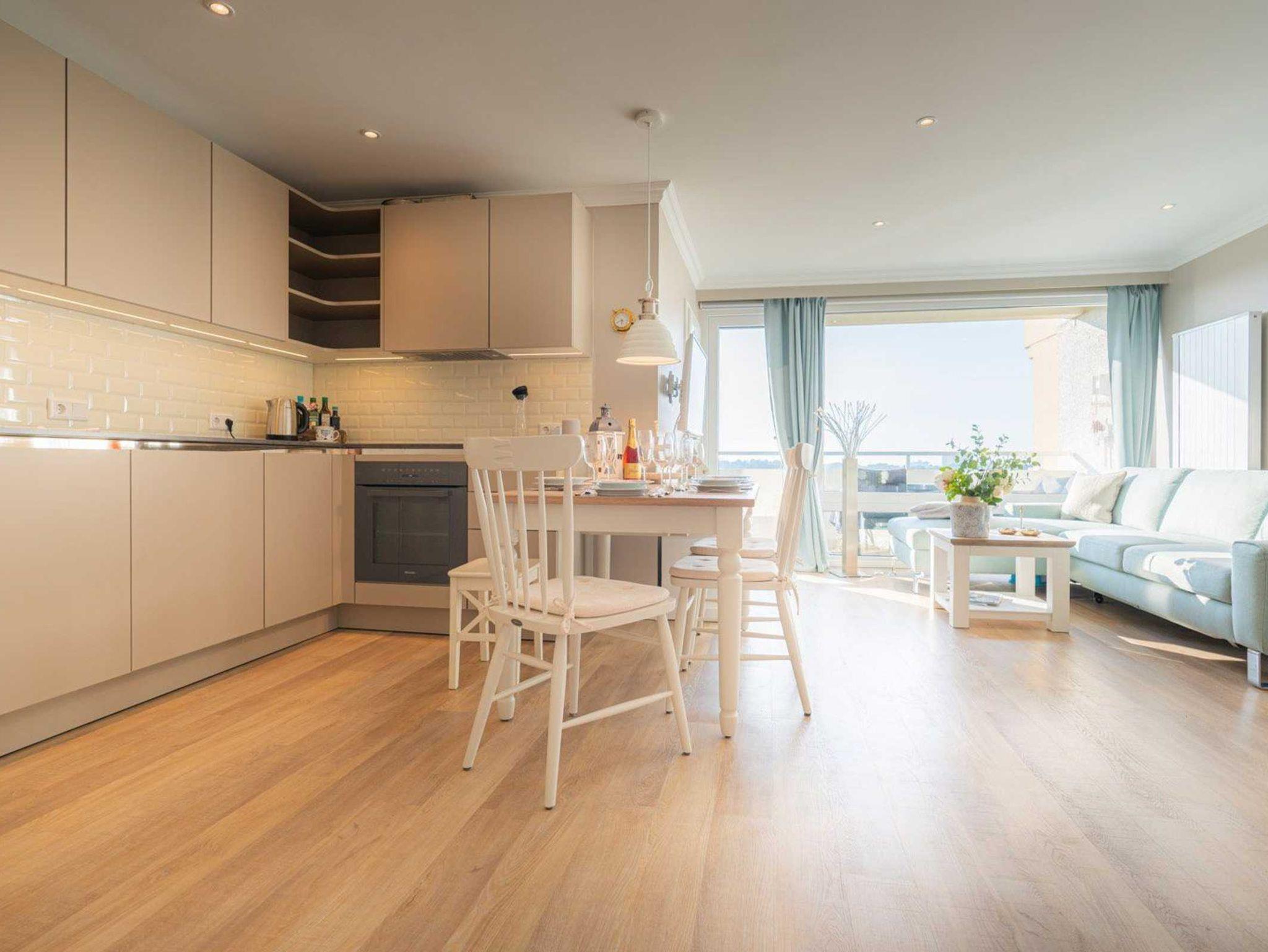 Wohn-/Schlafzimmer mit Doppelbett (2x 100x200cm), großem Ecksofa, SMART-TV mit Sky-Abo (Sat), Alexa-Soundsystem, Kleiderschrank und Esstisch für 4 Personen. Direkter Zugang zum möblierten West-Balkon. Offene Küche mit Induktionsherd, Backofen, Geschirrspüler, Kühl-Gefrier-Kombination, Nespresso DeLonghi Kapsel-Kaffeemaschine und Nestlé SpecialT-Teemaschine.