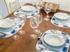 Wohnzimmer mit Sofa (2er), 2 Sesseln, kleinem TV (Kabel) und Esstisch mit 4 Stühlen. Offene Küche mit Herd mit 3 Kochstellen, Mikrowelle, Geschirrspüler und Kühlschrank mit Gefrierfach.