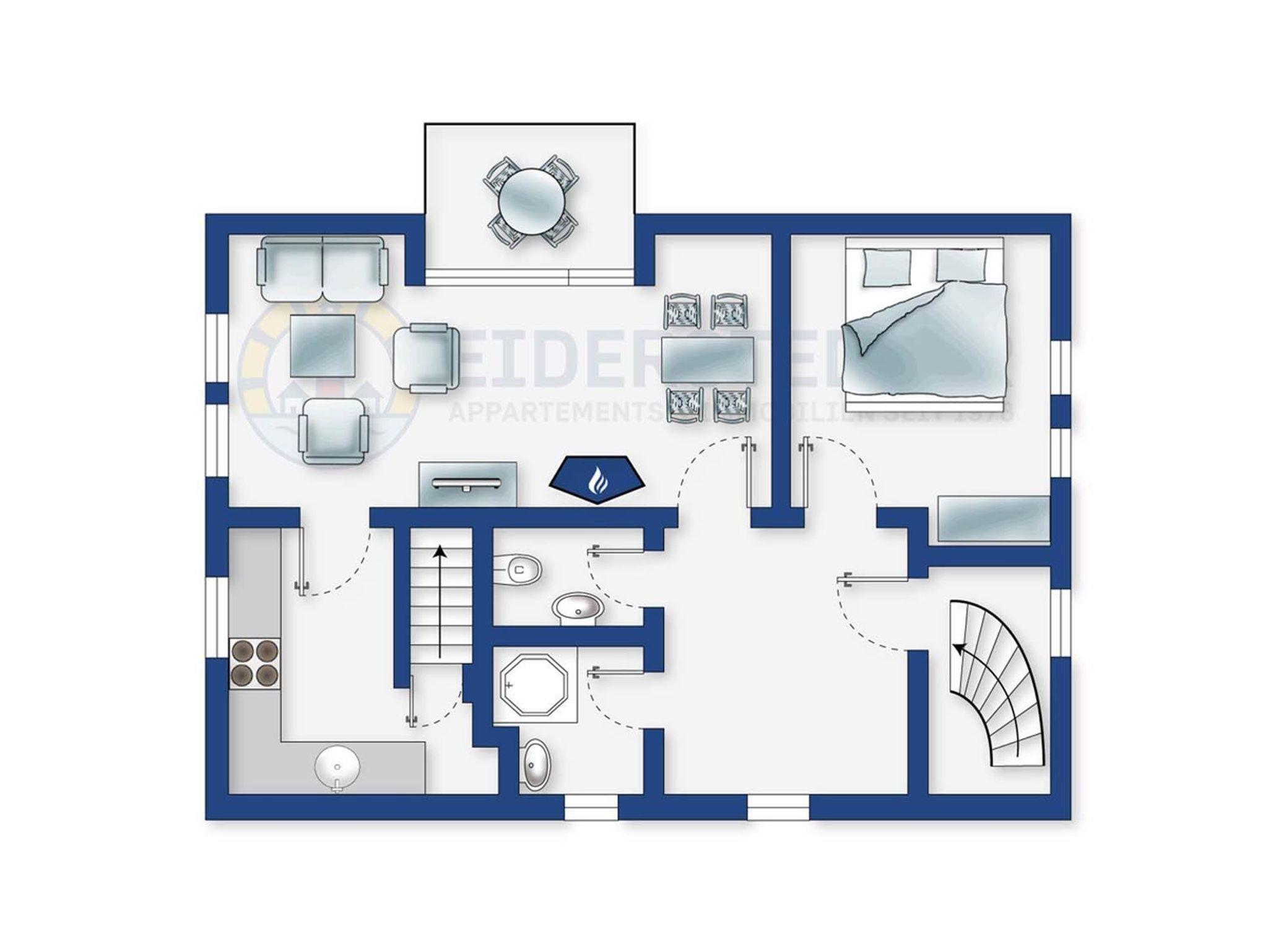Die übereinanderliegenden Ferienwohnungen Andreas (ID 458, EG, ca. 65?m²) und Sven (ID 459, OG/DG, ca. 60?m²) im Haus Carstens bieten gemeinsam Platz für bis zu 8 Personen ? ideal für größere Familien oder Freunde, die gemeinsam Urlaub machen möchten, aber getrennte Rückzugsorte schätzen.