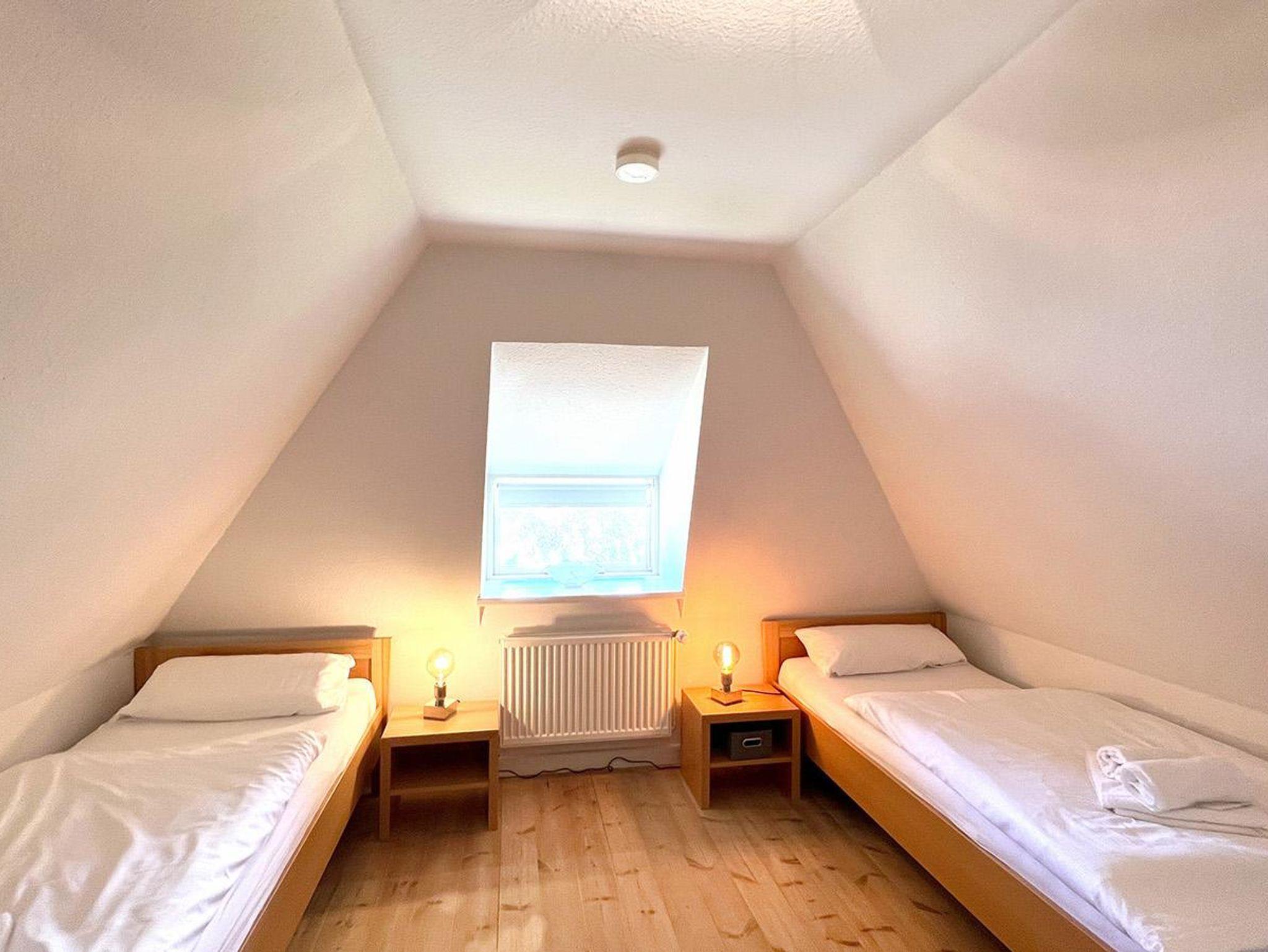 Obergeschoss: 1 Schlafzimmer mit Doppelbett, 1 Schlafzimmer mit 2 Einzelbetten, Wohndiele, Duschbad.