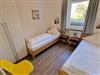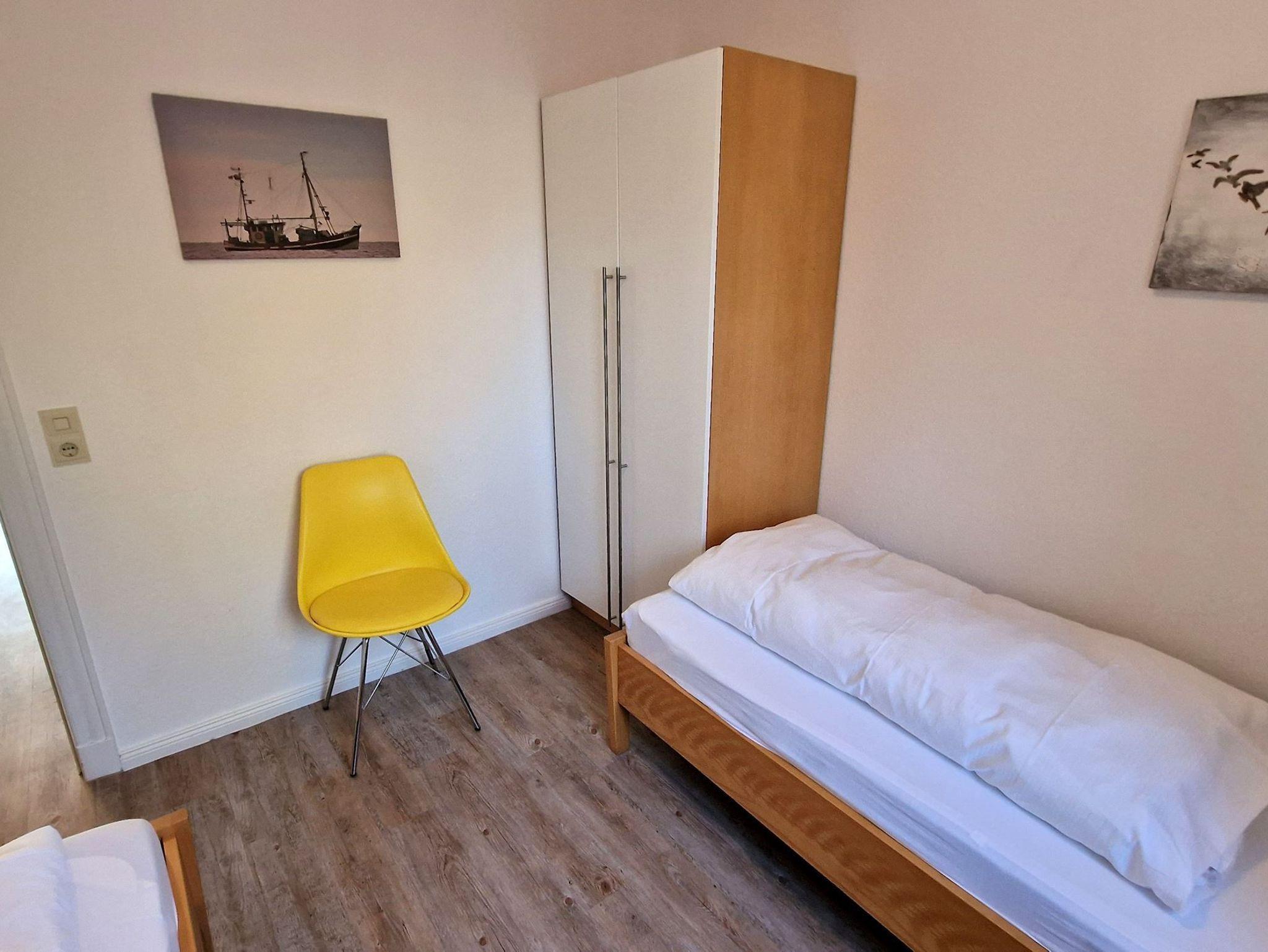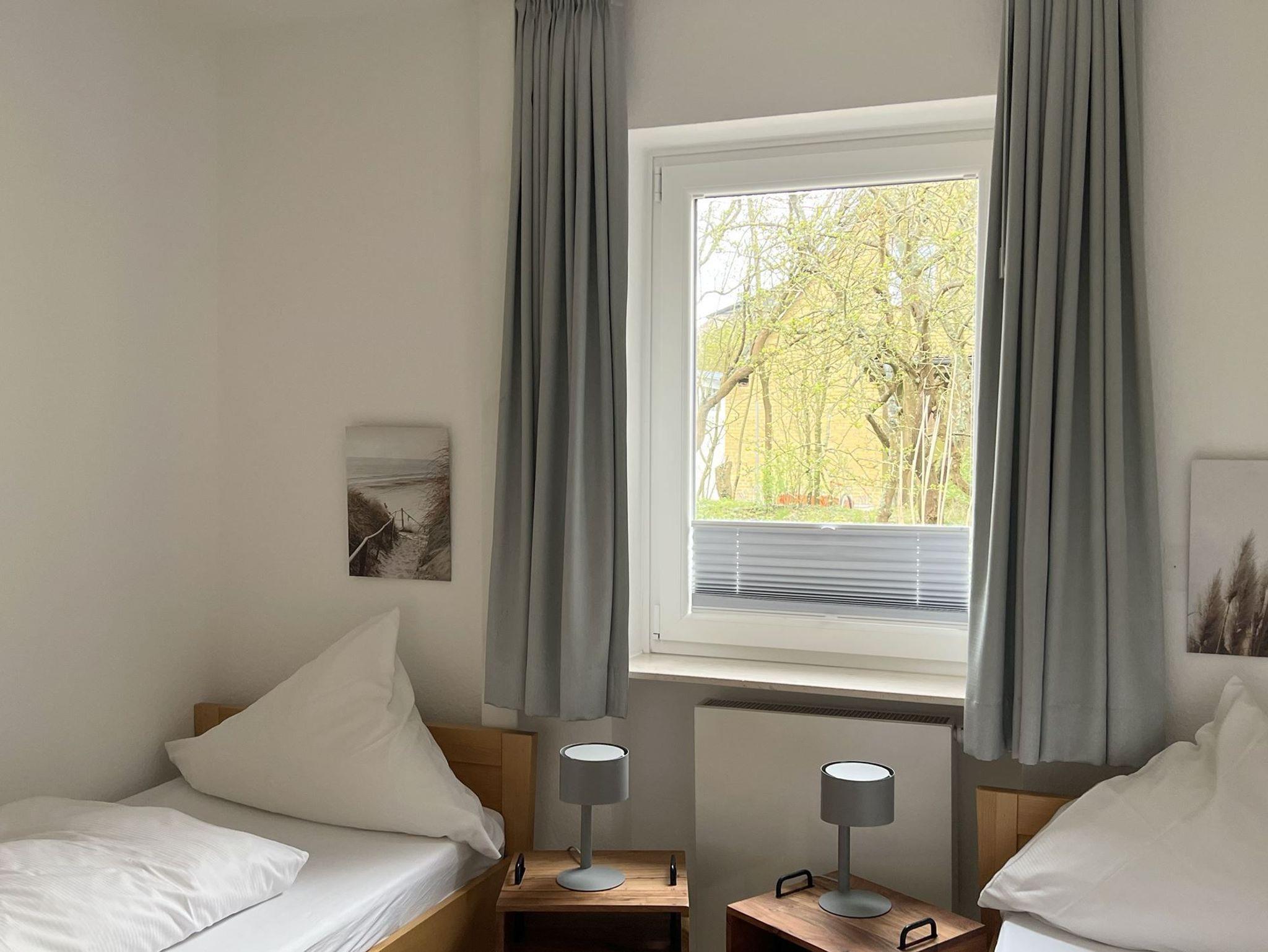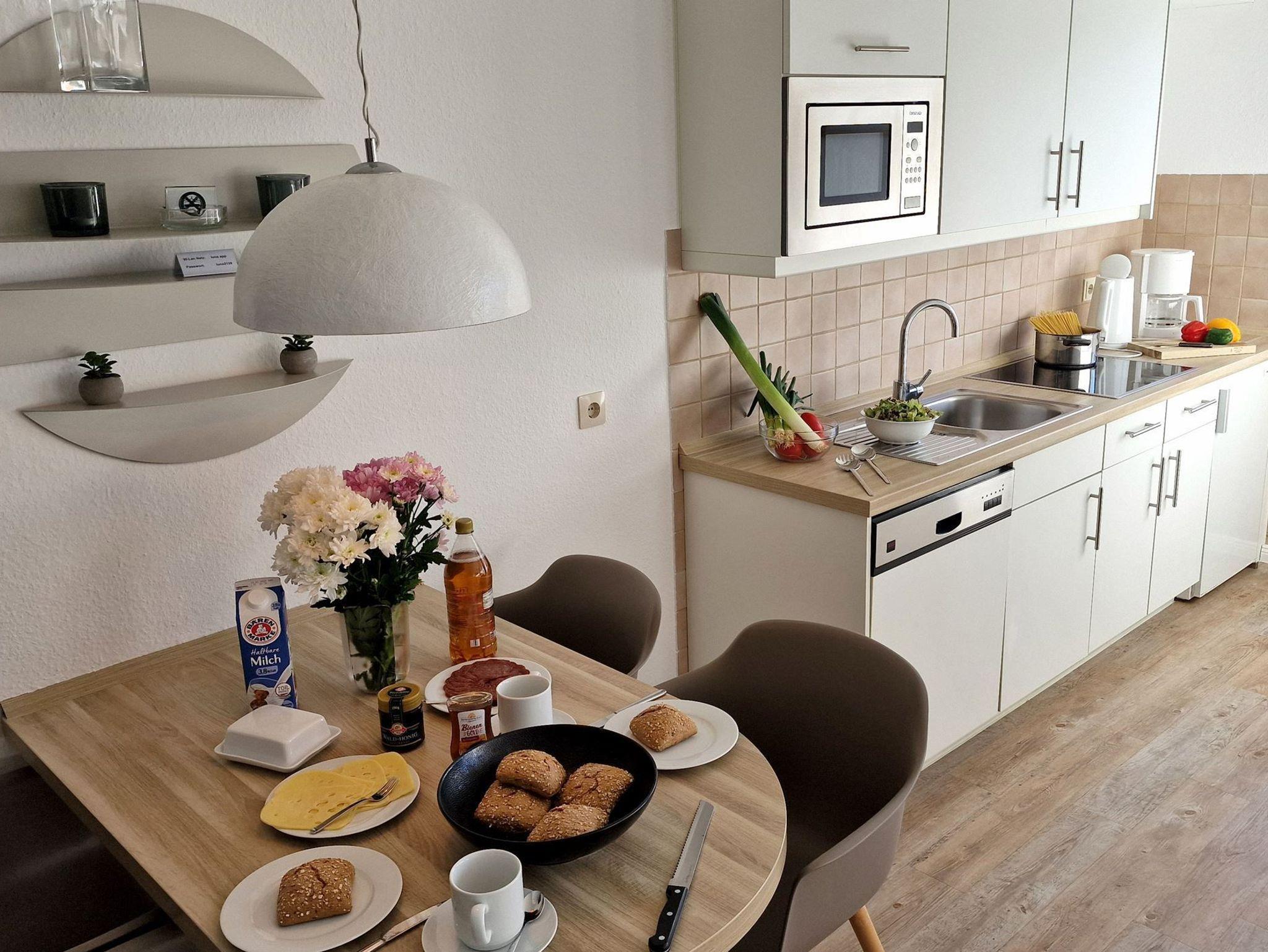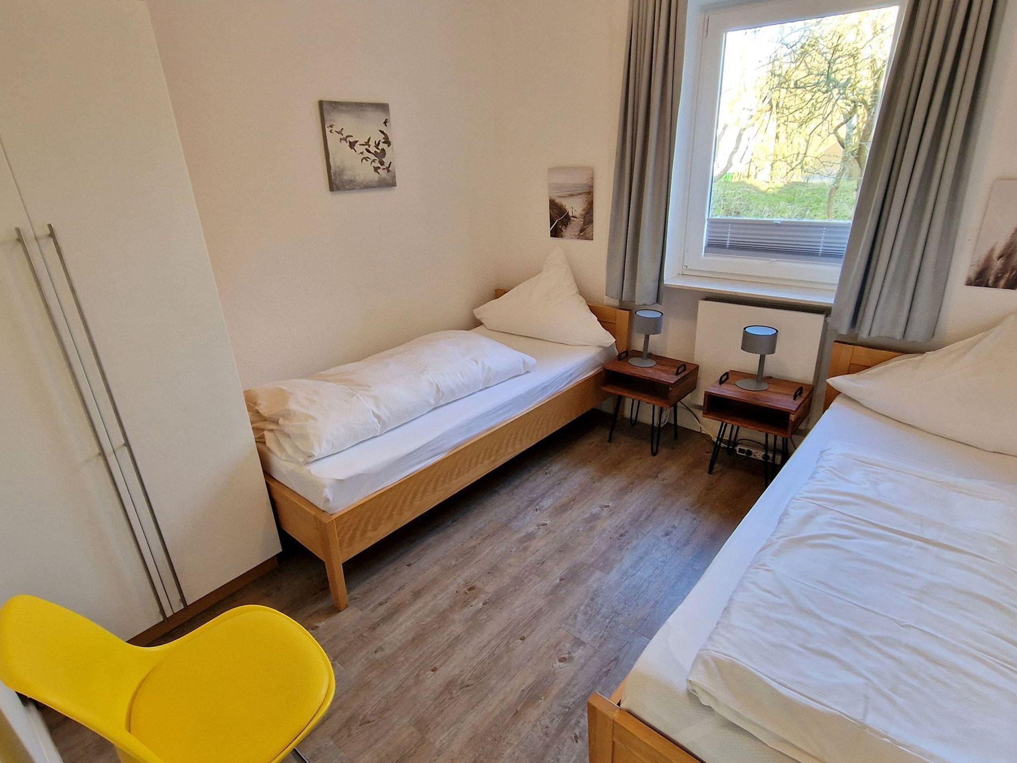 Sie teilt sich wie folgt auf: Eingangsdiele mit Garderobe, Schlafzimmer mit 2 Einzelbetten, Duschbad mit WC. Der großzügige Wohnraum mit direktem Zugang zur Terrasse und Garten überzeugt mit seiner gemütlichen Sitzecke mit direktem Blick nach draußen, moderne, weiße Küche, Essecke und als weitere Schlafmöglichkeit 1 Doppelschrankbett. Die Fußböden der Ferienwohnung sind aus Designerparkett oder Fliesen, Allergikergeeignet.
