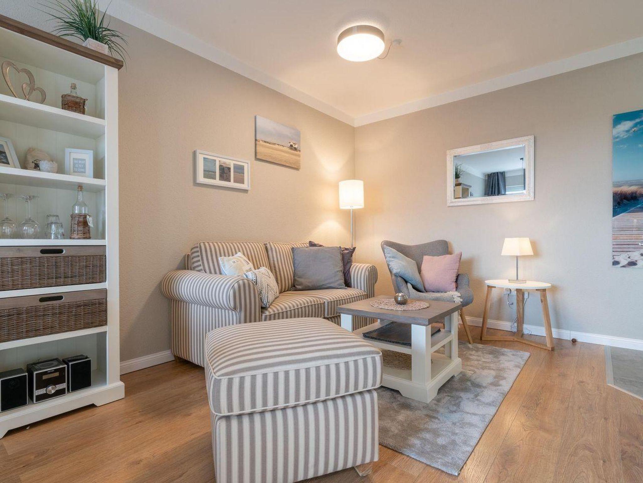 Die Ferienwohnung bietet auf 35 qm genügend Platz für 2 Personen. Das Wohnzimmer verfügt über eine Couch und Sessel des weiteren ist ein Couchtisch vorhanden. Auch ein Esstisch mit 4 Stühlen steht für Sie bereit. Die Küche ist ausgestattet mit einem Induktionsfeld, Geschirr, Kaffeemaschine, Kochtöpfe, Küchenzeile, Kühlschrank, Radio, Toaster, Minibackofen, Mikrowelle und einem Wasserkocher.