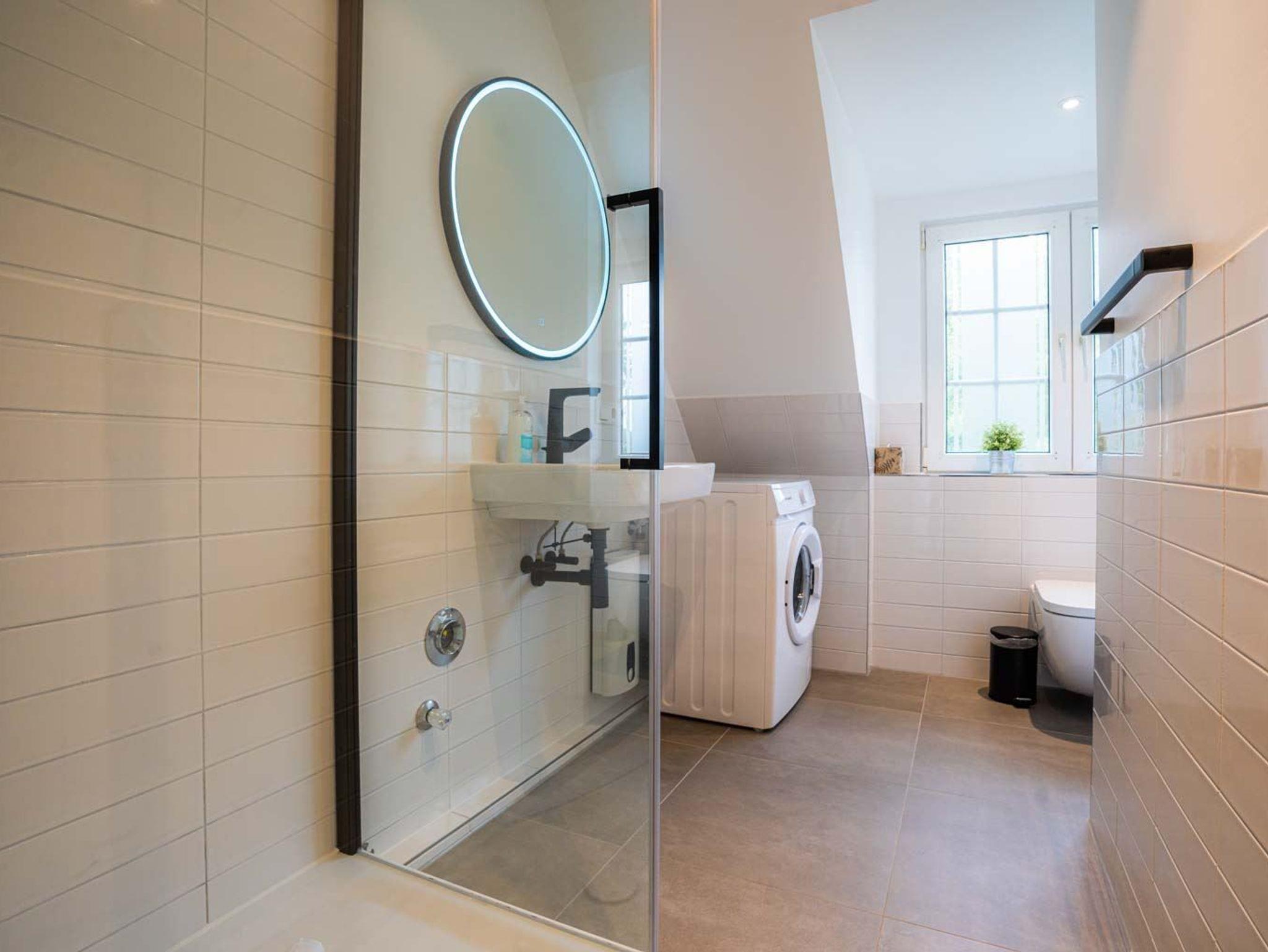 Badezimmer (Duschbad) mit ebenerdiger Dusche, WC, Waschmaschine (kostenlos), Föhn und Tageslicht.