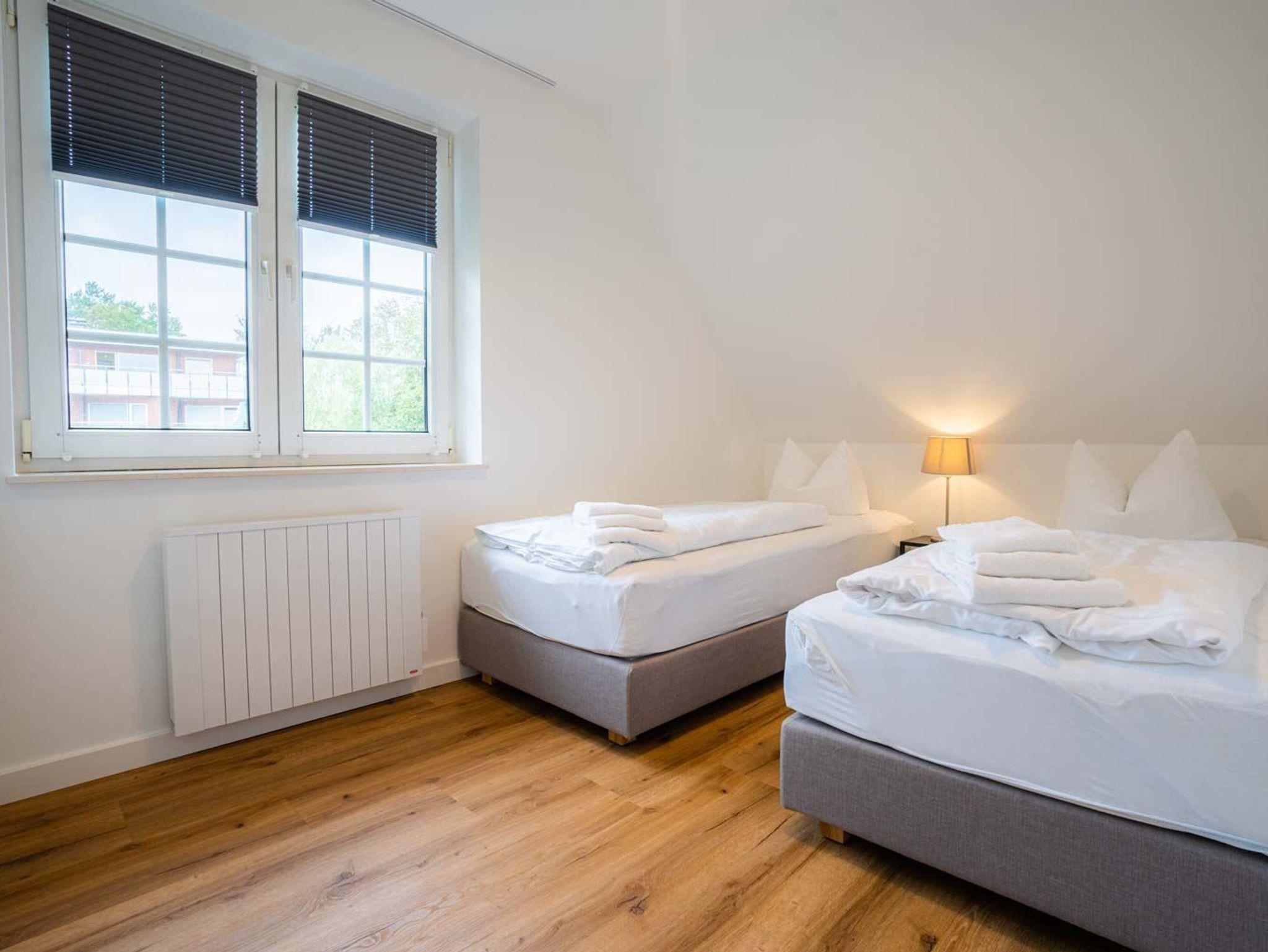 Schlafzimmer mit 2 Einzelbetten (je 90x200cm, Boxspring), Kleiderschrank und 2 Stühlen.
