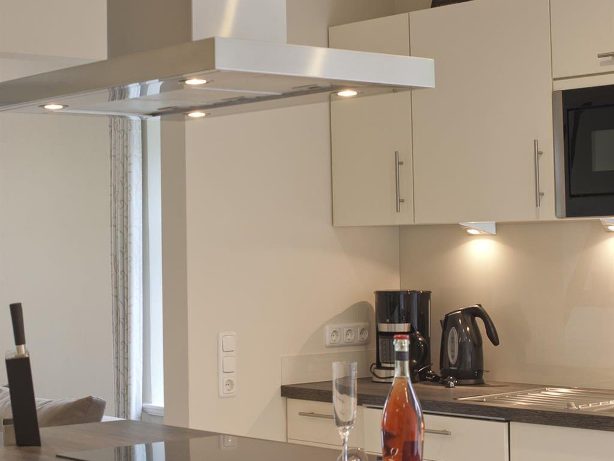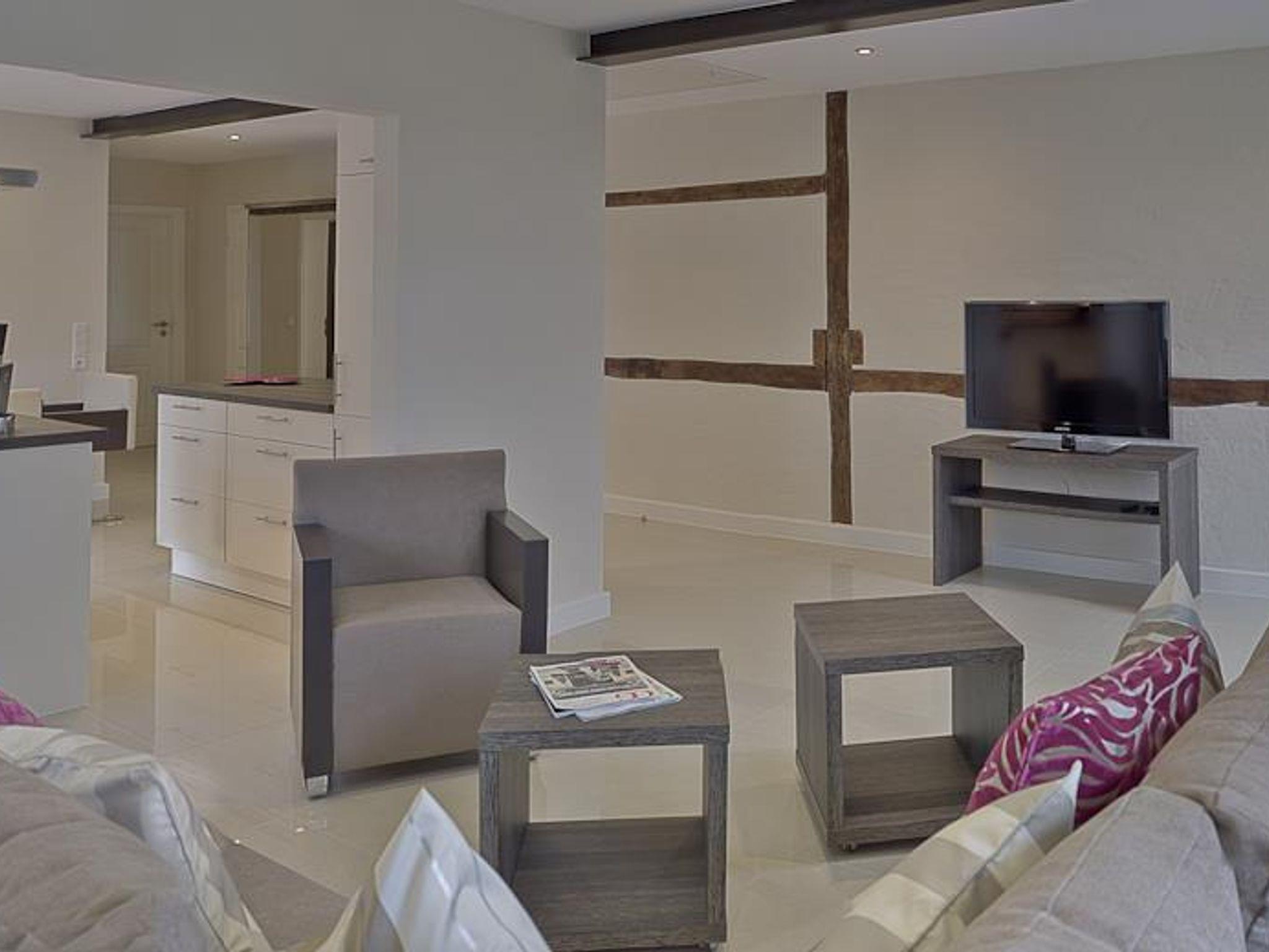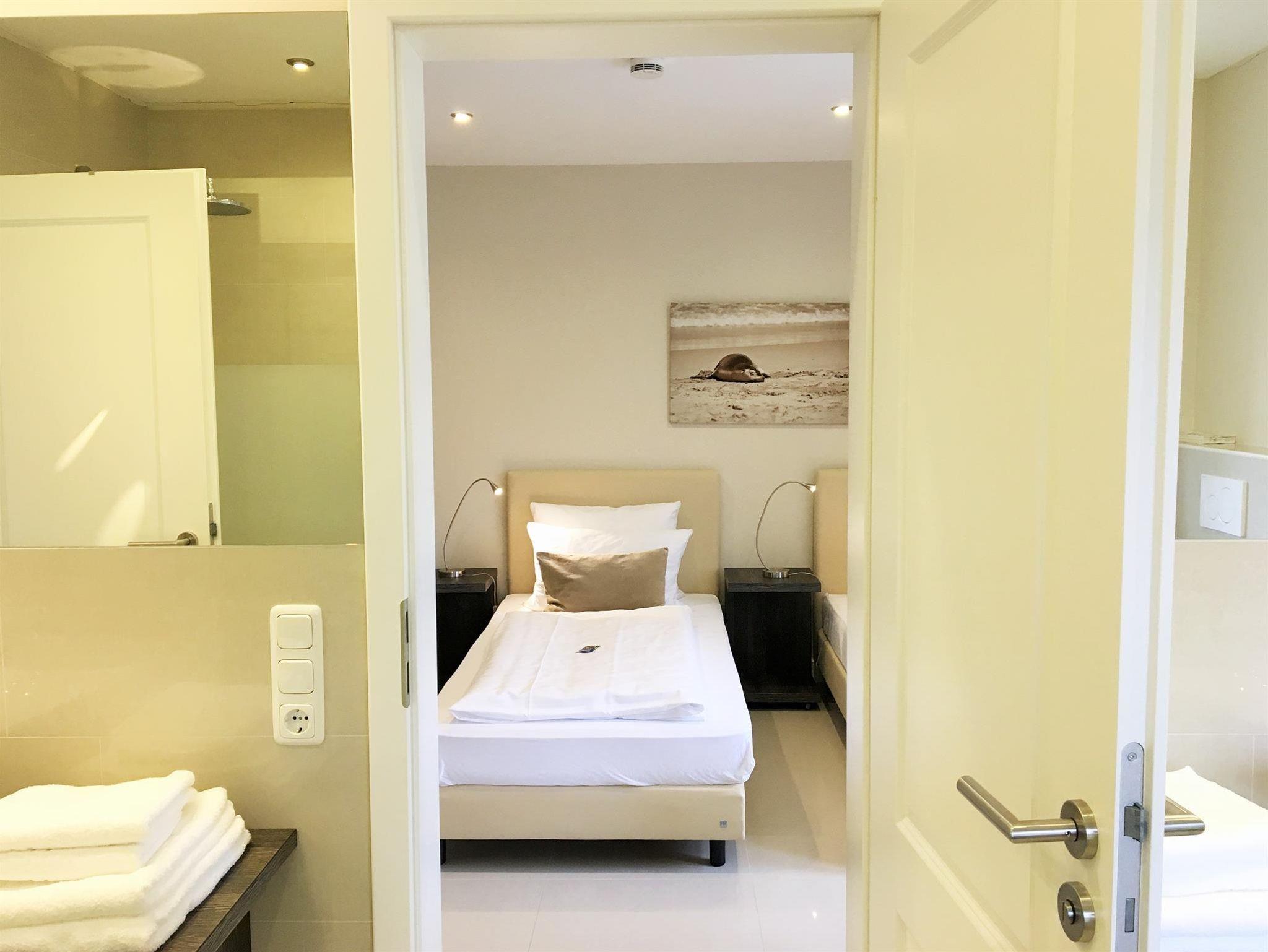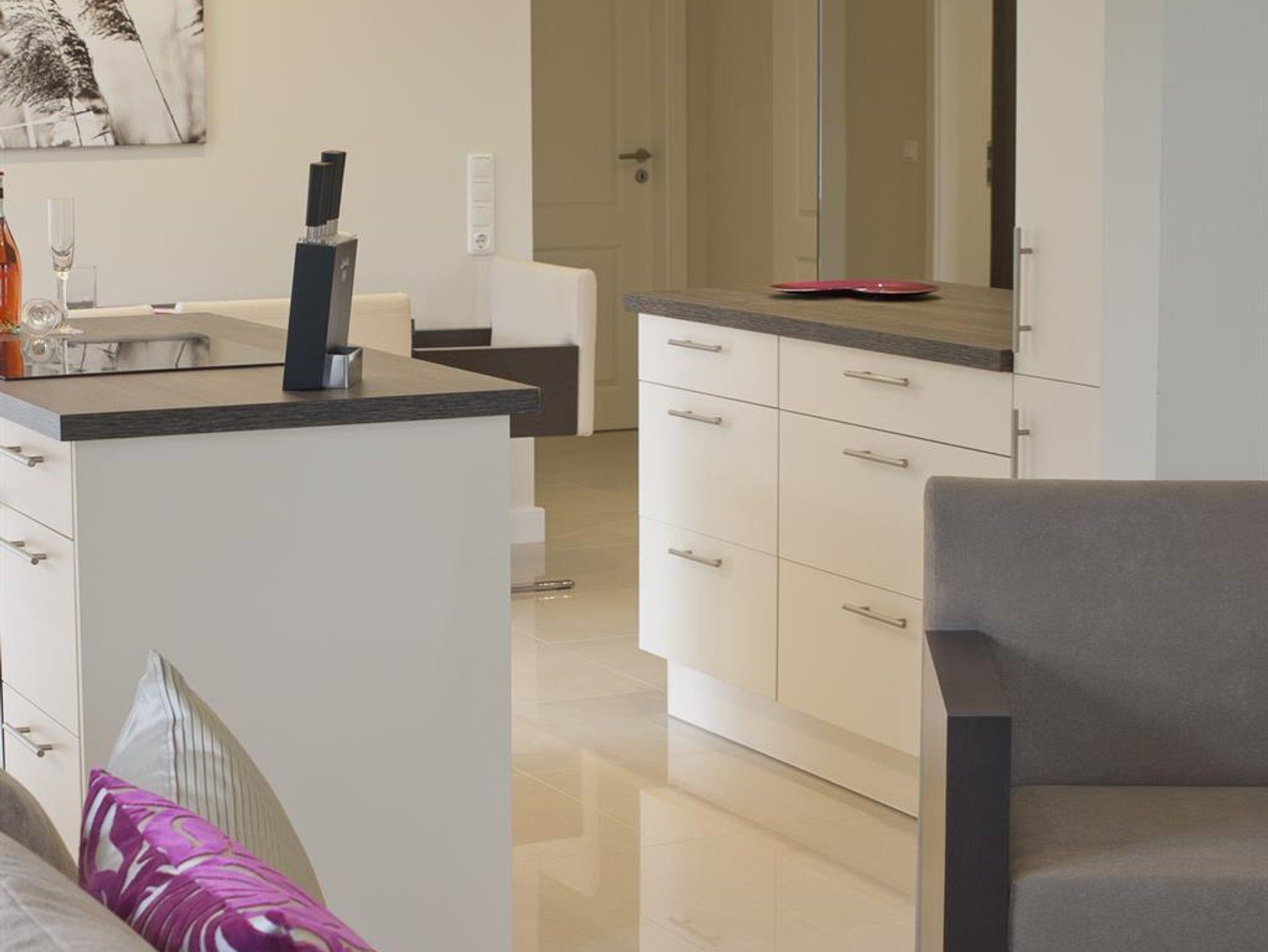 3-Zimmer Nichtraucher-Ferienwohnung für bis zu 4 Personen. Wohnzimmer mit SAT-TV und Blu-Ray/DVD-Player, Musikanlage mit CD-Player, Radio und Dockingstation für iPod, iPad oder iPhone. Badezimmer mit Regendusche, 2 Waschtische, Fön und beleuchtetem Schminkspiegel. Gäste-WC mit Waschmaschine und Trockner. Offene Küche mit Kochinsel, Carenfeld mit Backofen, komplette Küchenausstattung (Kaffeemaschine, Wasserkocher, Toaster, Geschirrspüler, Mikrowelle, Kühlschrank mit Gefrierfach). 1 Schlafzimmer mit Doppelbett, 1 Schlafzimmer mit 2 Einzelbetten und Schreibtisch, Bügelstation und Laptop-Safe. Möblierter Balkon. Baby-Bett und Hochstuhl auf Anfrage. PKW-Stellplatz vorhanden. W-LAN kostenfrei verfügbar