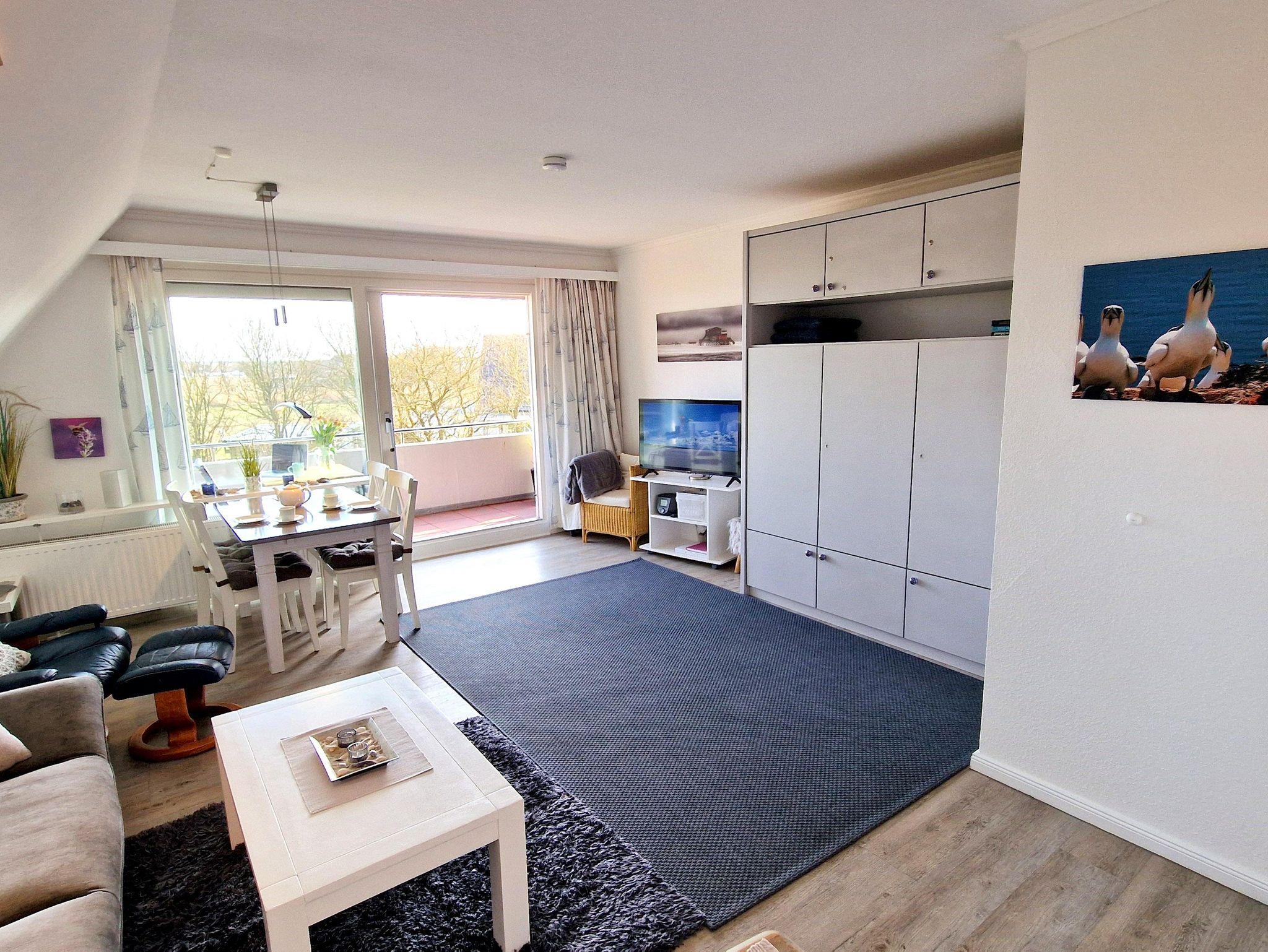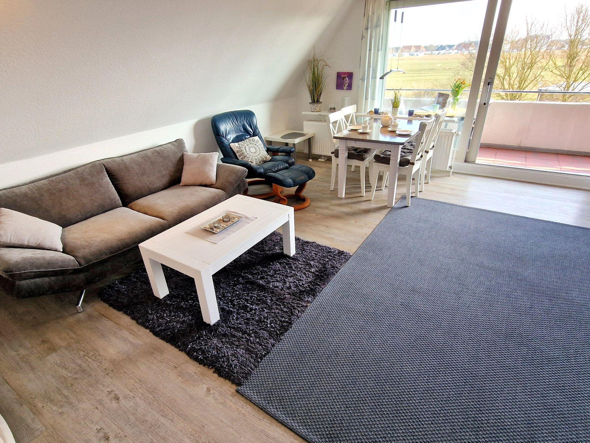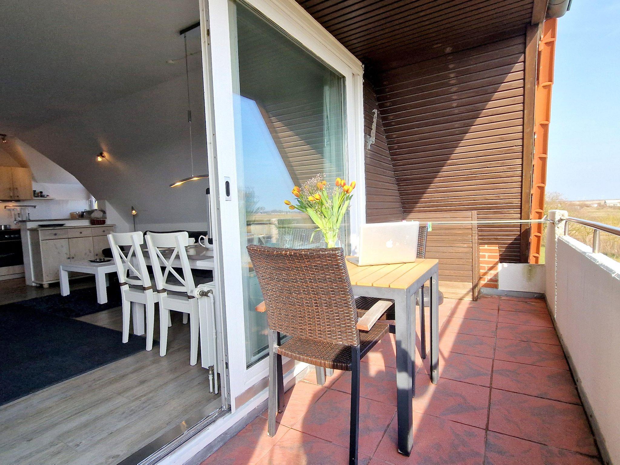 In der 2-Zimmer Nichtraucherwohnung haben bis zu 3 Gäste Platz. Von dem großen Südbalkon hat man einen weiten Blick über die Wiesen und direkt vor der Haustür ist der Deich mit den Dünen und dem Strand.