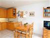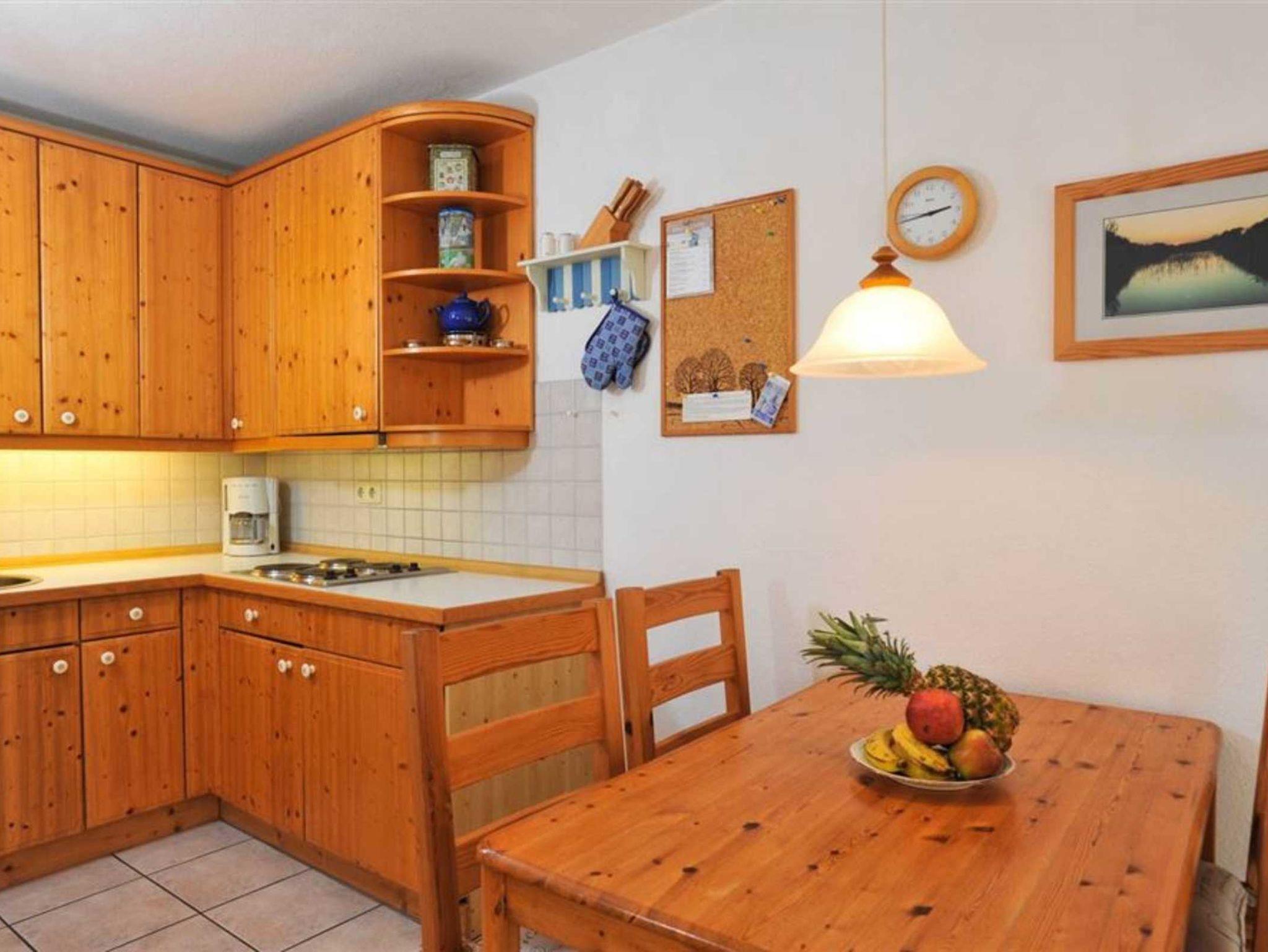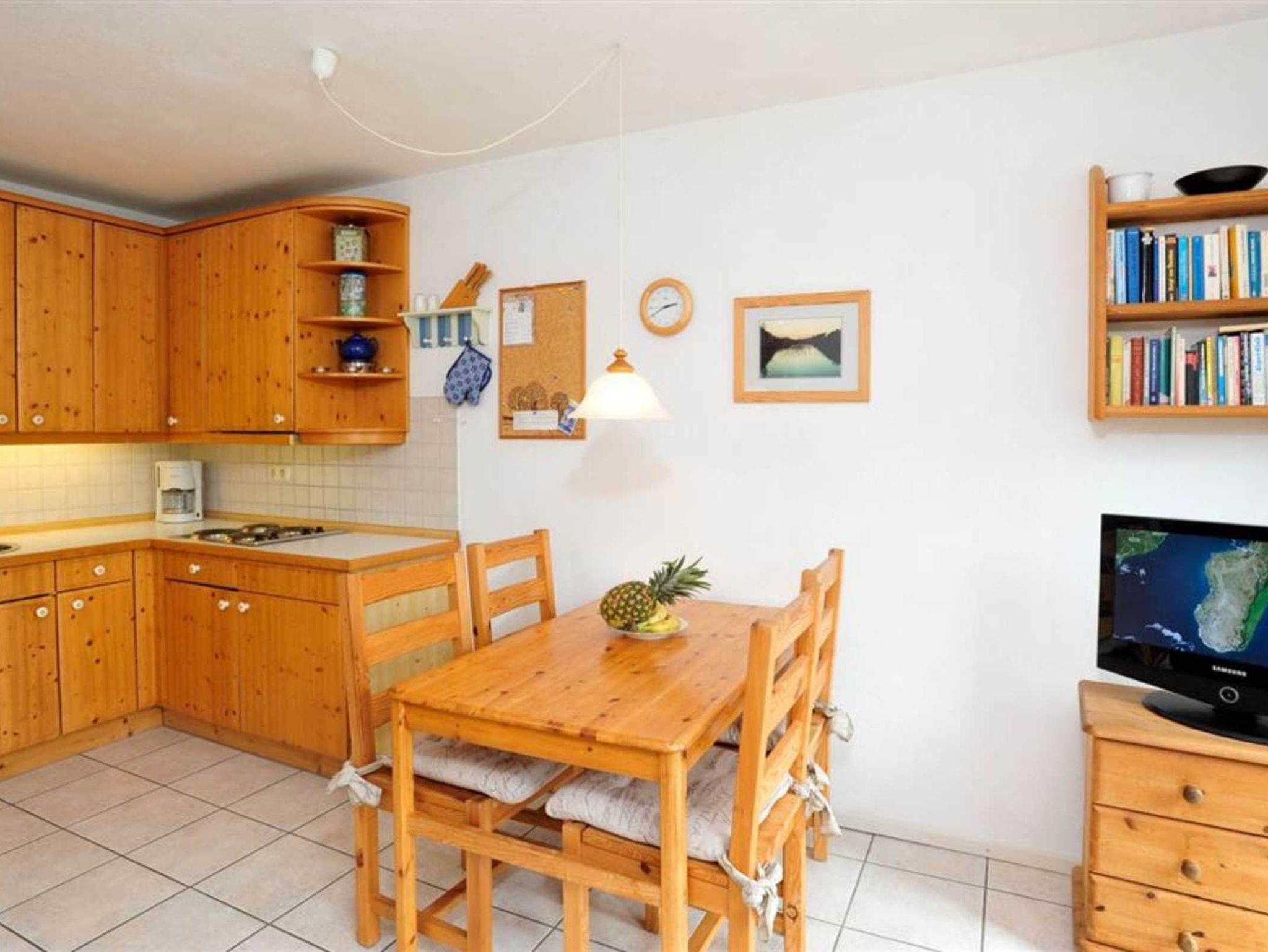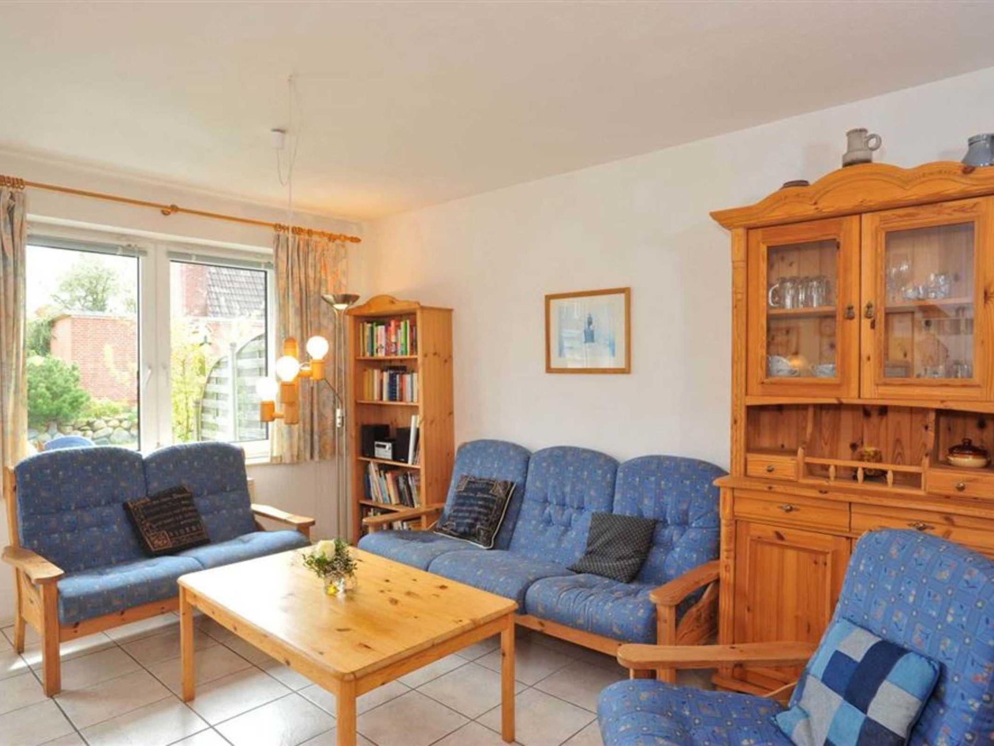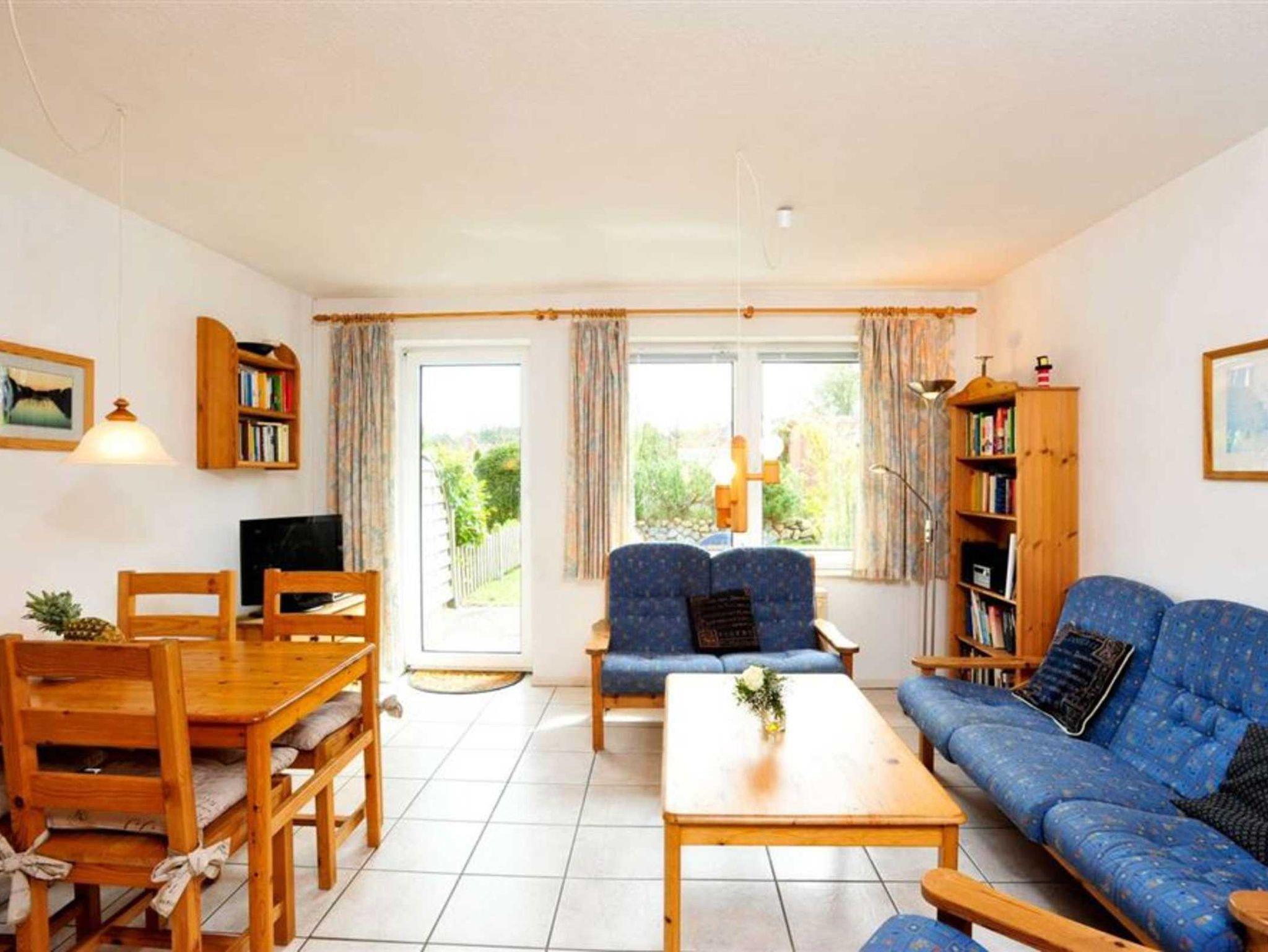 Wohnzimmer mit 2 Sofas (2er und 3er), Sessel, TV (Kabel), Radio, CD-Player und Esstisch für 4 Personen. Möblierte Südterrasse und kleiner Garten vom Wohnzimmer aus begehbar. Offene Küche mit Kühlschrank, Mikrowelle und Herd.