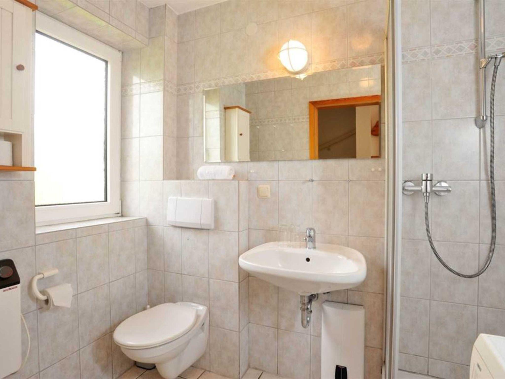 Badezimmer mit Dusche, WC, Waschmaschine und Tageslicht.