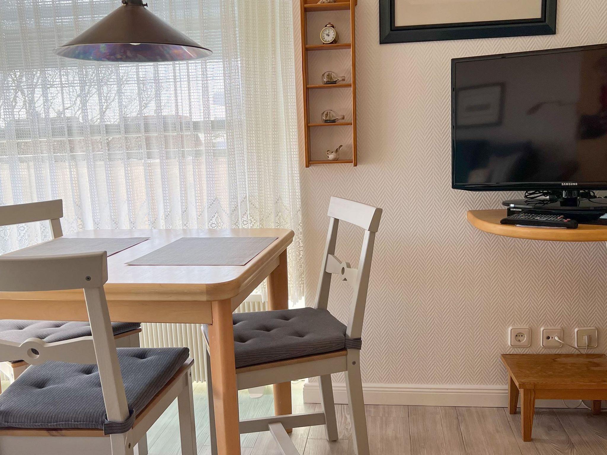 Ruhig und doch mittendrin Nis Puk Freuen Sie sich auf einen schönen Urlaub in dieser, zentral gelegenen Ferienwohnung für bis zu 3 Personen. Die Whg. Nis Puk befindet sich im Haus Hauke Haien und liegt im Herzen von St. Peter-Bad. Im Wohnbereich finden Sie ein Schlafsofa, einen Sessel mit Fußhocker und der Flachbildfernseher hat einen DVD-Player, einen CD-Player und ein Radio integriert. Durch den Wohnbereich kommen Sie auf den überdachten Eckbalkon, wo Sie nach langen Strandtagen den Tag ausklingen lassen können. Guten Schlaf finden Sie im gemütlichen Schlafzimmer mit Doppelbett, die Lattenroste sind individuell verstellbar. Ein eigener abschließbarer Fahrradraum ist vorhanden und der teilüberdachte PKW-Stellplatz Nr. 13 befindet sich auf dem Grundstück.
