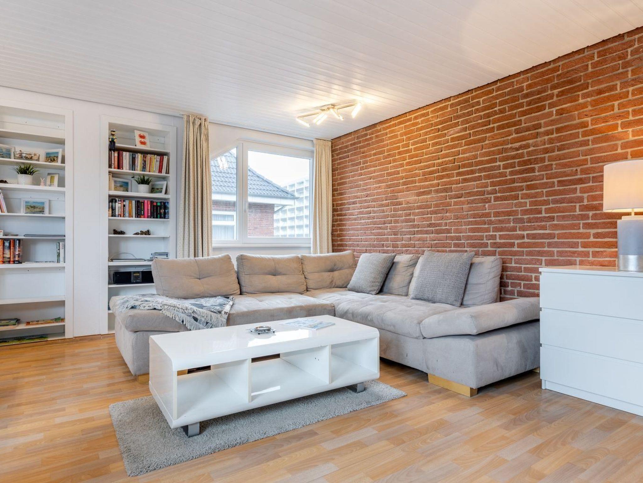Wohnzimmer mit zum Schlafsofa (140x200cm) ausziehbarem Ecksofa, SMART-TV (Kabel), Stereo-Kompaktanlage, Spiele- und Büchersammlung und Esstisch mit 4 Stühlen. Direkter Zugang zum möblierten Loggia-Balkon nach Südwesten mit kleinem Meerblick und Bartisch mit Barstühlen.