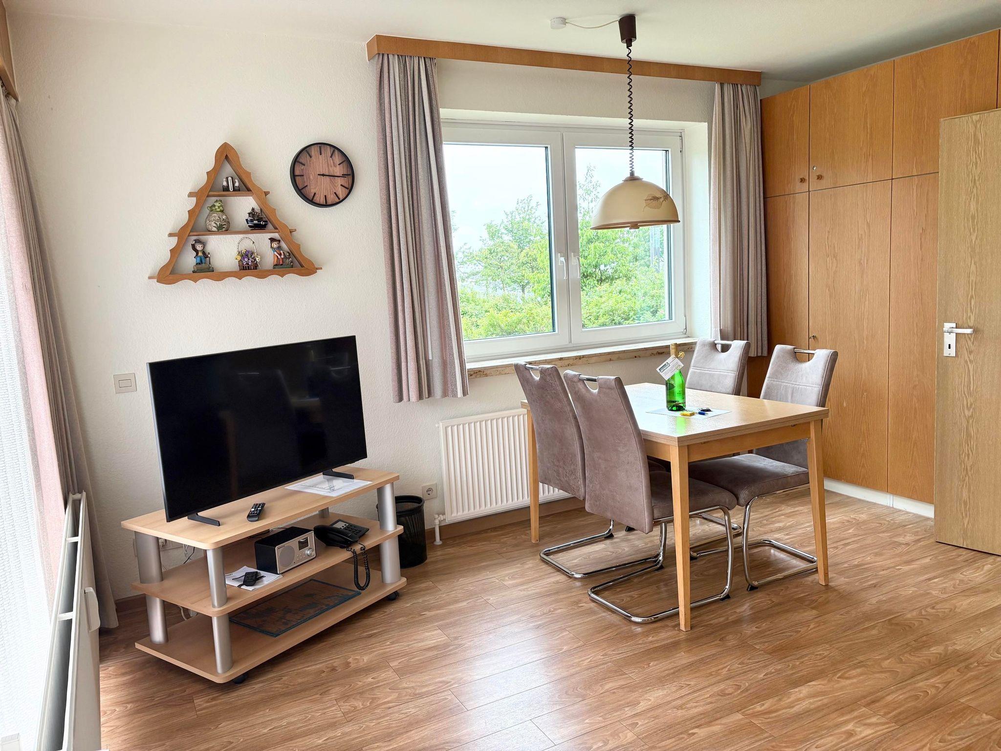 Schlafraum mit 2 Einzelbetten (je Bett 1,90 x 90), Wohn-Schlafraum mit Doppel-Schlaf-Couch, Laminatfußboden, Essecke, Küchenzeile, Kabel-TV, Durchwahltelefon, Dusche/WC,