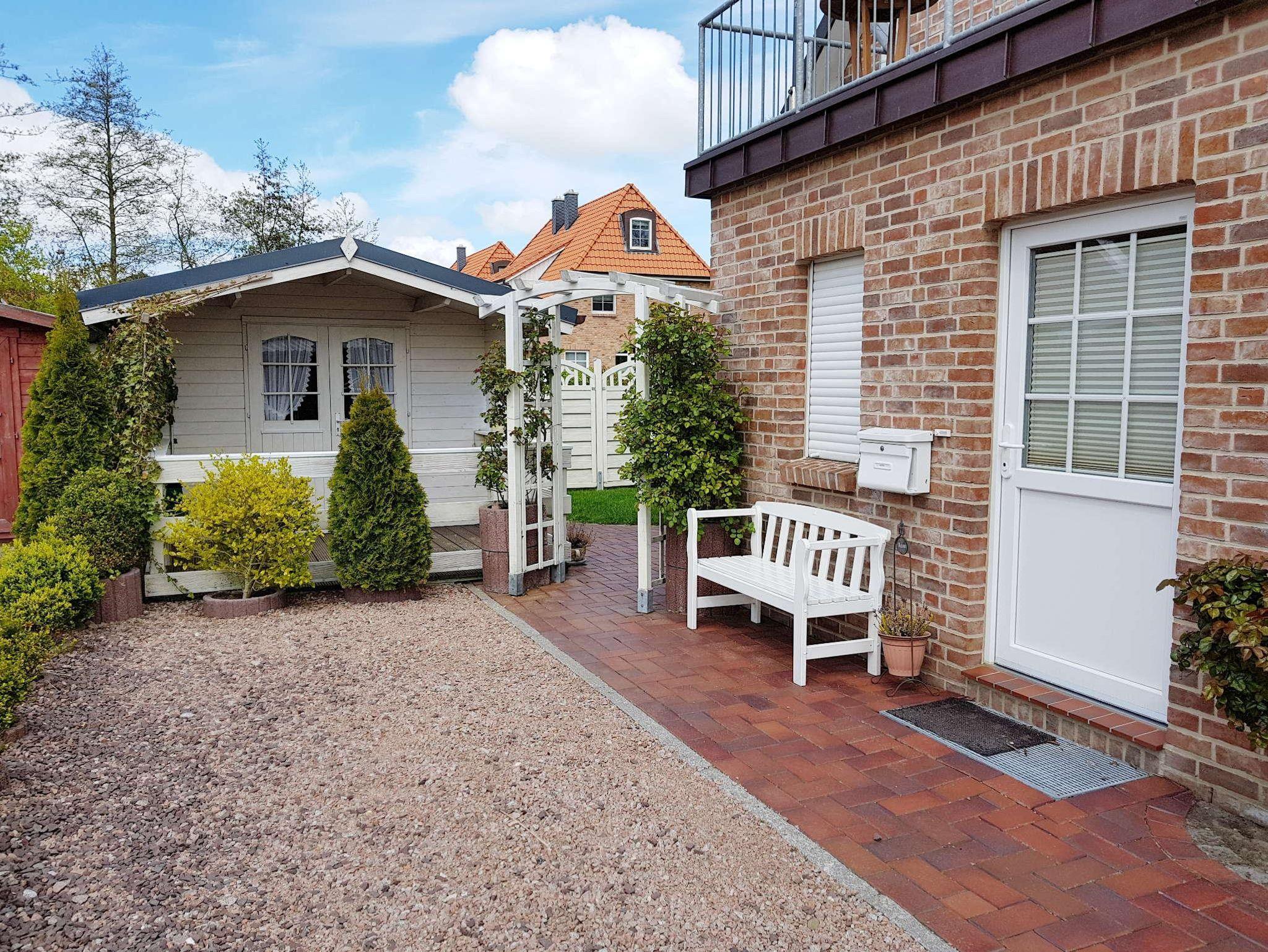 Zur Ferienwohnung gehört eine eigene Terrasse mit Zugang zum Garten. Ein kleines Gartenhaus mit Sitzecke und Grillmöglichkeit steht zur Verfügung.