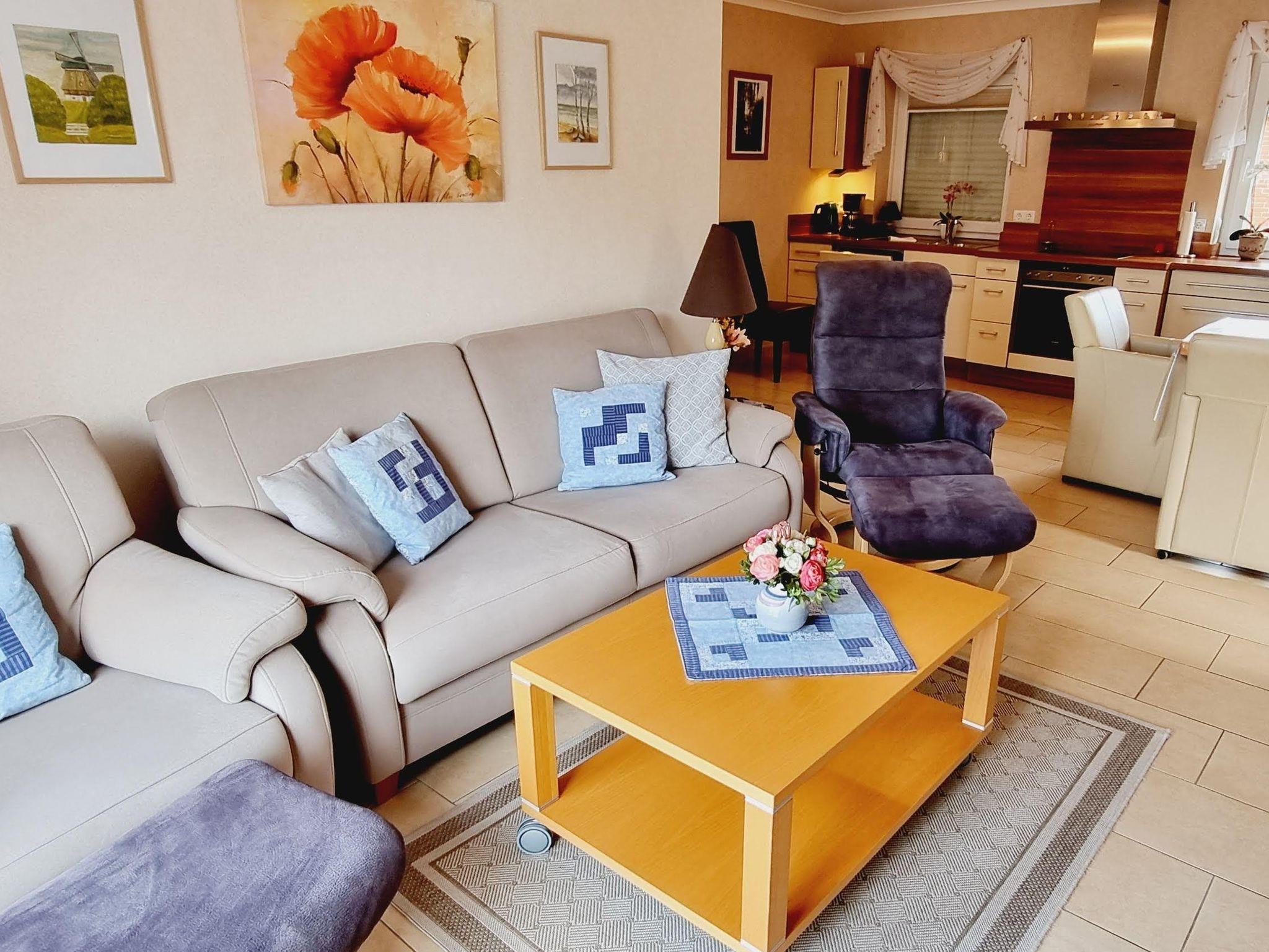 Besondere Merkmale: Ein schöner Kaminofen und eine gemütliche Sitzecke sorgen im Wohnzimmer für behagliche Atmosphäre und Entspannung nach langen Spaziergängen am Strand. Eine Außenjalousie zur Verdunklung ist im Objekt verfügbar.