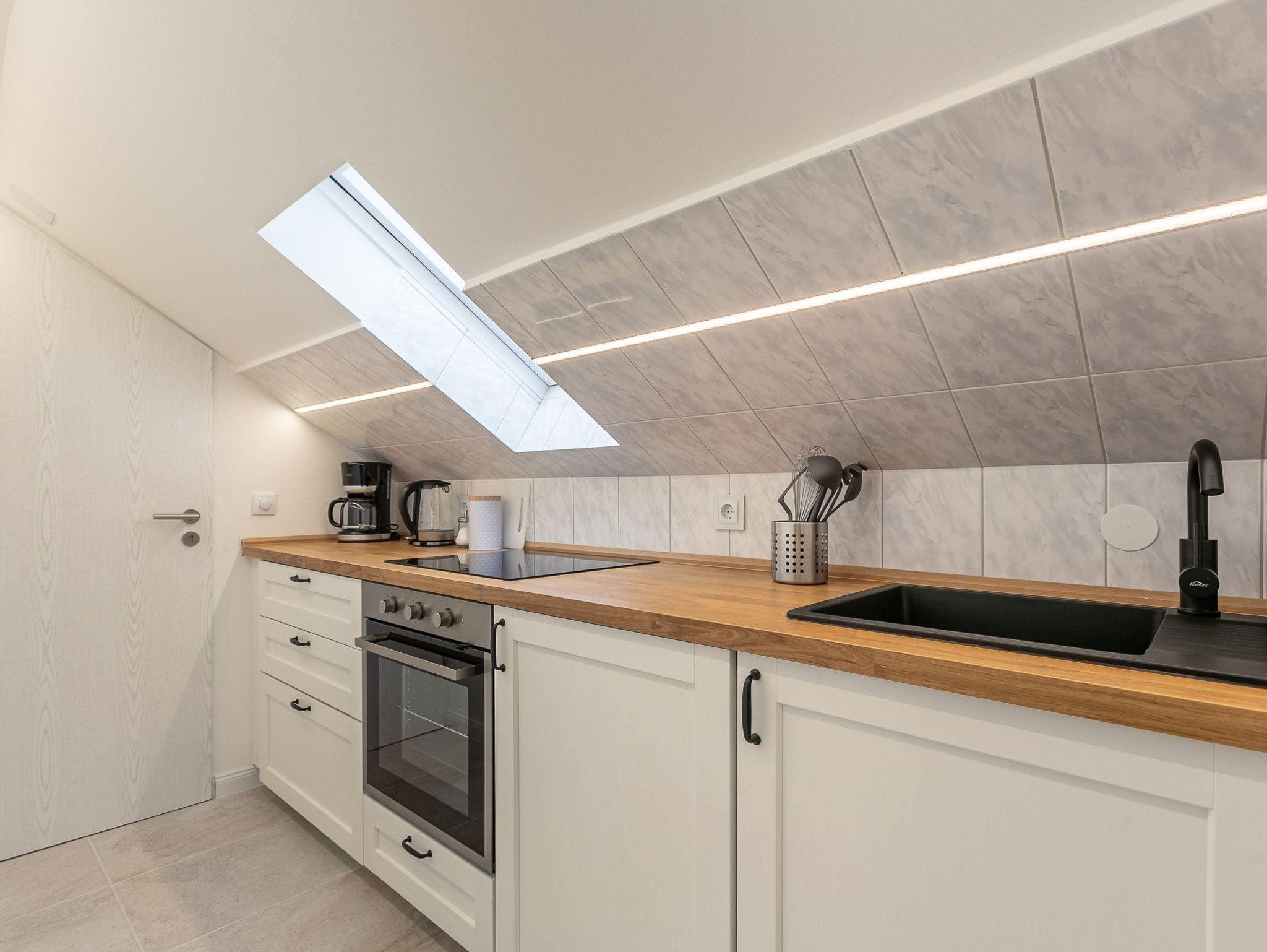 Wohn- und Schlafzimmer mit franz. Doppelbett (140x200cm), Kleiderkommode, Sofa, kleinem Esstisch mit 2 Stühlen und SMART-TV (Waipu). Separate Küche mit Herd mit 4 Induktionsfeldern und Kühlschrank mit Gefrierfach.